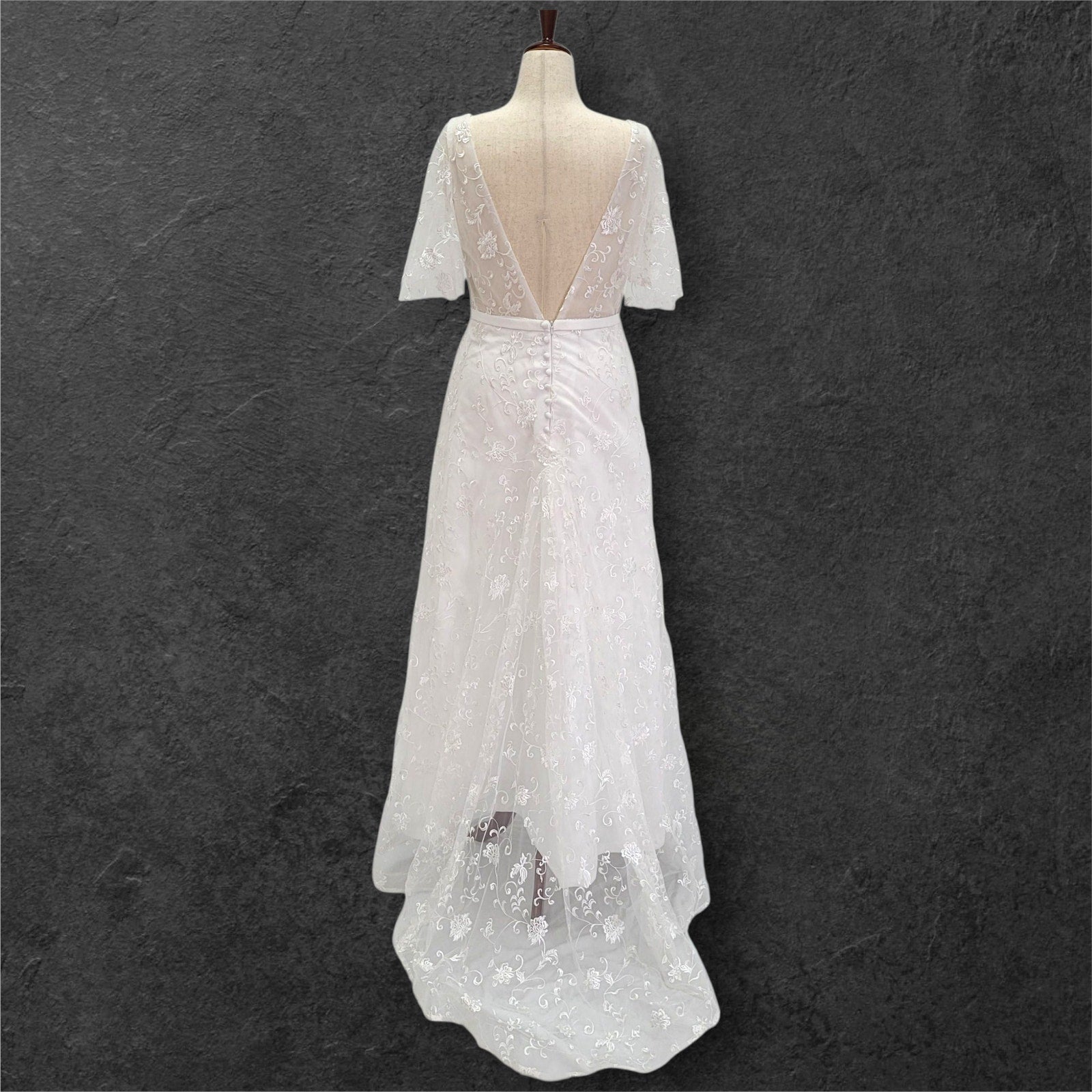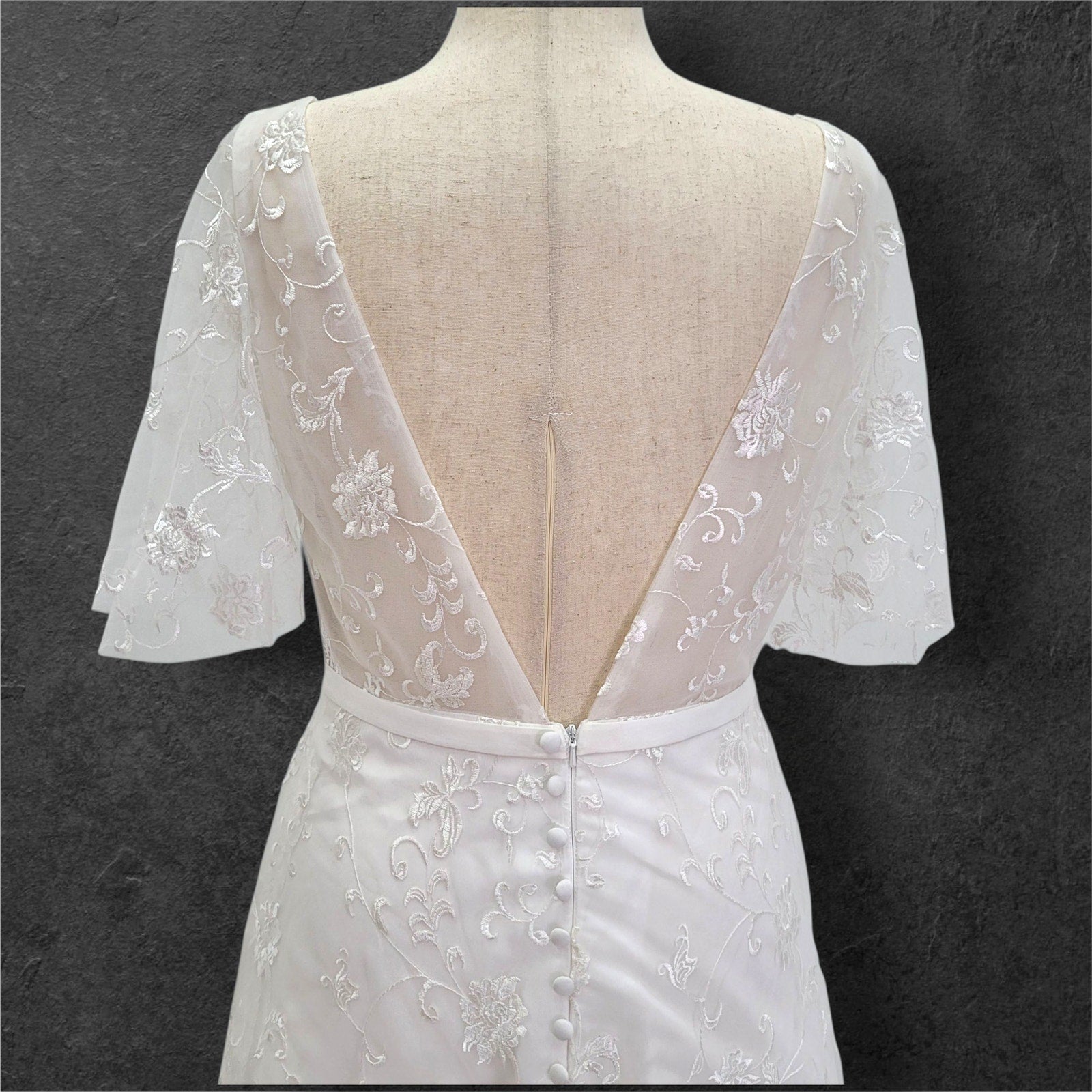 A Line Wedding Dress with Trumpet Sleeves and V Back