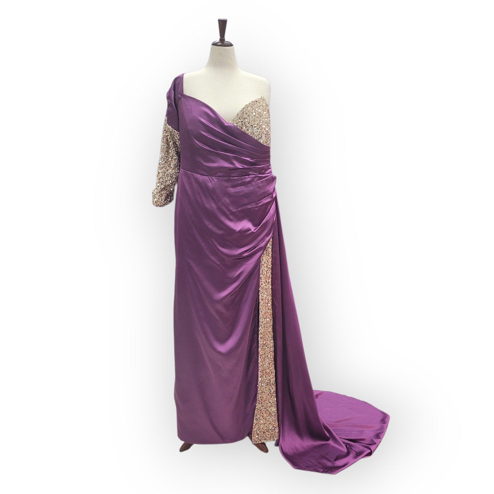 Asymmetric Purple Gown with Gold Sequins and Side Train