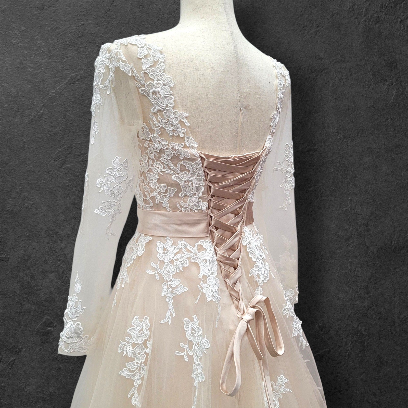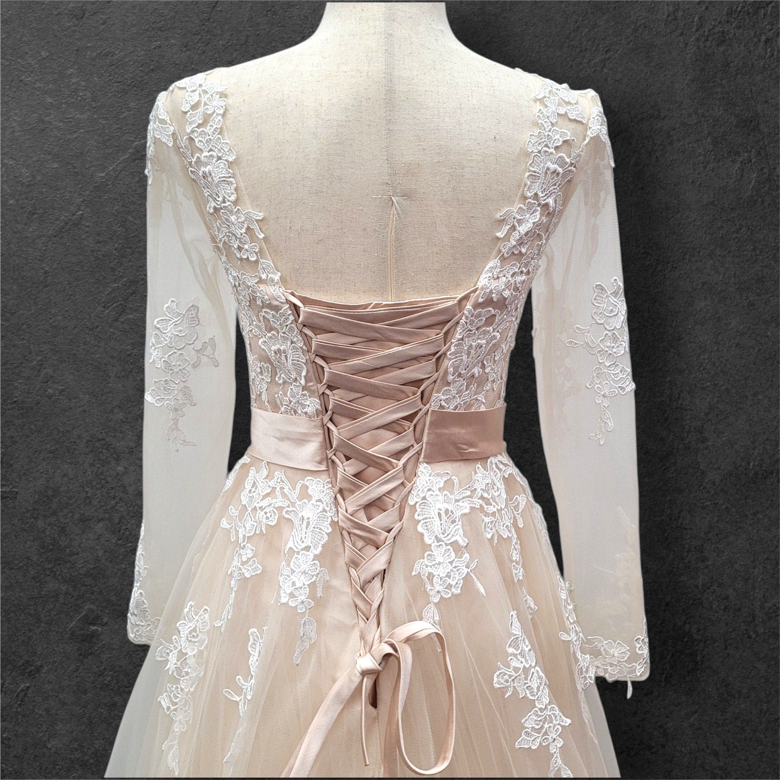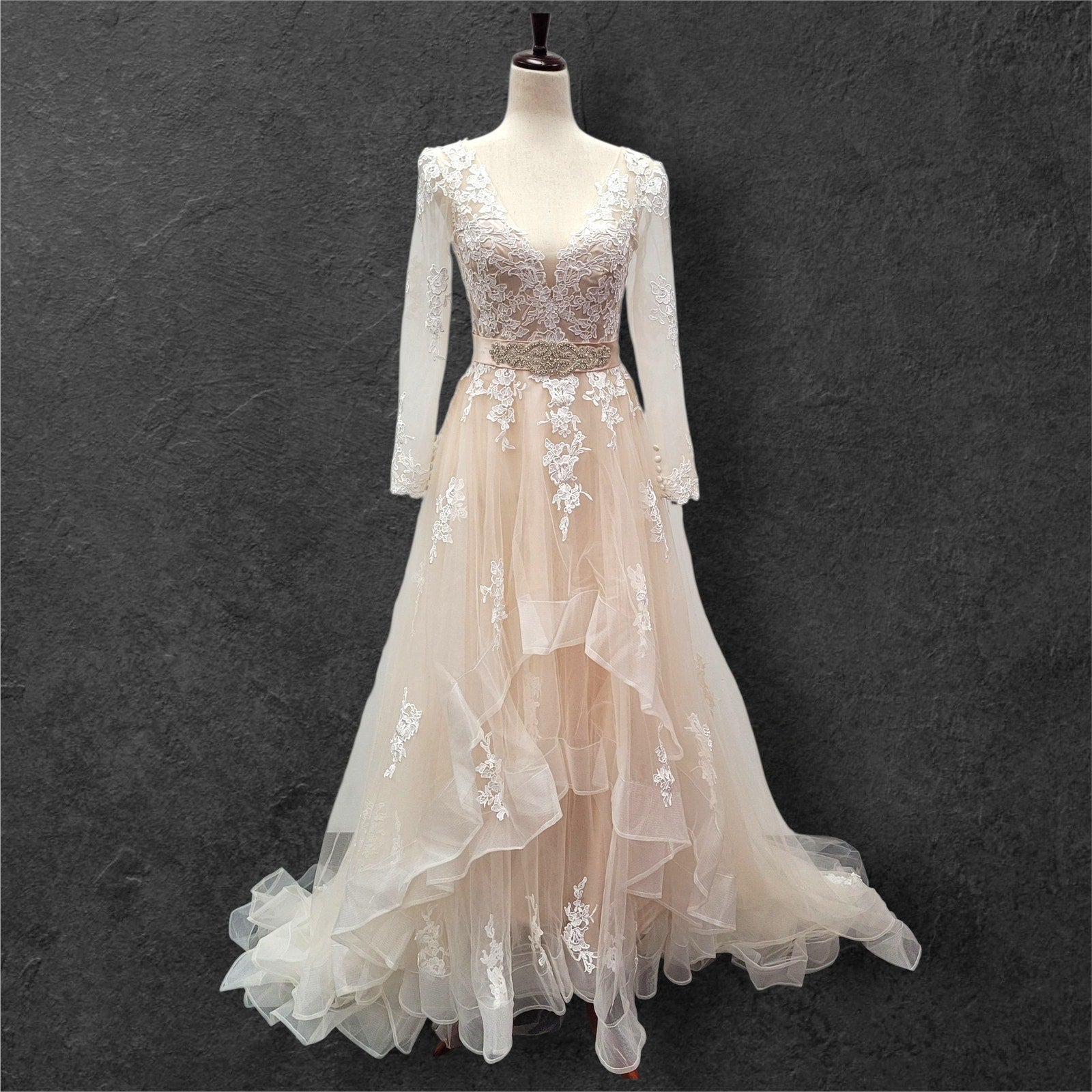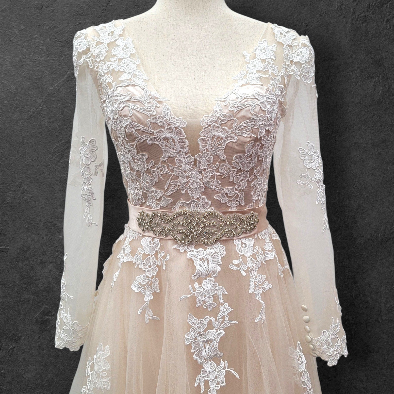 Exquisitely crafted ballgown wedding dress featuring delicate floral appliques and a sophisticated v-neckline. The elegant long sleeves provide timeless appeal, while the full corset back ensures a perfect silhouette. A luxurious silver jeweled belt accentuates the waistline, creating a harmonious balance between classic romance and refined glamour. This gown embodies bridal perfection for your most treasured occasion.
