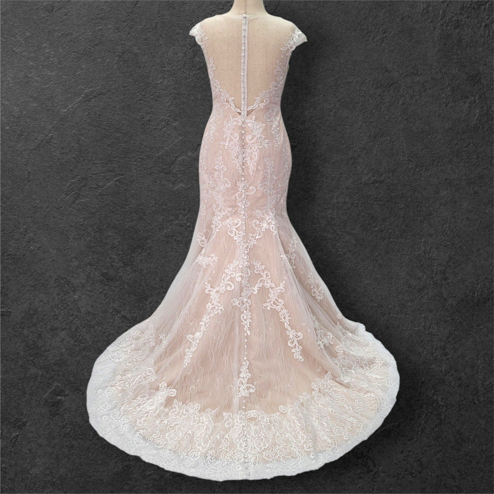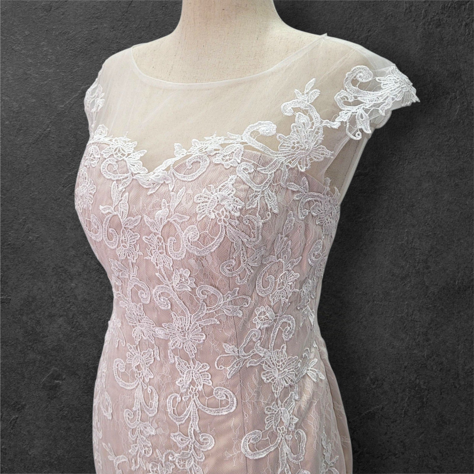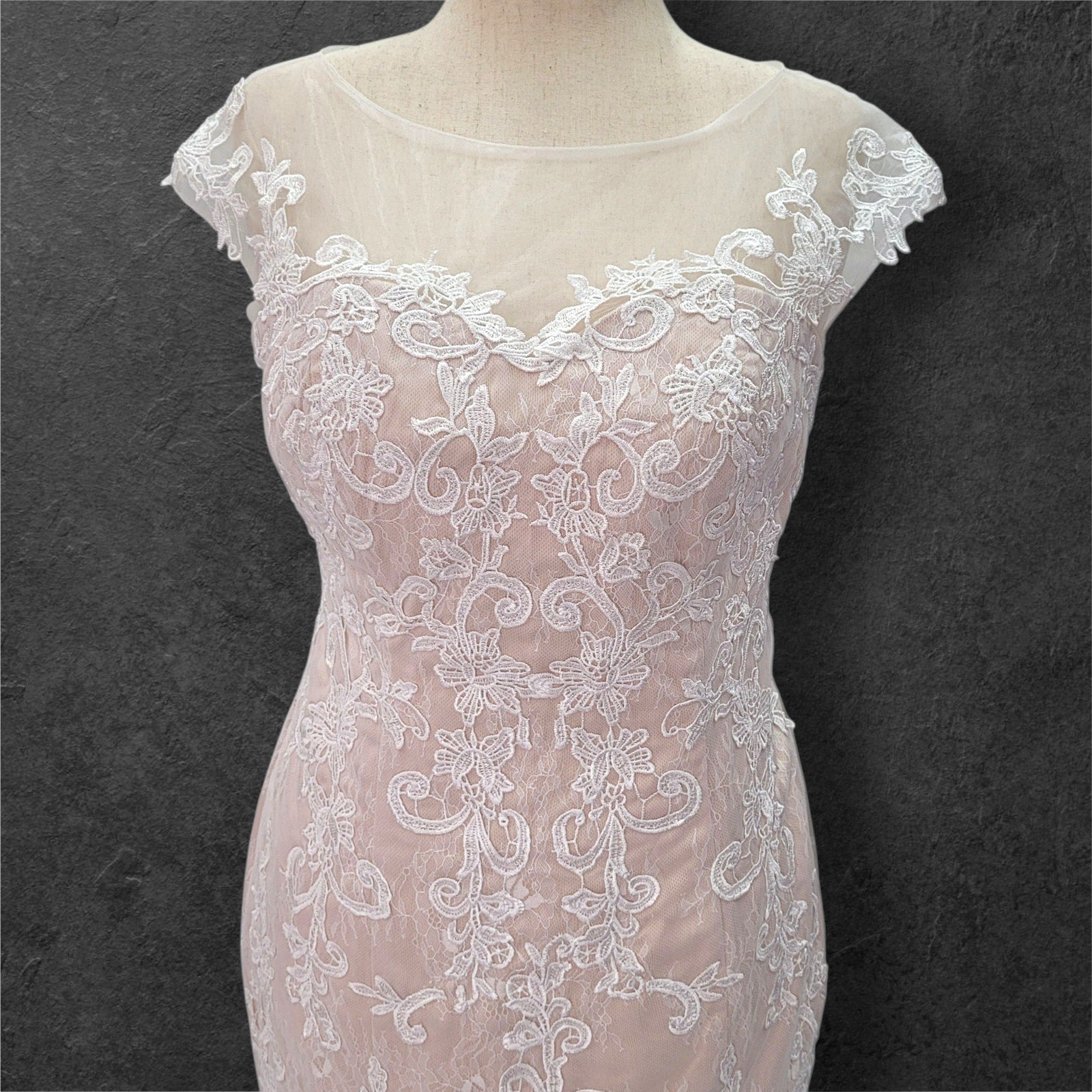 This is a gorgeous beige fit and flare wedding dress that will make you feel like a princess on your special day! The cap sleeves add a touch of elegance, while the mesh back provides a modern and alluring detail. The delicate lace overlay enhances the dress with a romantic and timeless feel. It is comfortable and flattering.