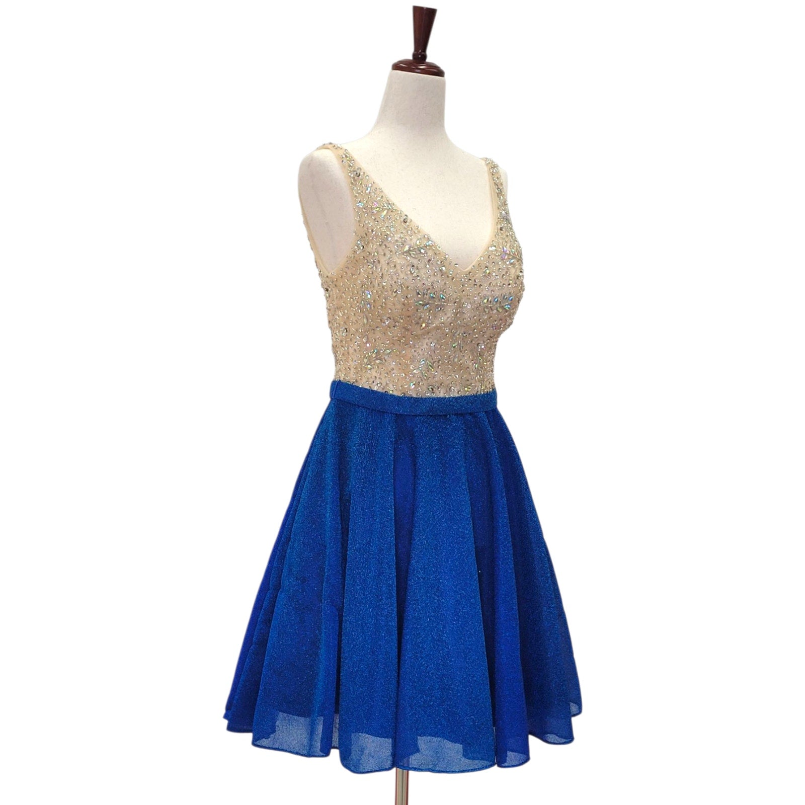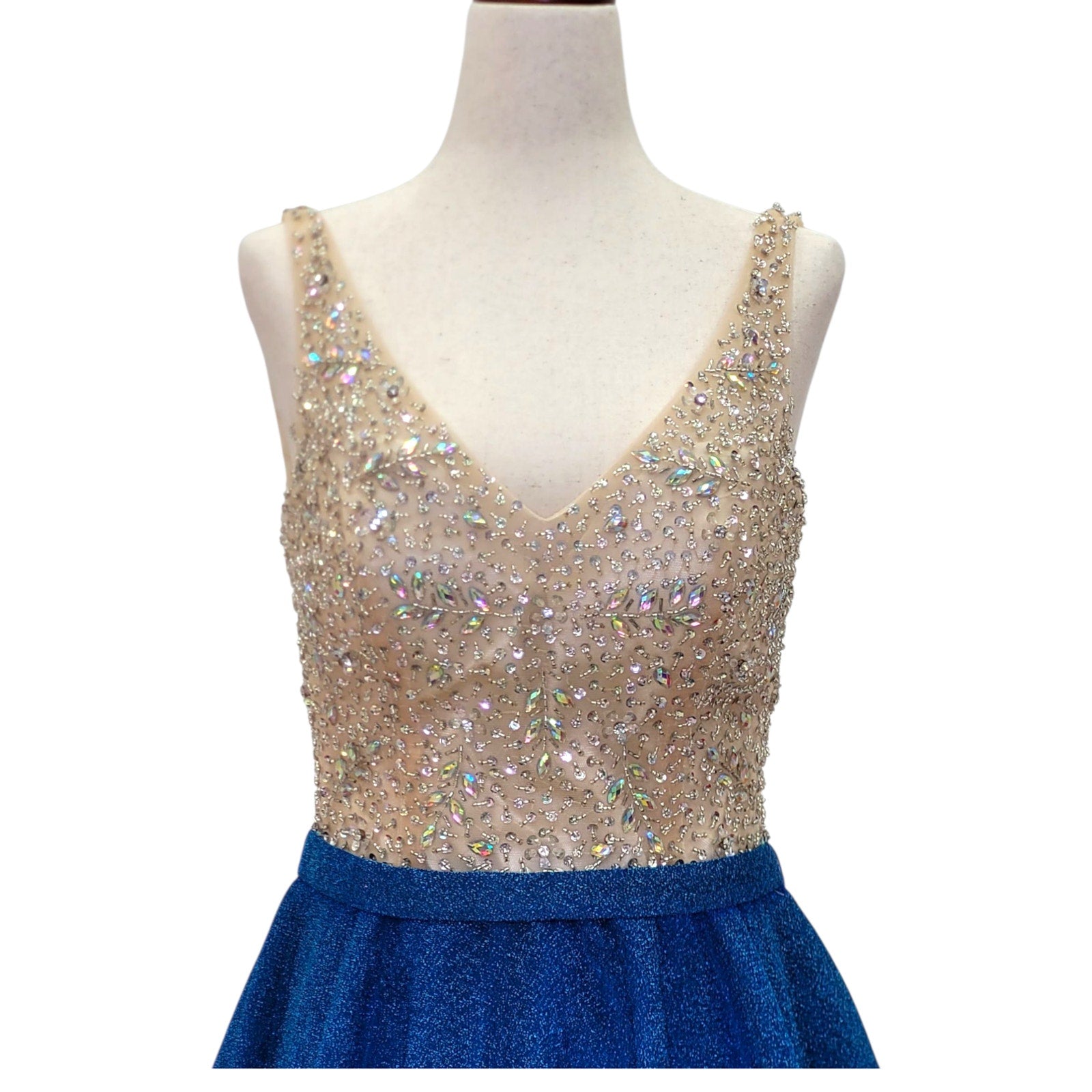 Women's short dress with blue skirt and a gold bejeweled top with a deep v neck and v back. Beautiful detailed beadwork.