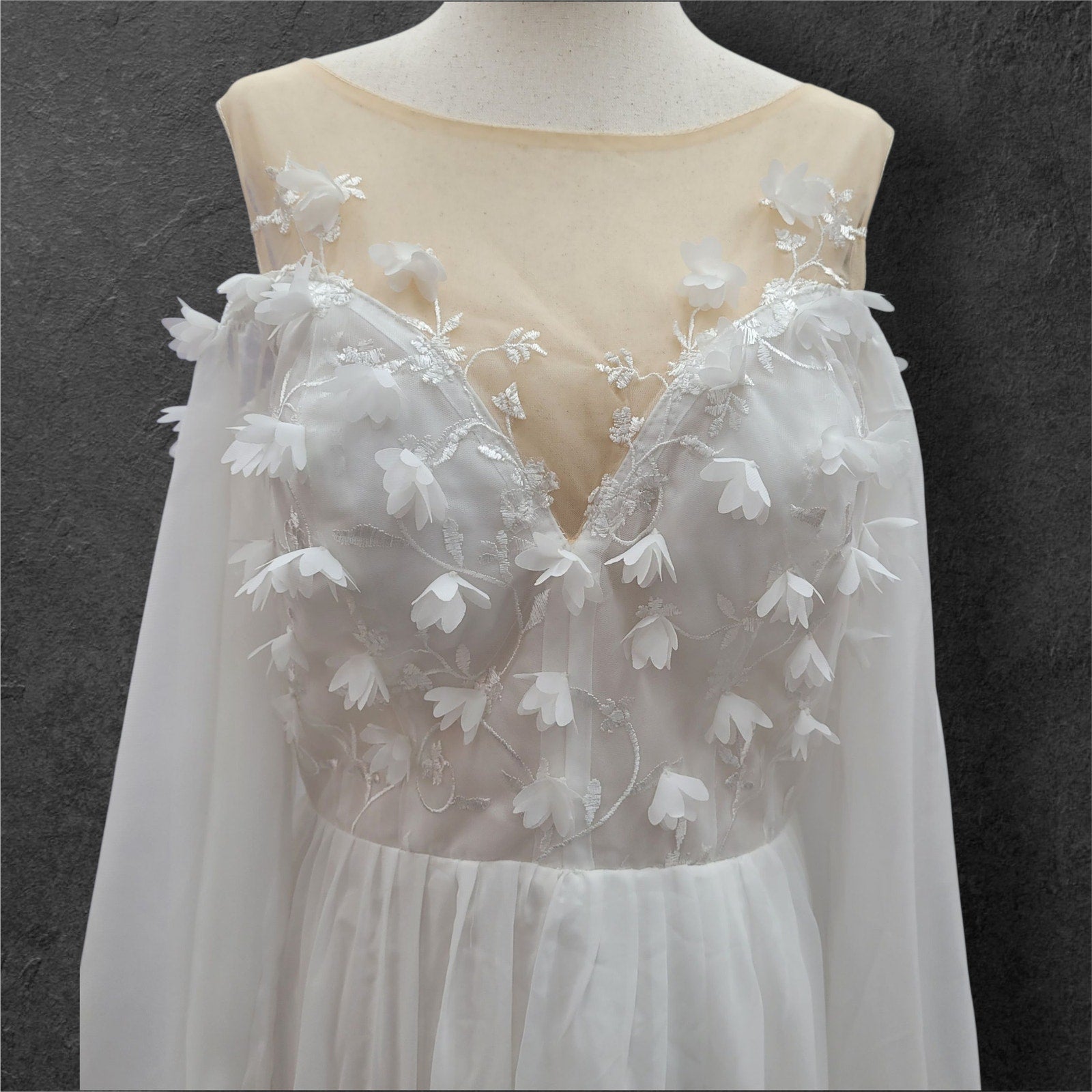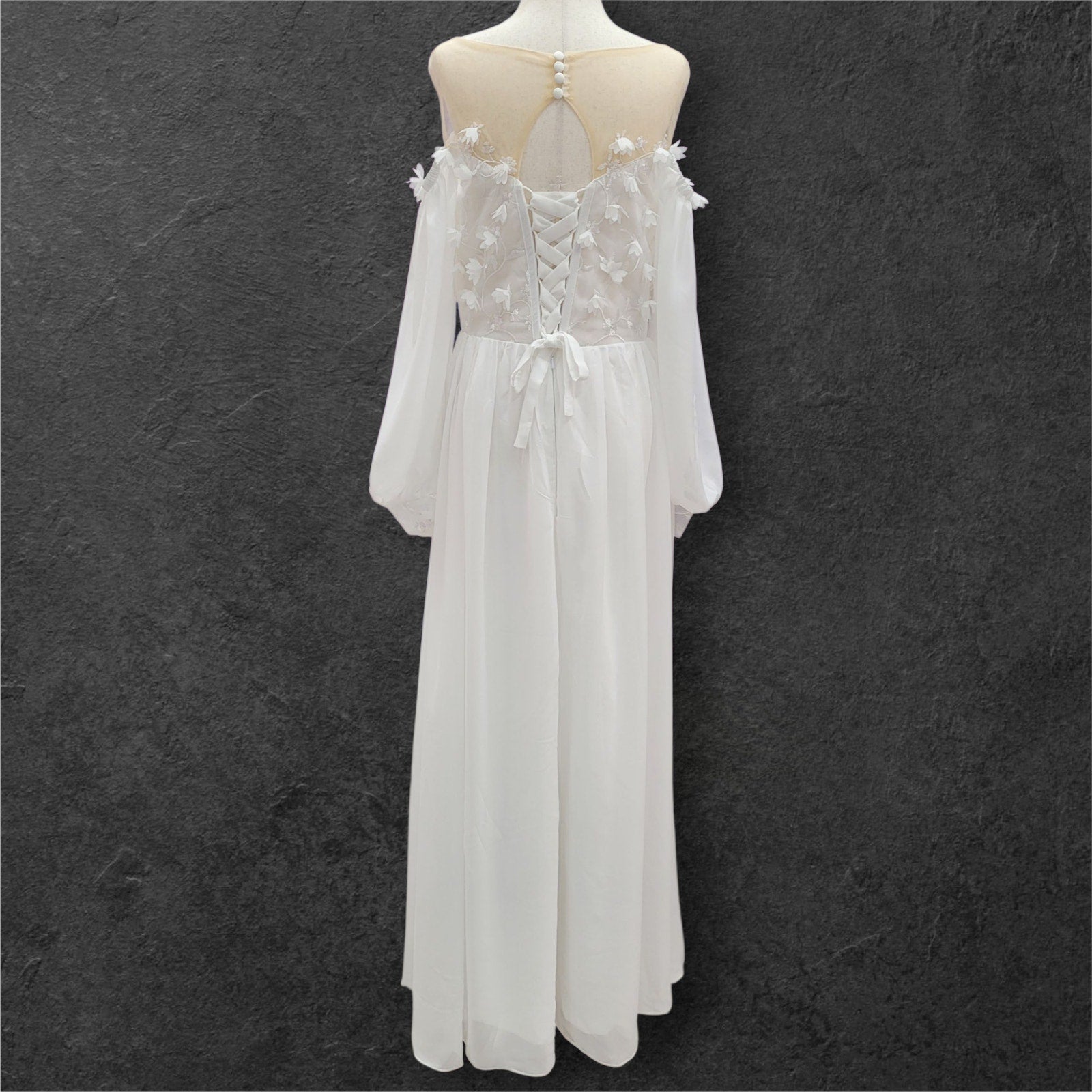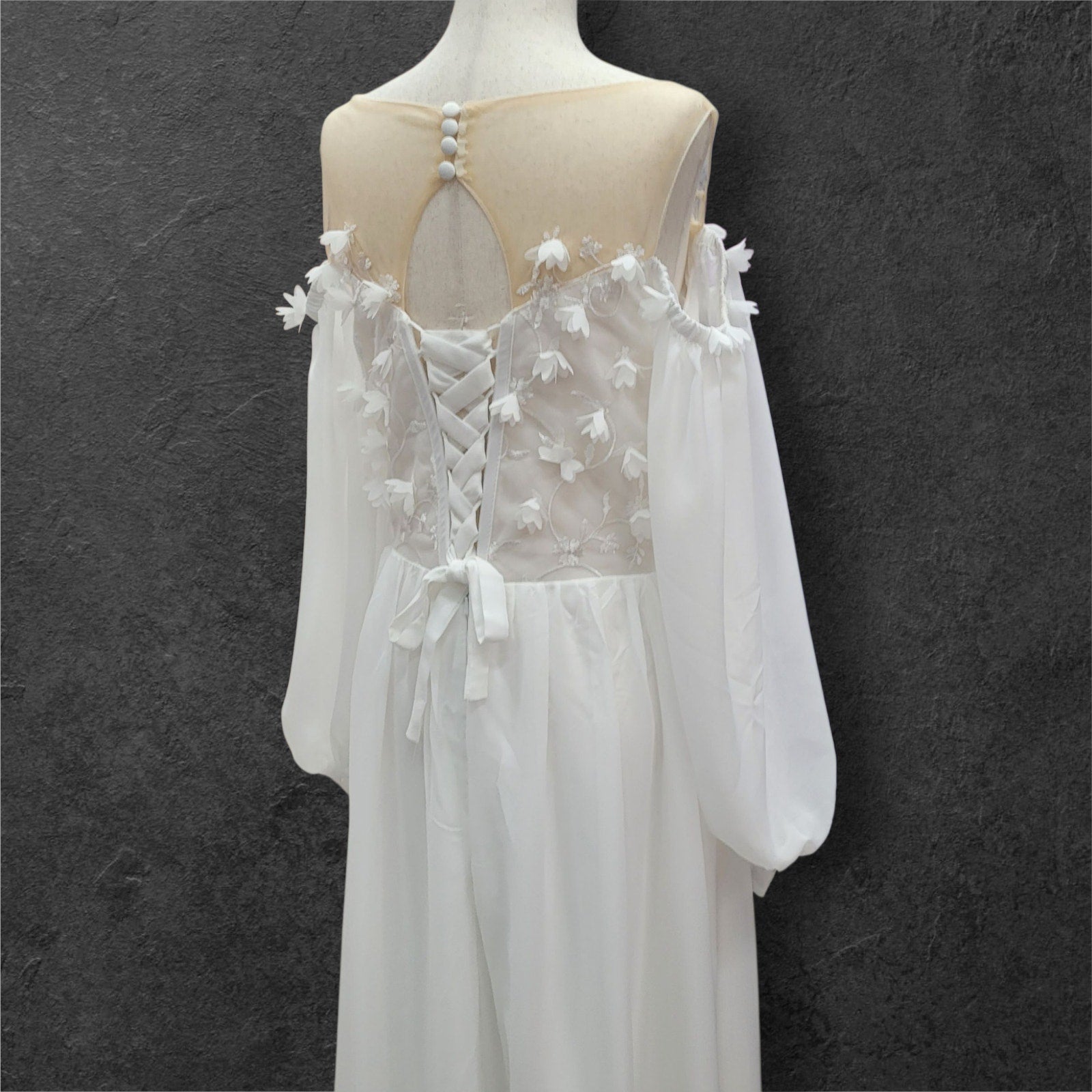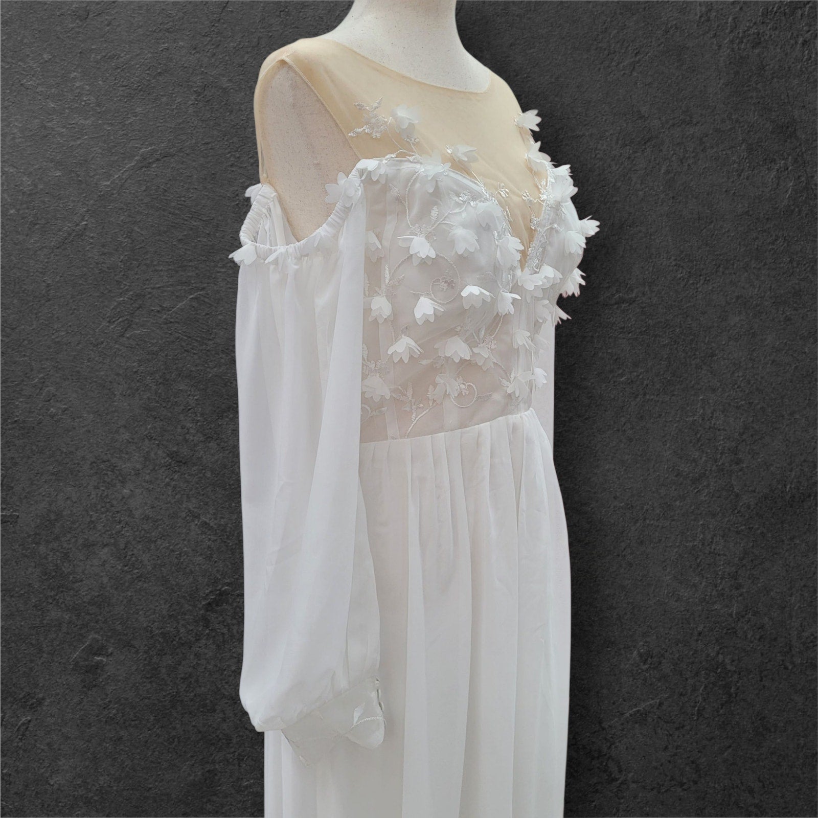 Beautiful boho chiffon wedding dress, perfect for your special day! This off-shoulder dress features long sleeves and delicate floral details, adding a touch of romance to your bridal look. The flowing chiffon fabric creates a dreamy silhouette, ensuring you feel comfortable and elegant as you walk down the aisle. Whether you're planning a beach wedding or a garden ceremony, this dress will make you feel radiant.