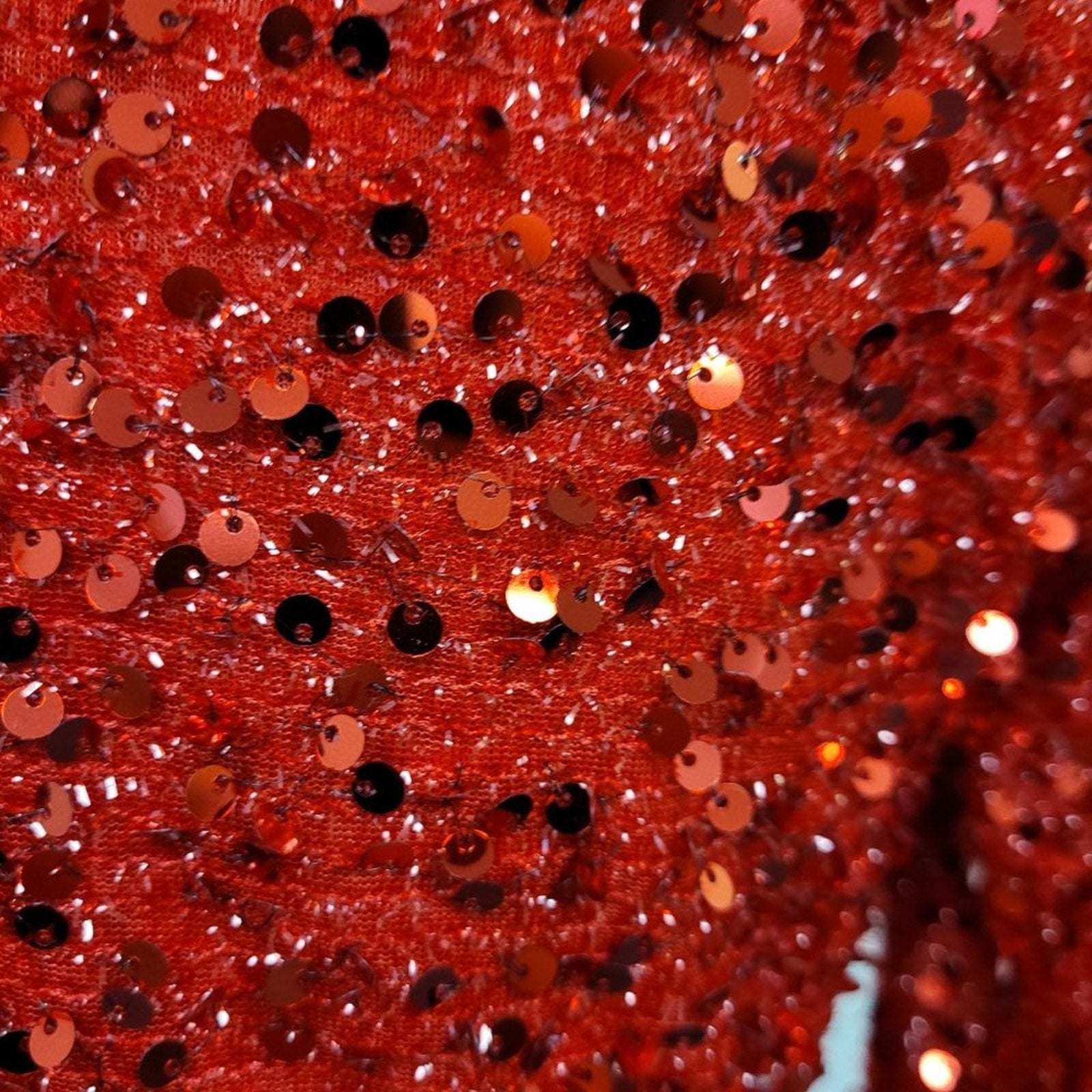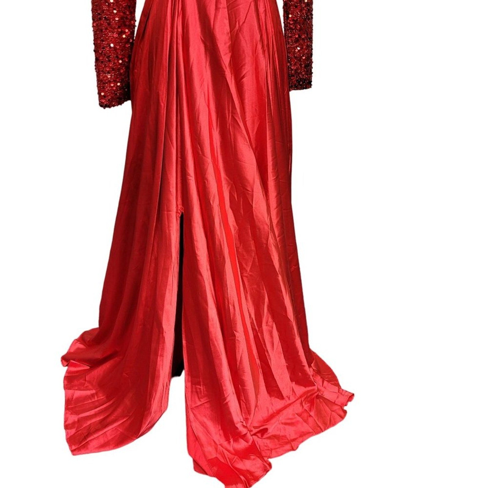 Bright Red Gala Gown with Sequin Bodice and Long Sleeves