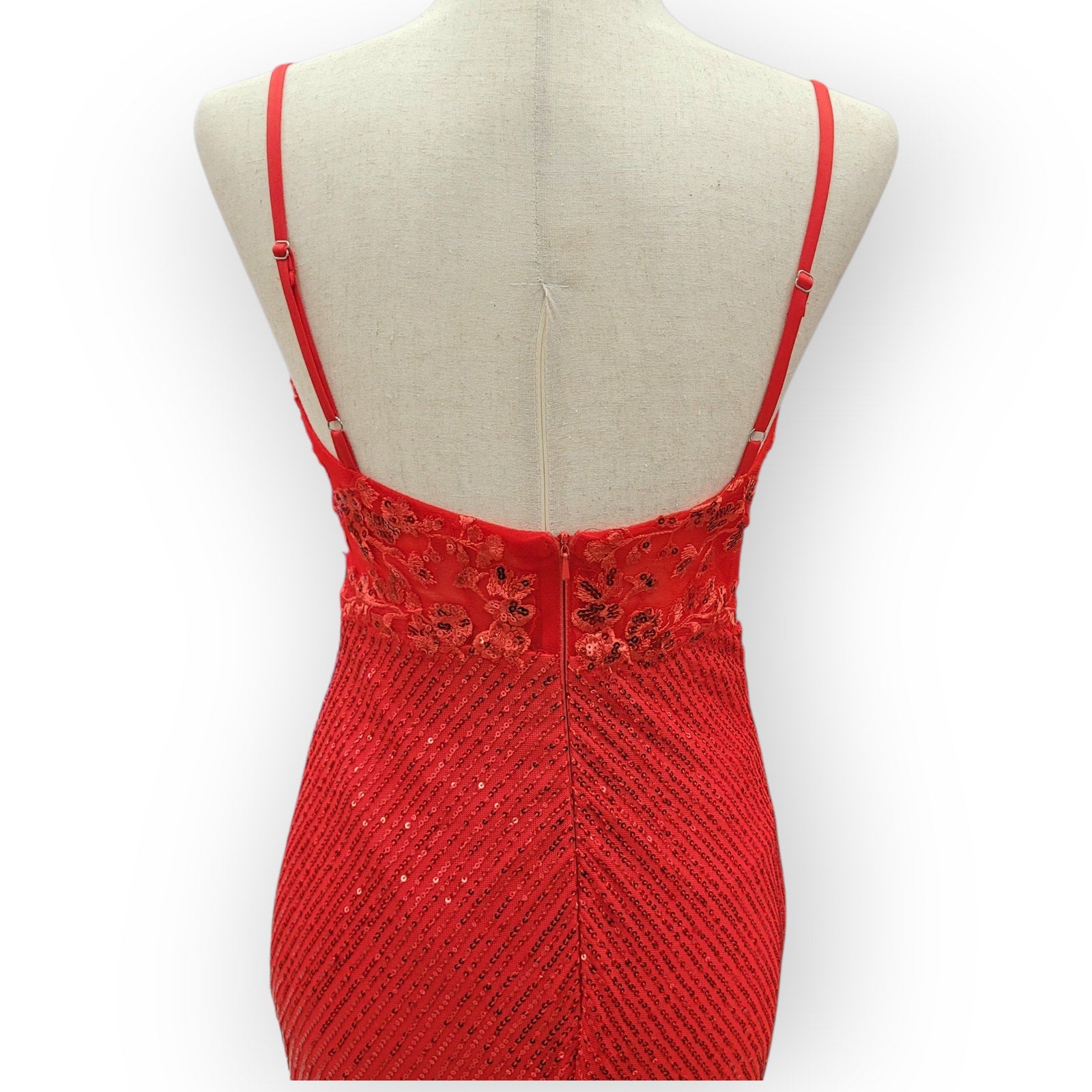 Make a statement in this stunning bright red sequin evening gown! The intricate details on the bodice add a touch of elegance and glamour. Perfect for a prom, cruise, pageant, or any special occasion where you want to shine.