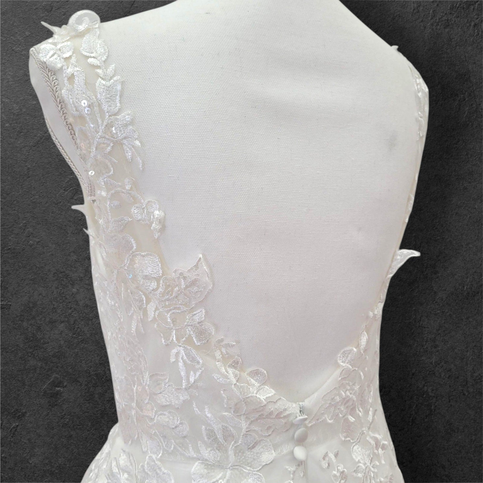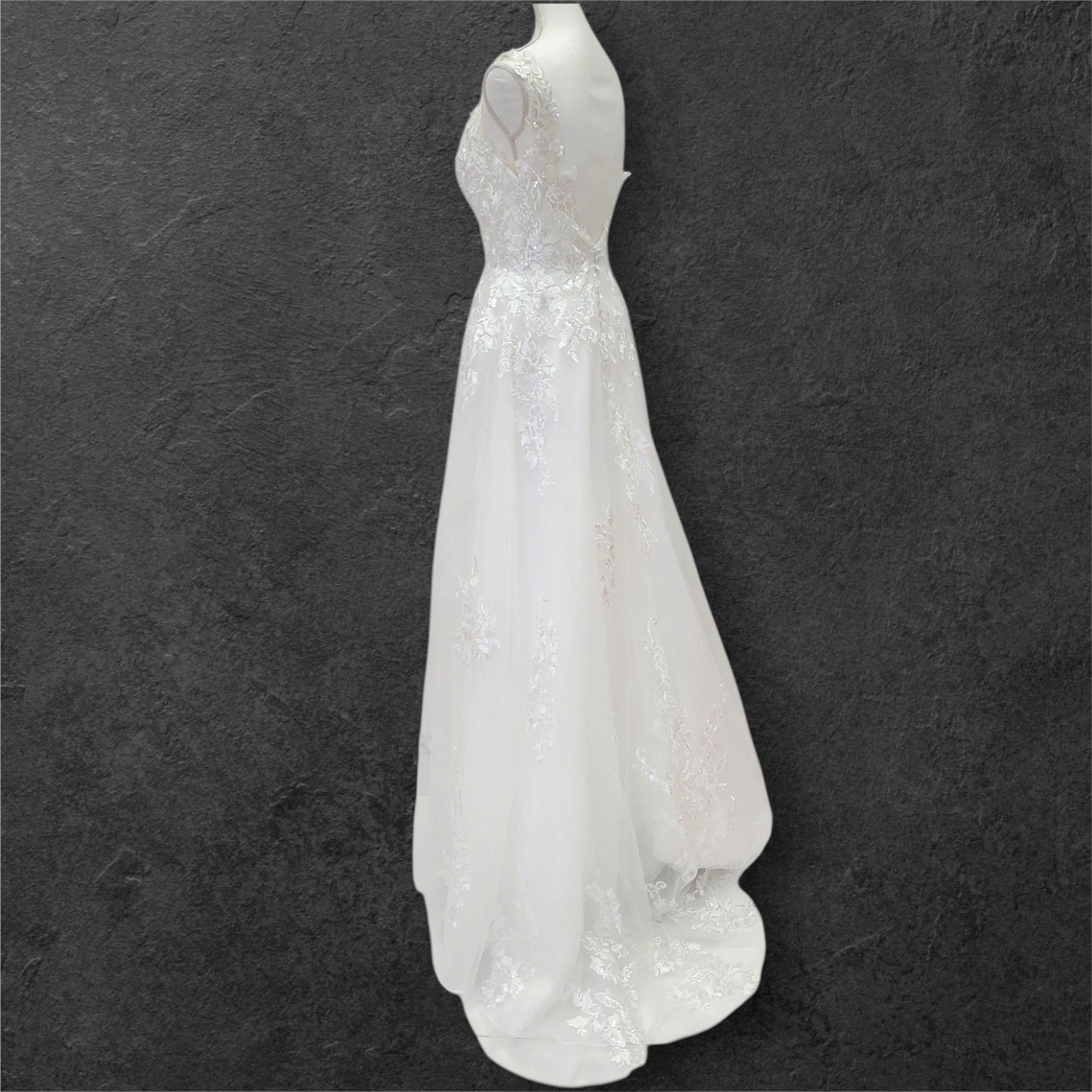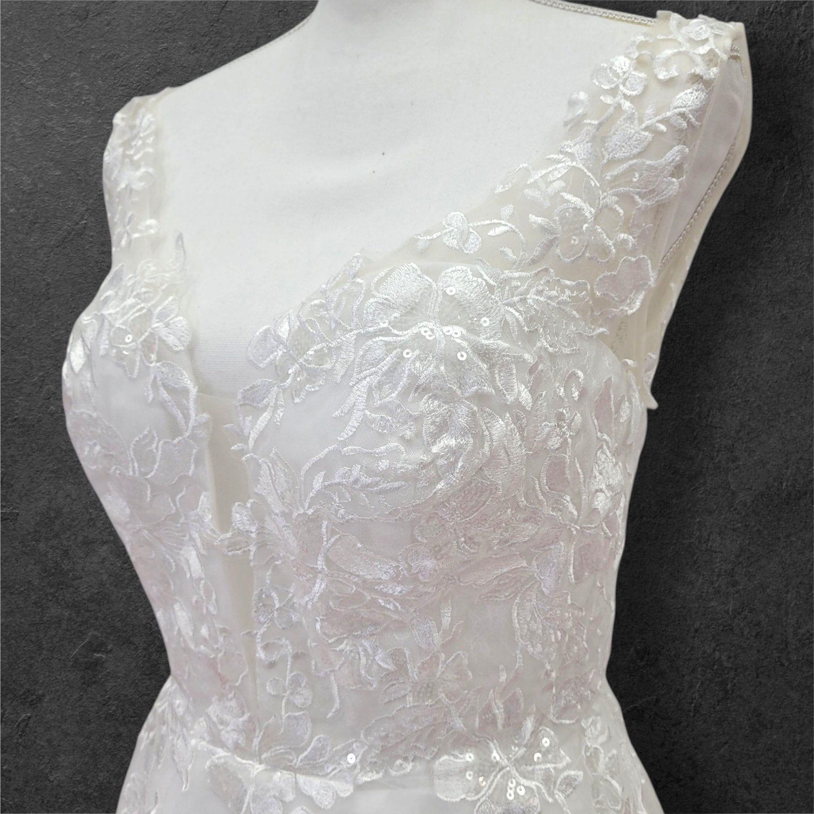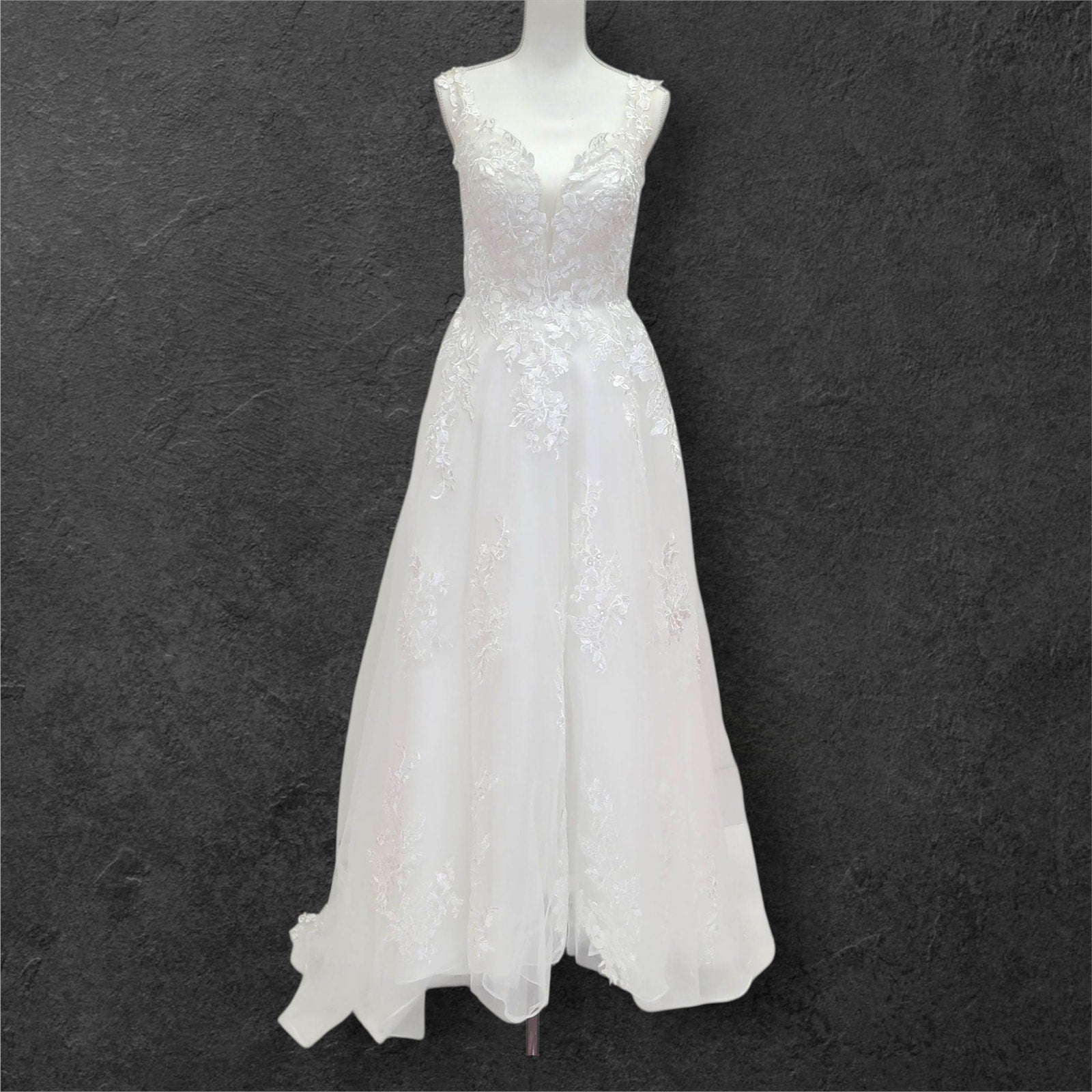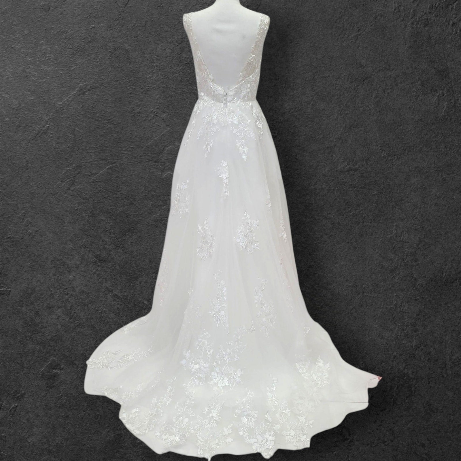 This exquisite wedding gown combines timeless elegance with modern allure. The plunging V neckline frames your décolletage beautifully, while the meticulously detailed low back creates a captivating silhouette. The flowing train adds dramatic movement and regal presence as you glide down the aisle. Crafted with precision and attention to detail, this sophisticated design balances sensuality with refined grace—perfect for the bride who desires to make an unforgettable statement on her special day.