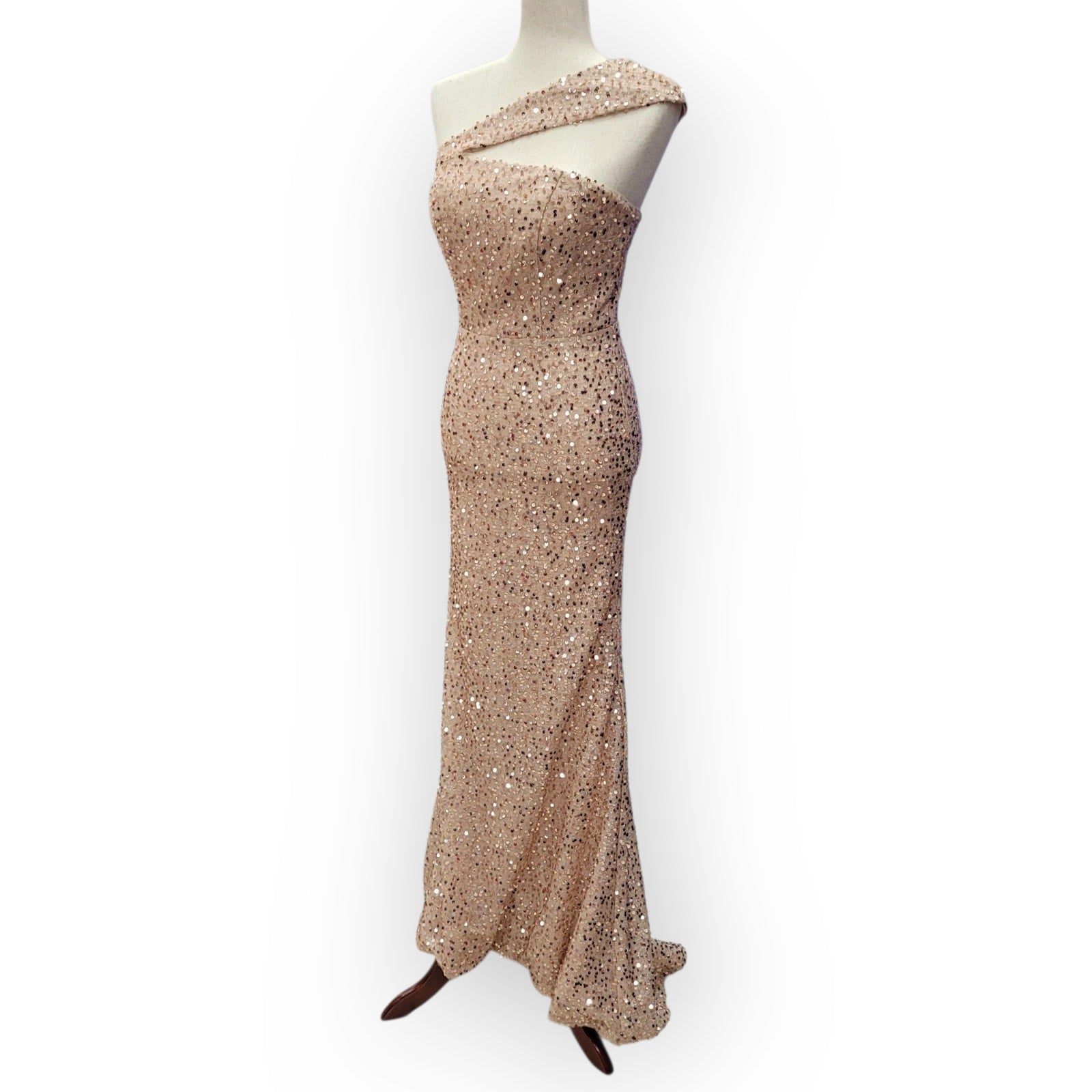 Fitted Beige Champagne Sequin Gown with Asymmetric Shoulder Strap