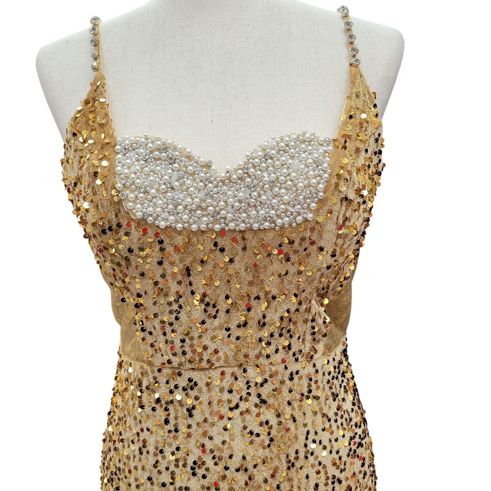 Fitted Gold Sequin Gown with Pearl Detail Bust and Tulle Side Train