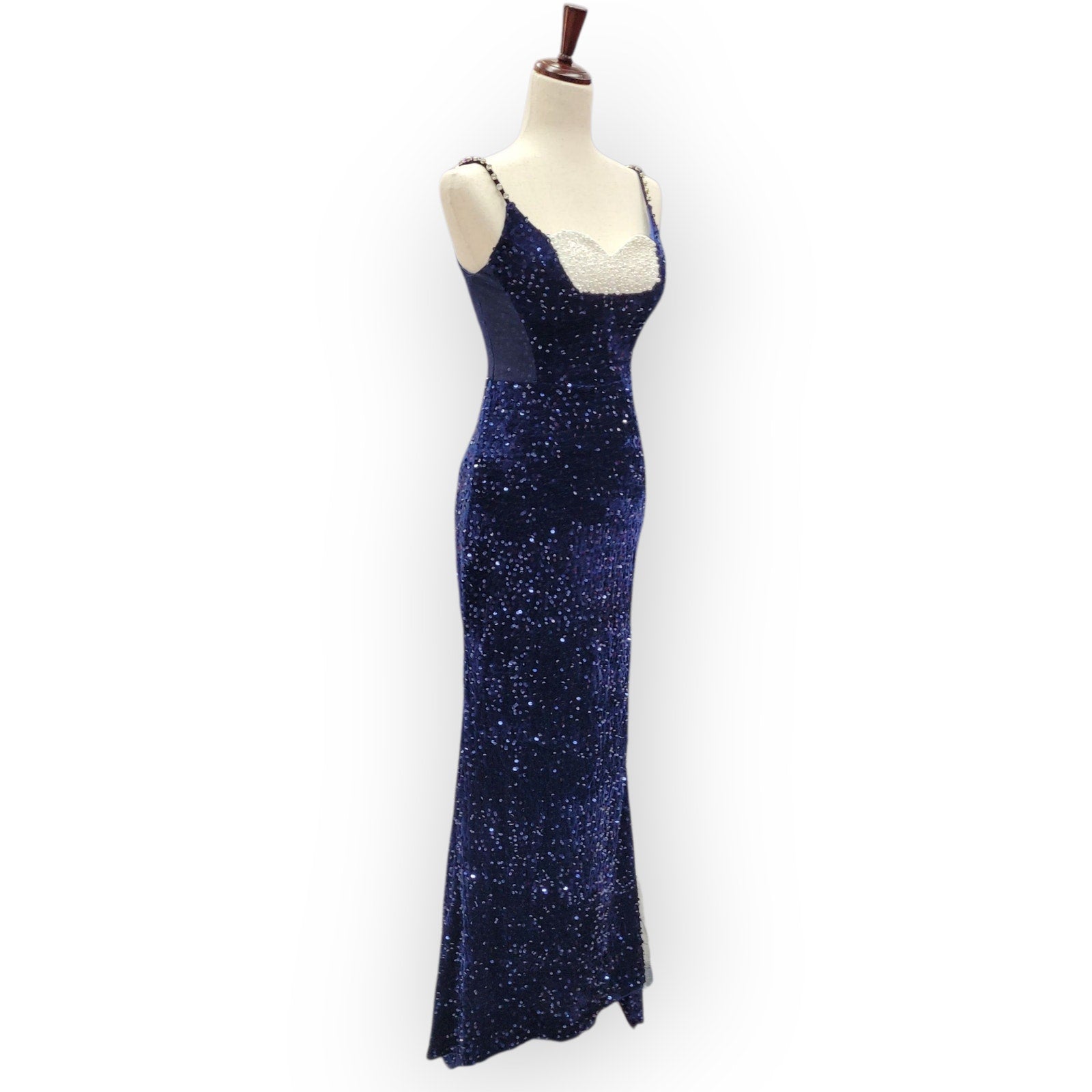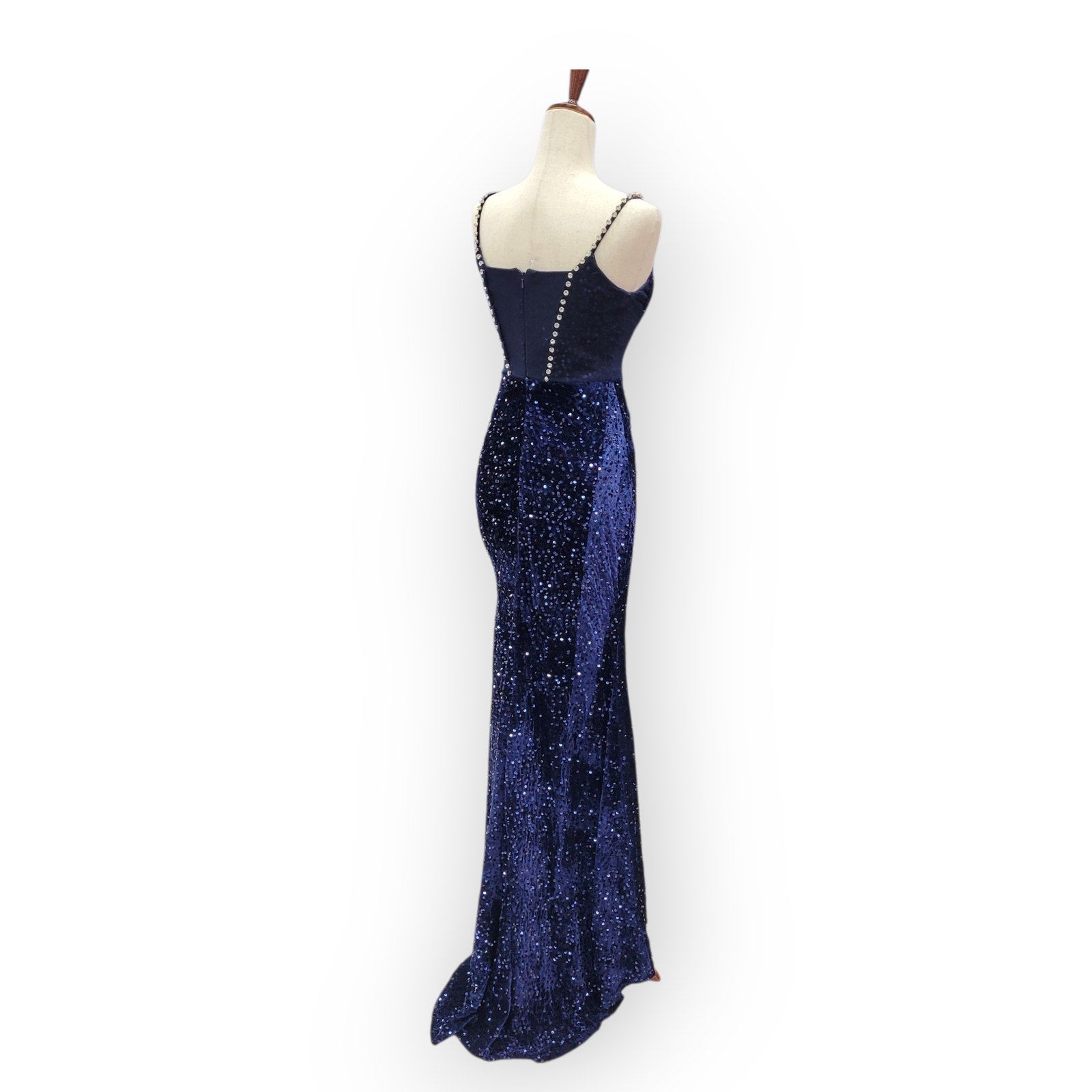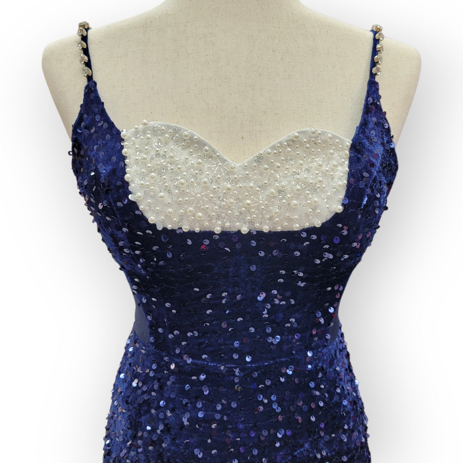 Fitted Navy Blue Sequin Gown with Pearl Detail Bust and Tulle Side Train