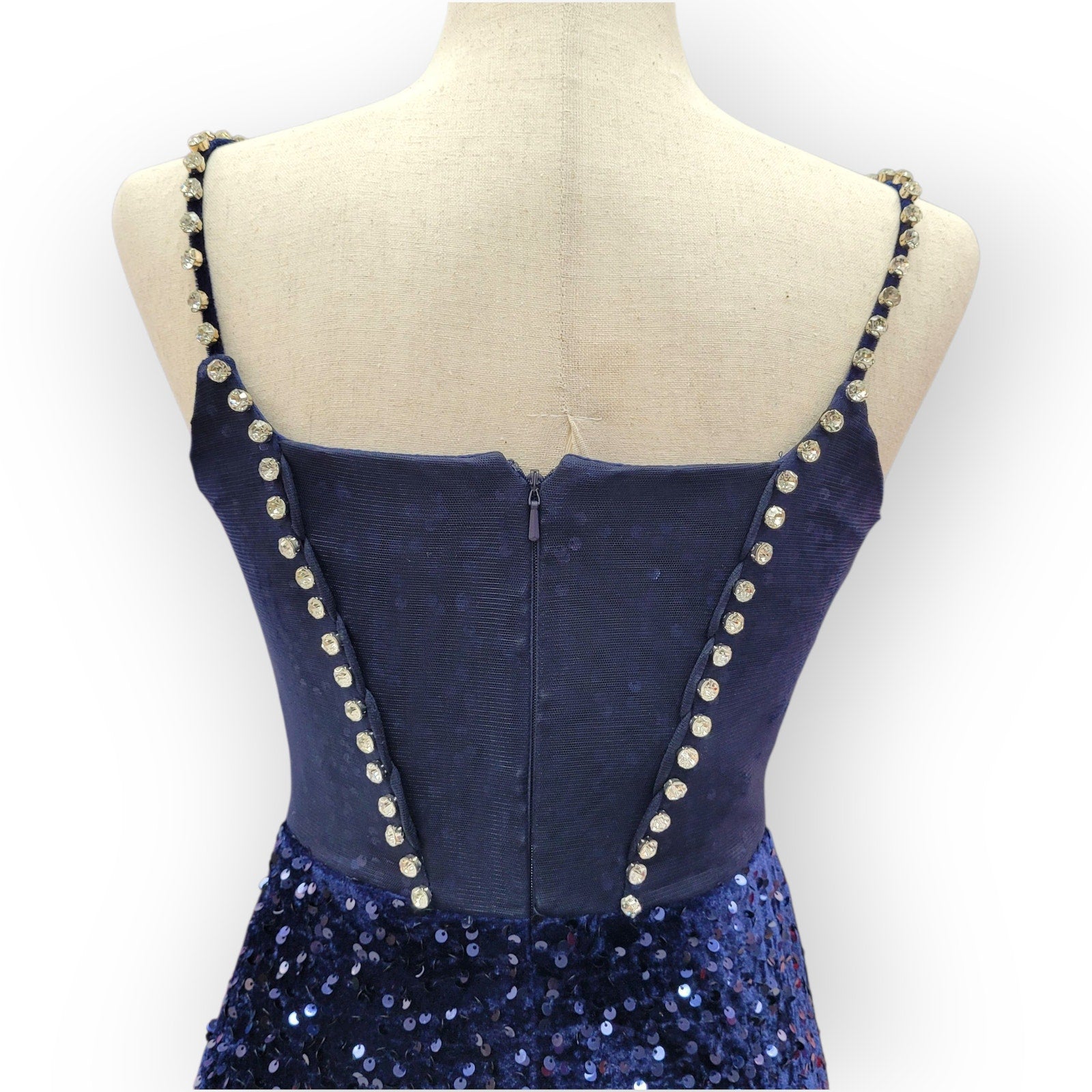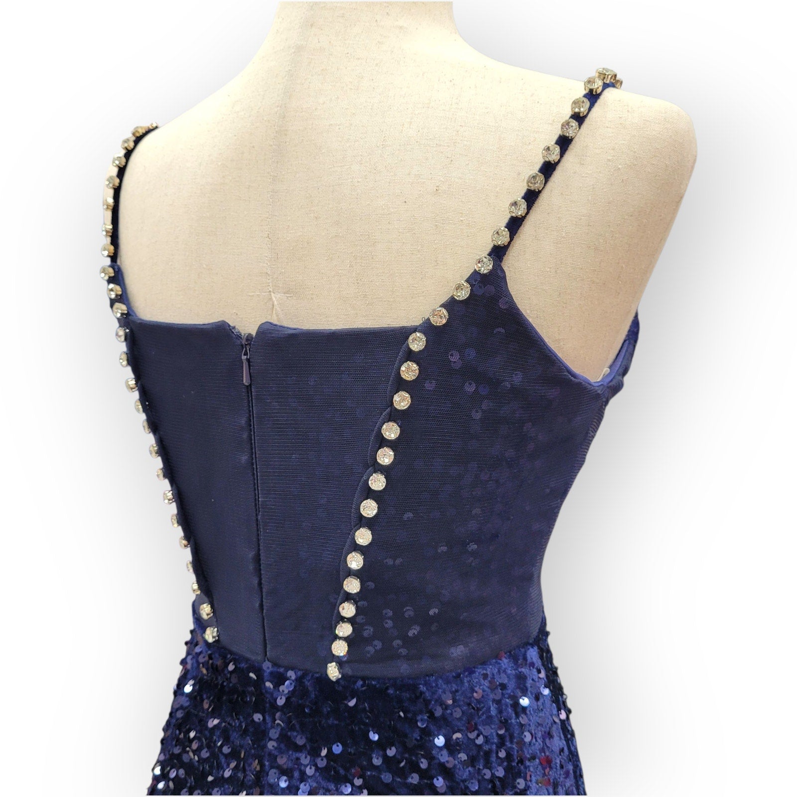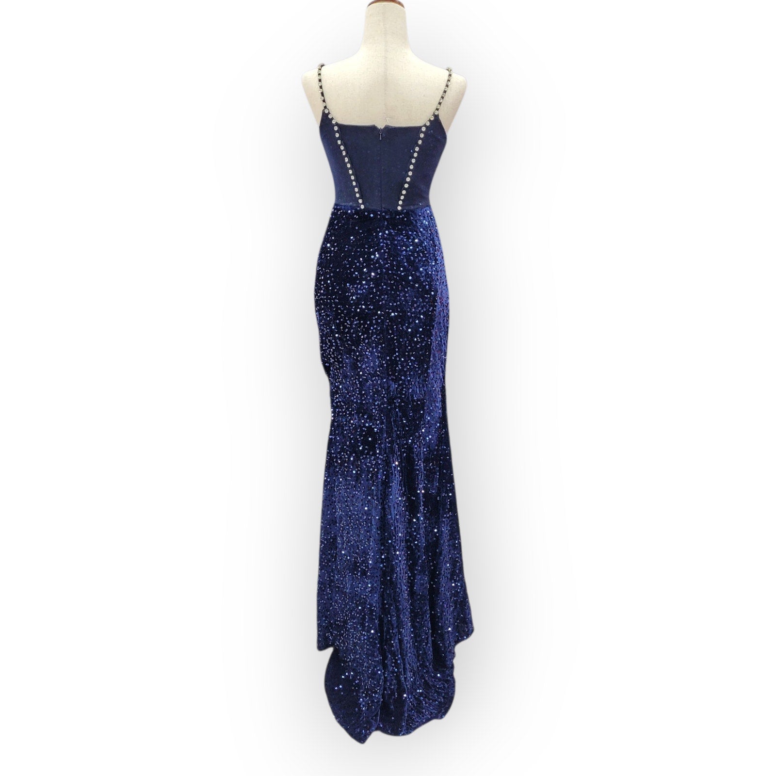 Fitted Navy Blue Sequin Gown with Pearl Detail Bust and Tulle Side Train