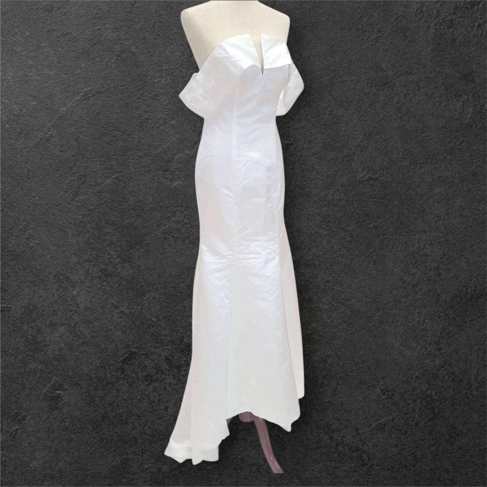Exquisitely crafted, this fitted off-shoulder satin wedding dress embodies timeless elegance. The sophisticated silhouette gracefully contours your figure before flowing into a dramatic trumpet skirt, creating a captivating profile. Luxurious satin fabric catches the light with subtle luminosity, ensuring you command attention as you glide down the aisle with refined grace and undeniable allure.
