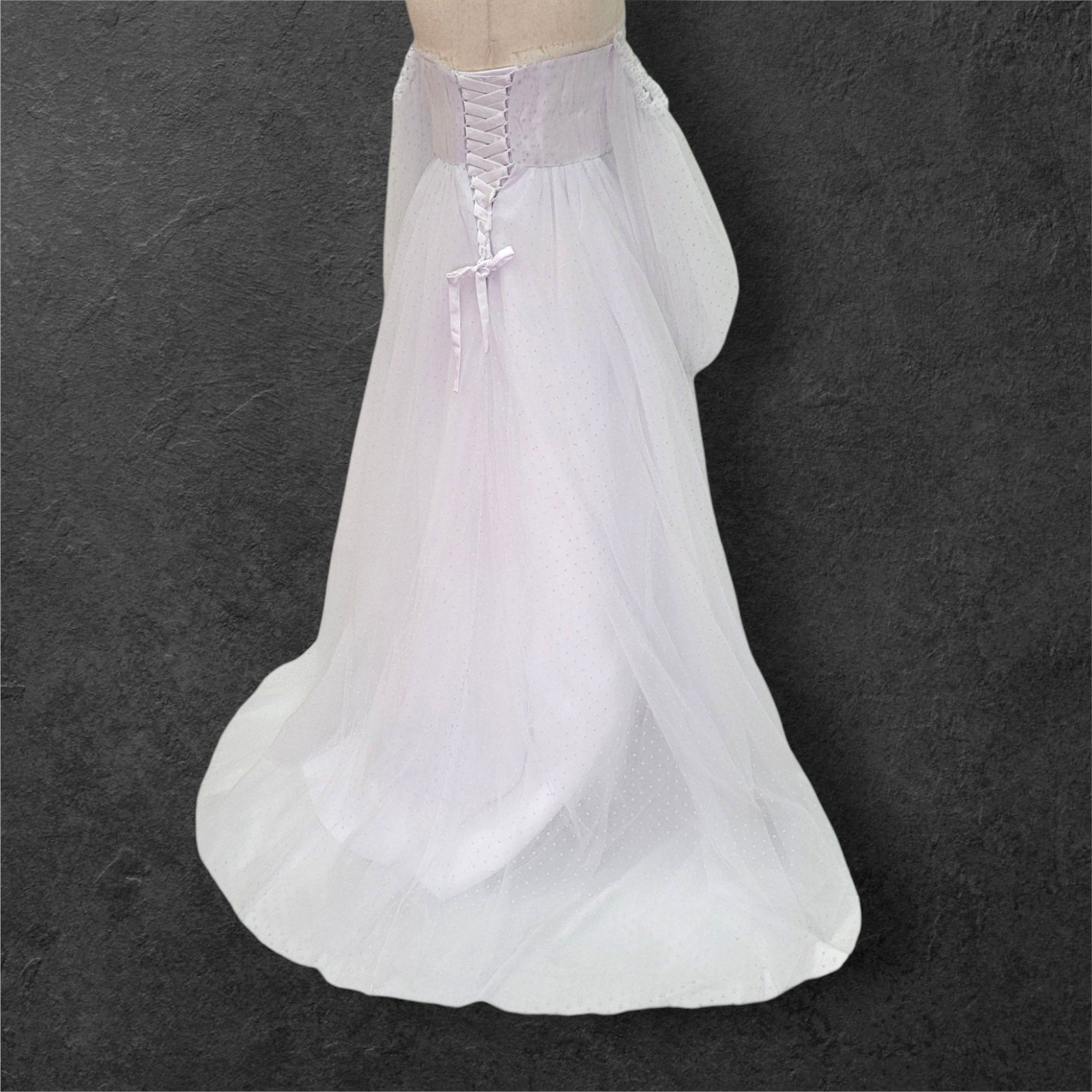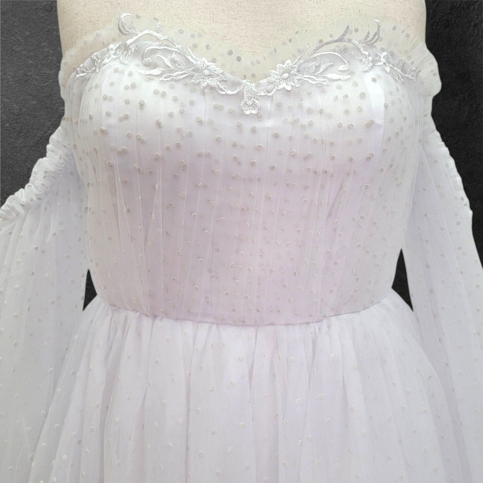 This delightful polka dot tulle wedding dress is sure to make your special day even more magical! The playful polka dot pattern adds a touch of whimsy, while the off-shoulder sleeves create a romantic and elegant look. Made with high-quality tulle, this dress is lightweight and comfortable to wear, allowing you to dance the night away with ease. Perfect for a bride who wants to showcase her fun and unique personality.