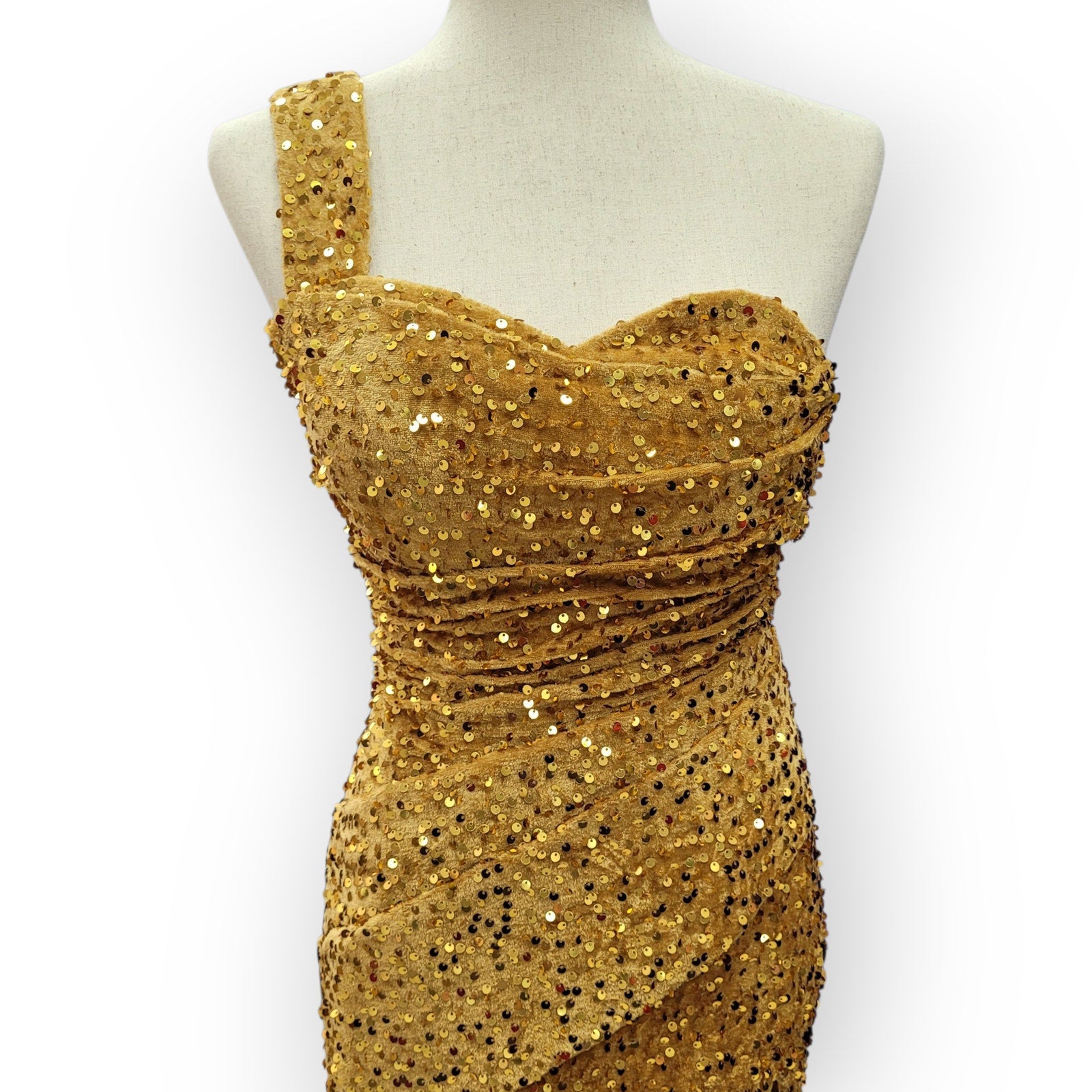 Gold One Shoulder Evening Gown with Gathered Waist and Corset Back