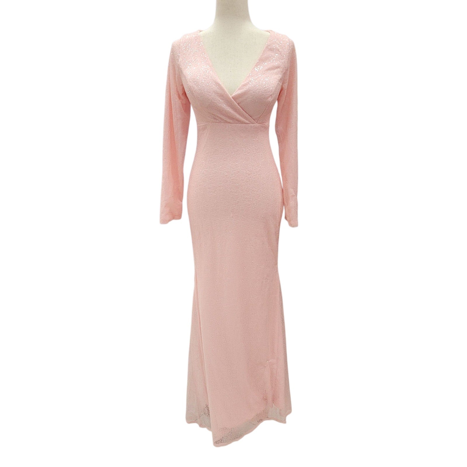 Beautiful light pink fitted sequin gown with long sleeves. The dress features a flattering v-neck and a convenient zipper closure. Perfect for a special occasion or a night out!