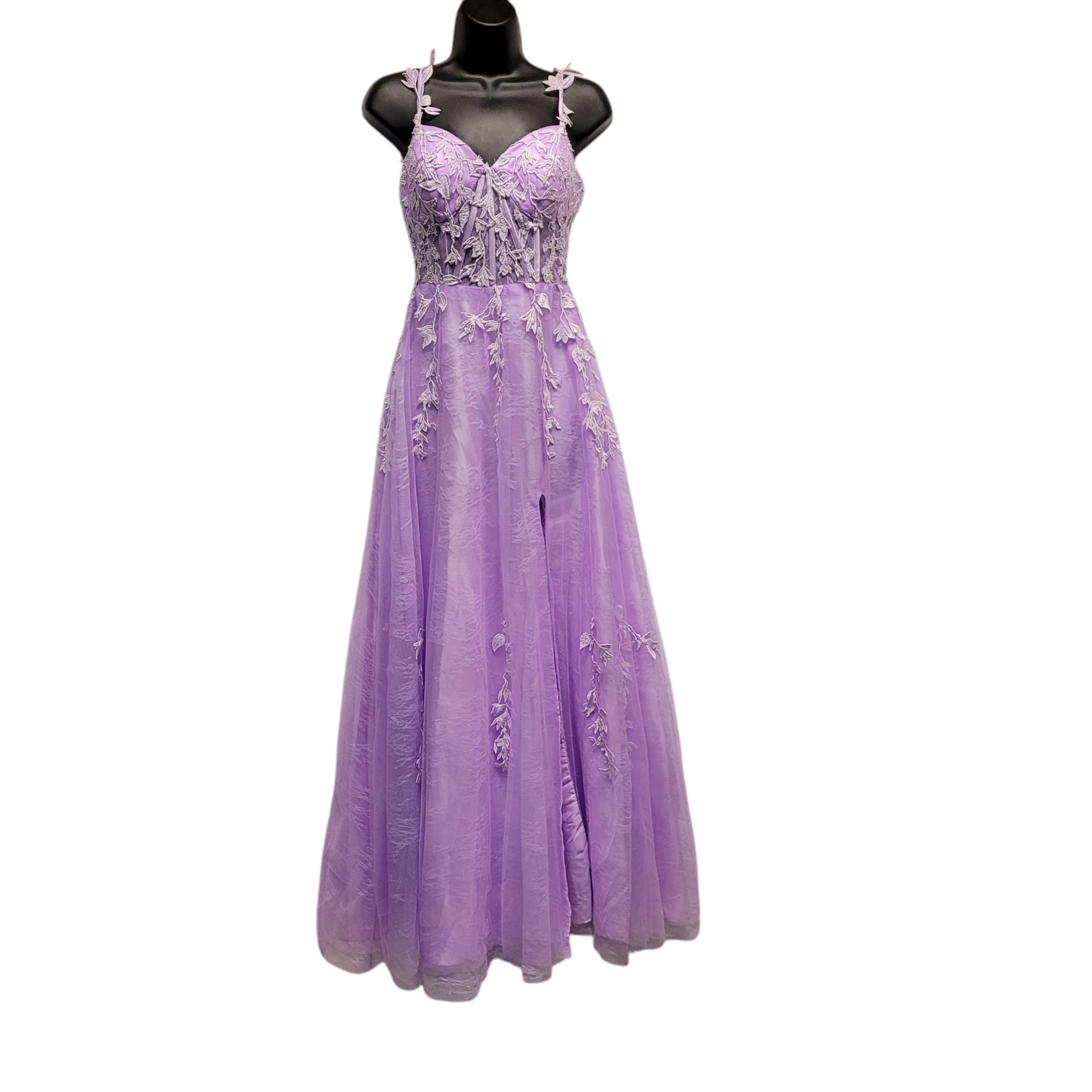 Beautiful lilac gown with light colored vine pattern, semi sheer bodice and an off center slit just above the knee. Flattering on most body types. Short corset back and short zipper in back. Adjustable straps.