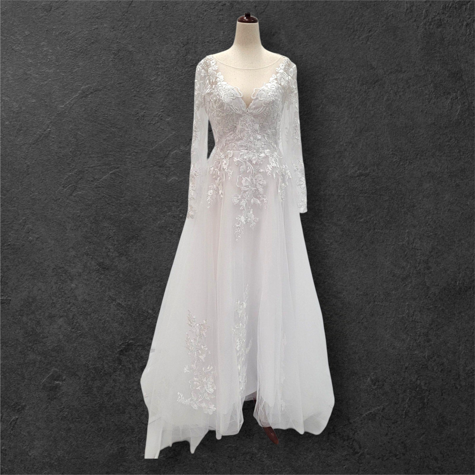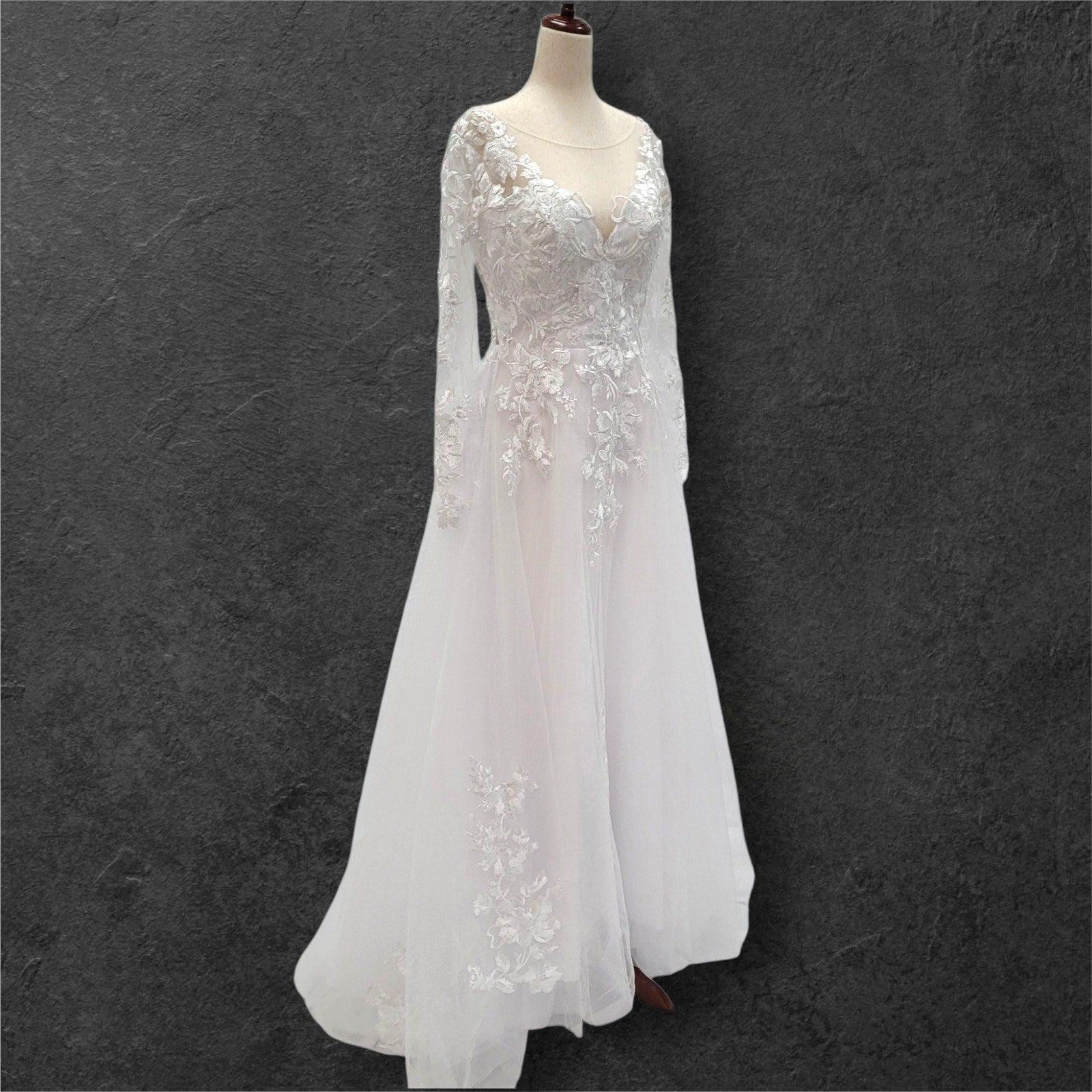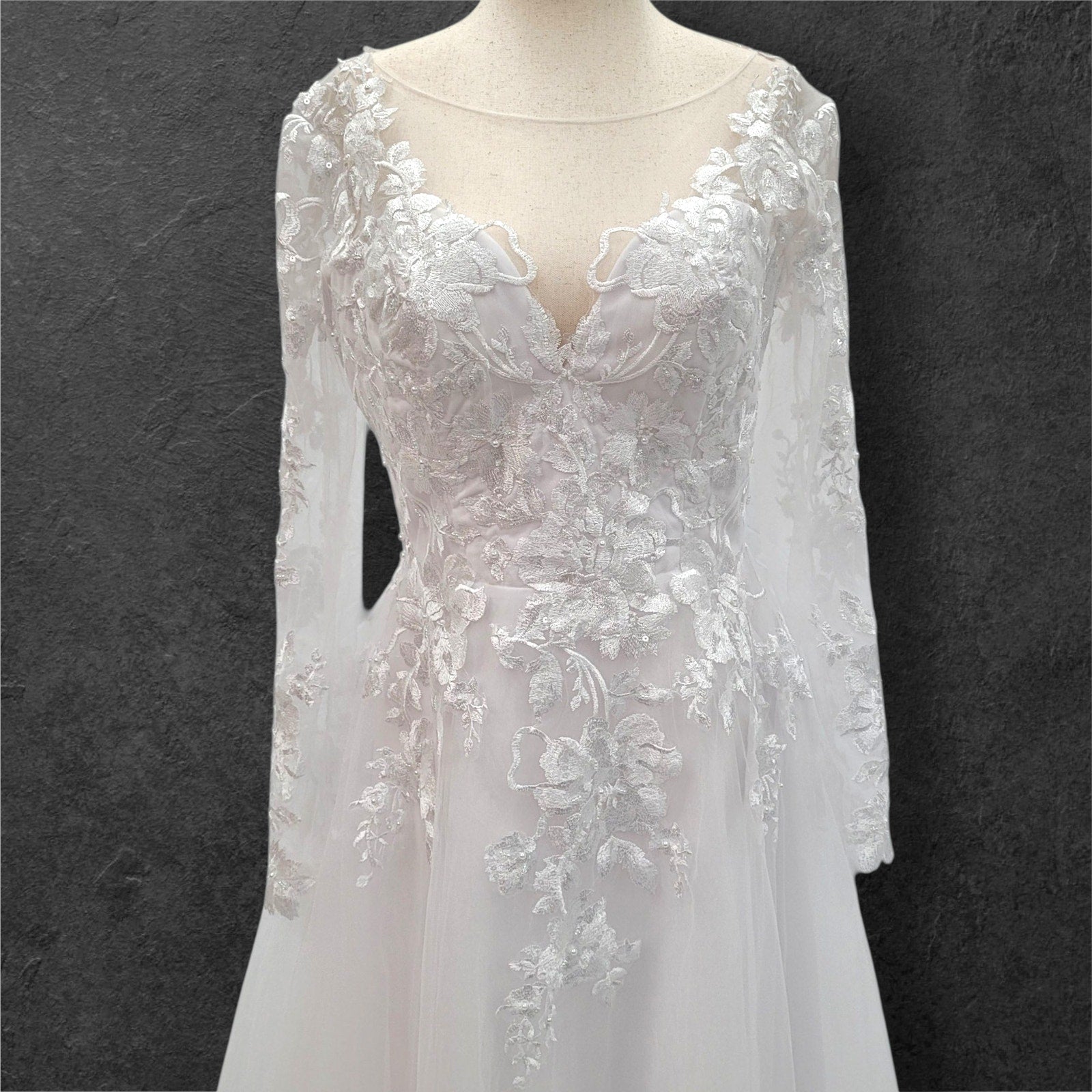 Long Sleeve Tulle Wedding Dress with Sheer Mesh Back with Floral Appliques