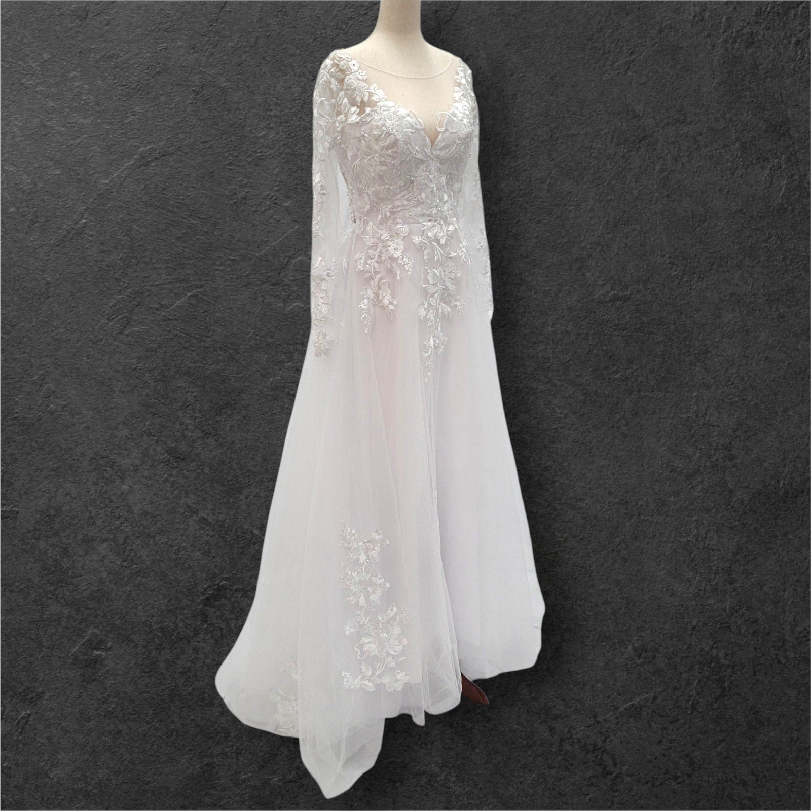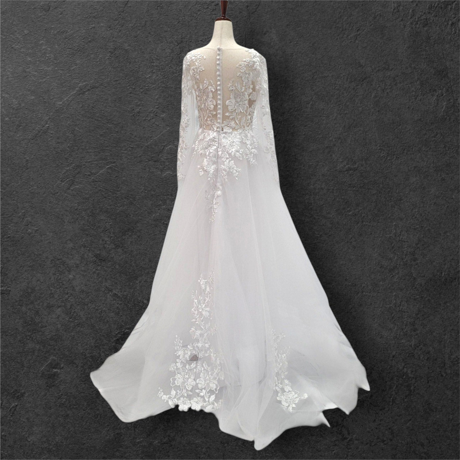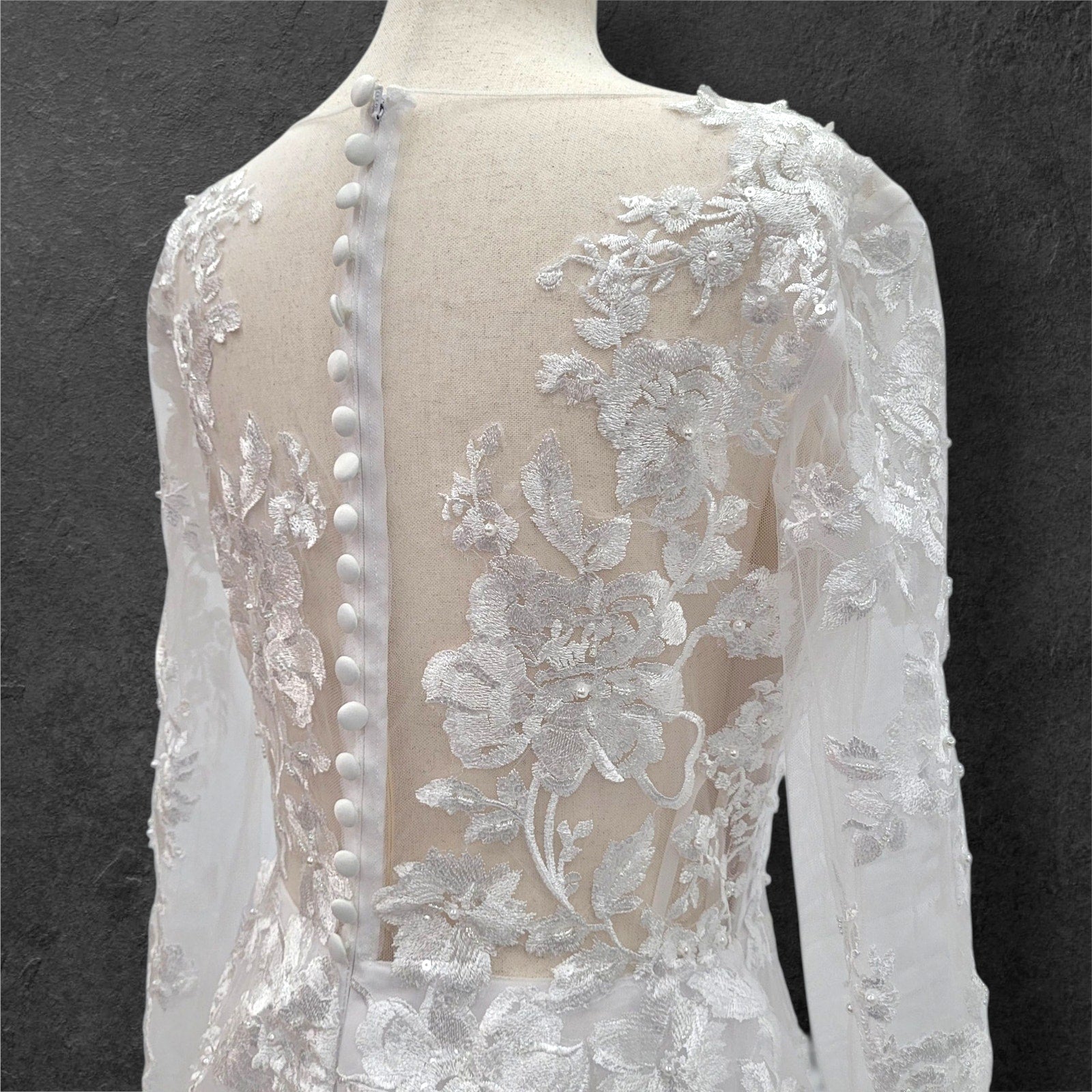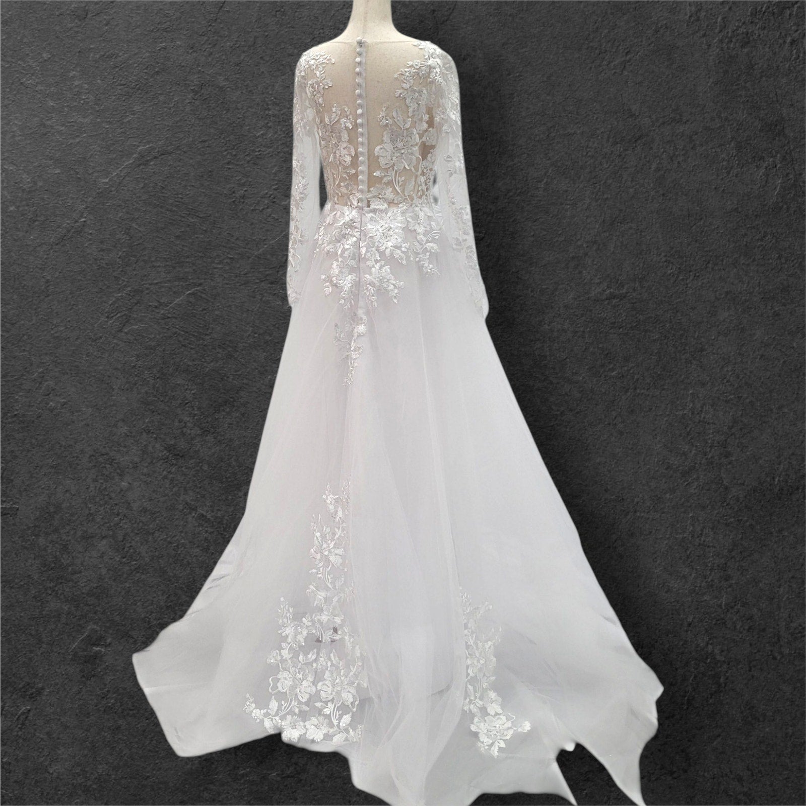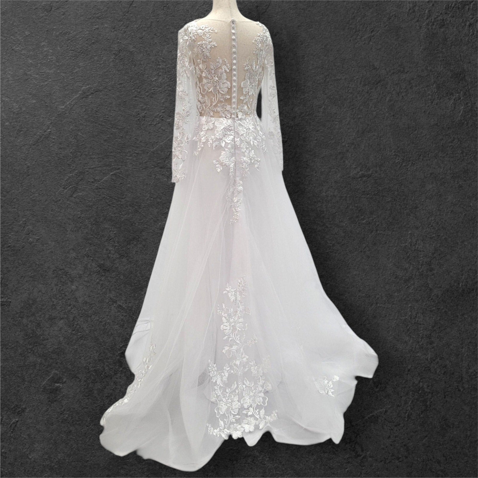 Stunning long sleeve tulle wedding dress, perfect for your special day! The dress features a sheer mesh back adorned with delicate floral appliques, adding a touch of romance and elegance. The zipper closure is cleverly hidden by white buttons, ensuring a seamless and sophisticated look. The flattering V-neckline completes the design, making you feel like a true princess. Make your wedding unforgettable with this breathtaking gown!