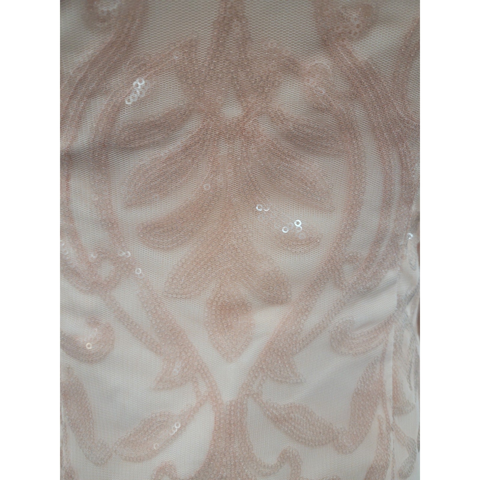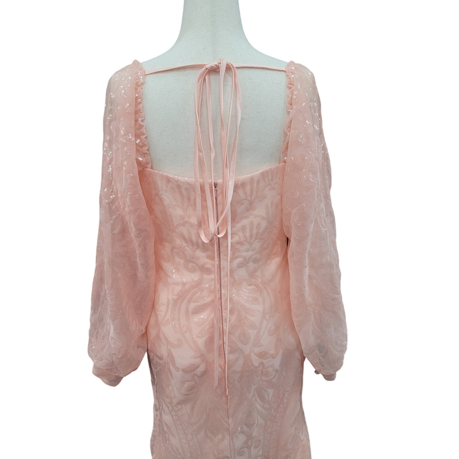 Beautiful patterned sequin gown with long sleeves, buttons on cuffs, and a leg slit in the skirt. Zipper closure.