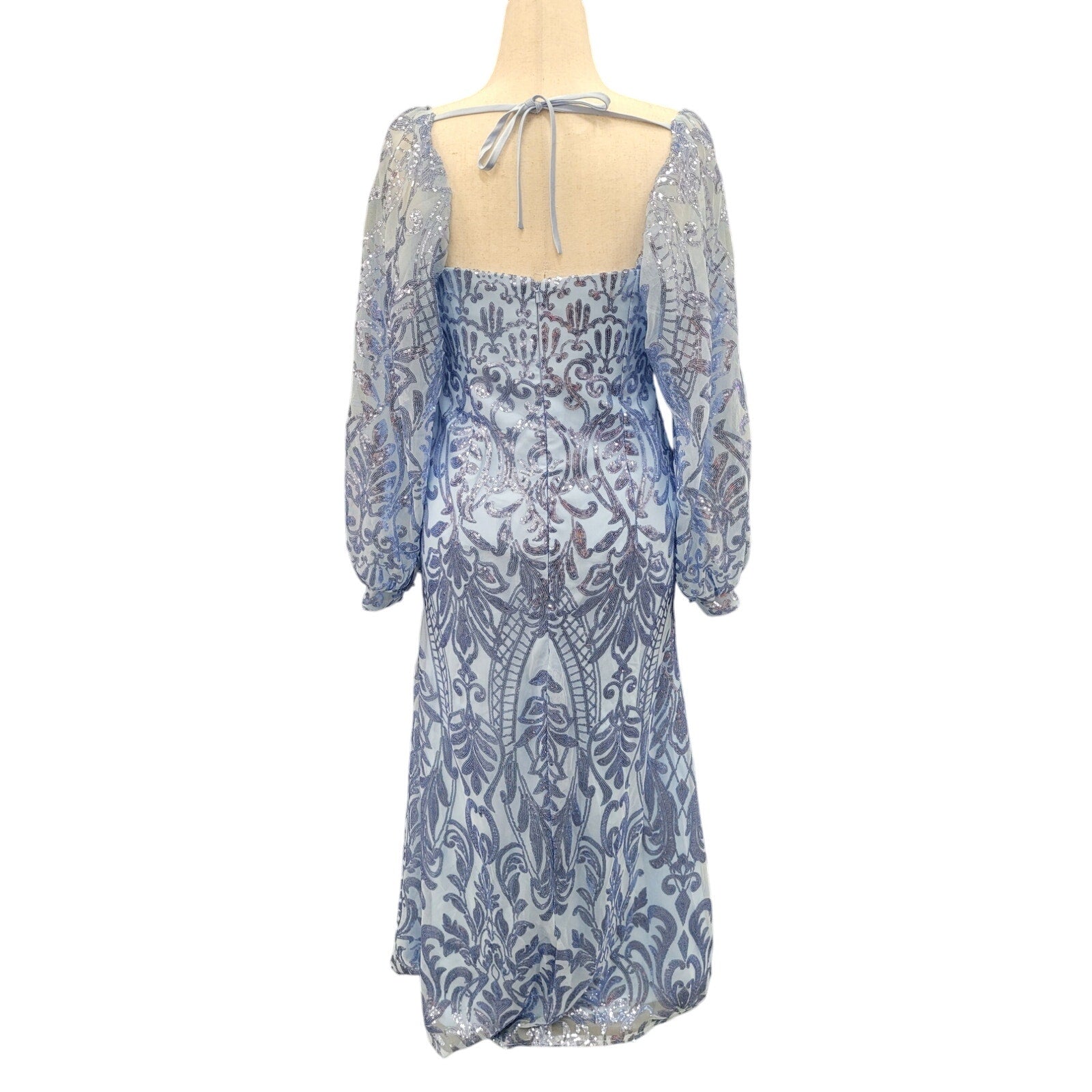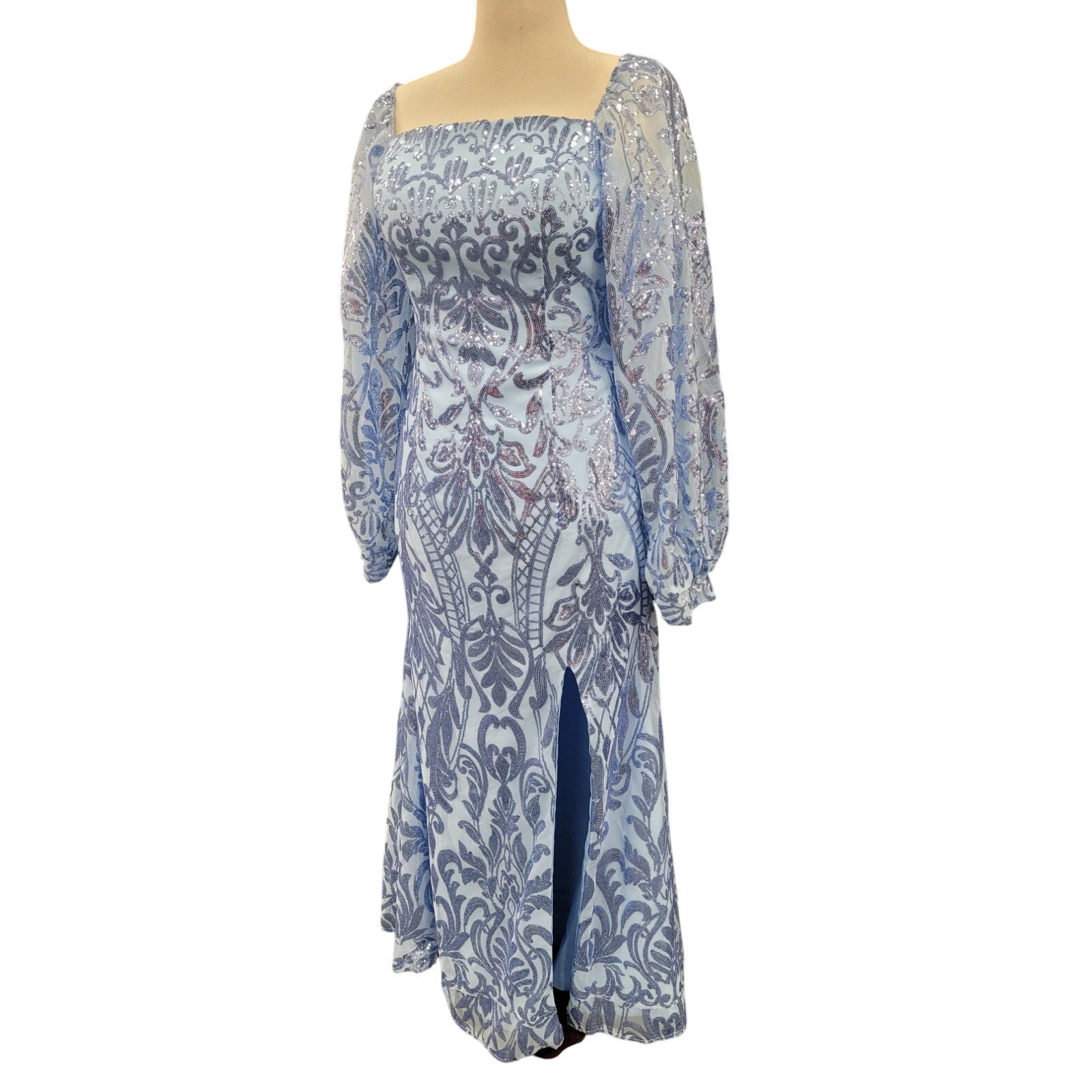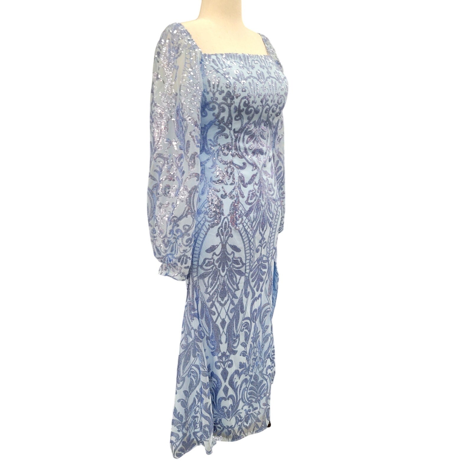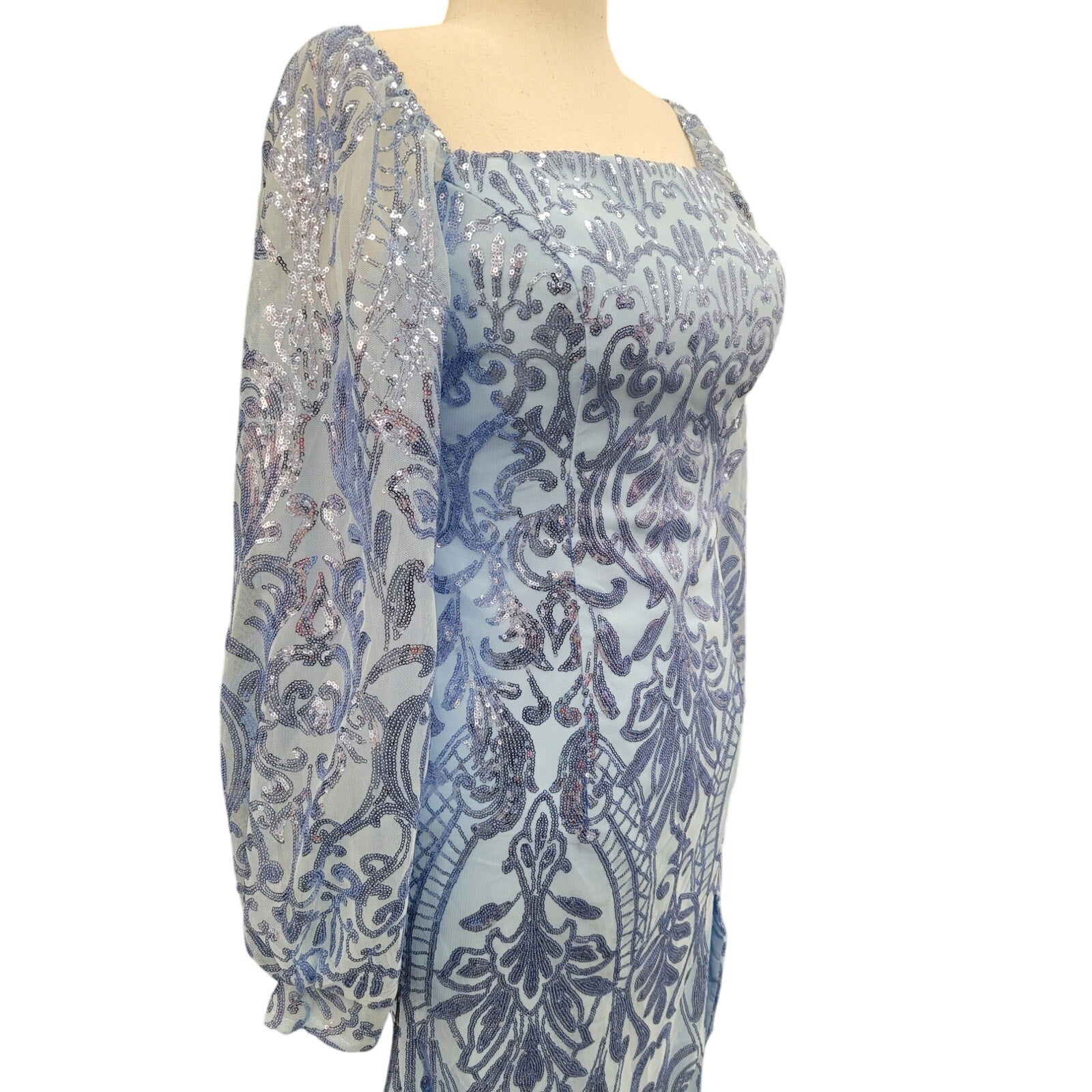 Long Sleeved Patterned Sequin Gown in Light Blue