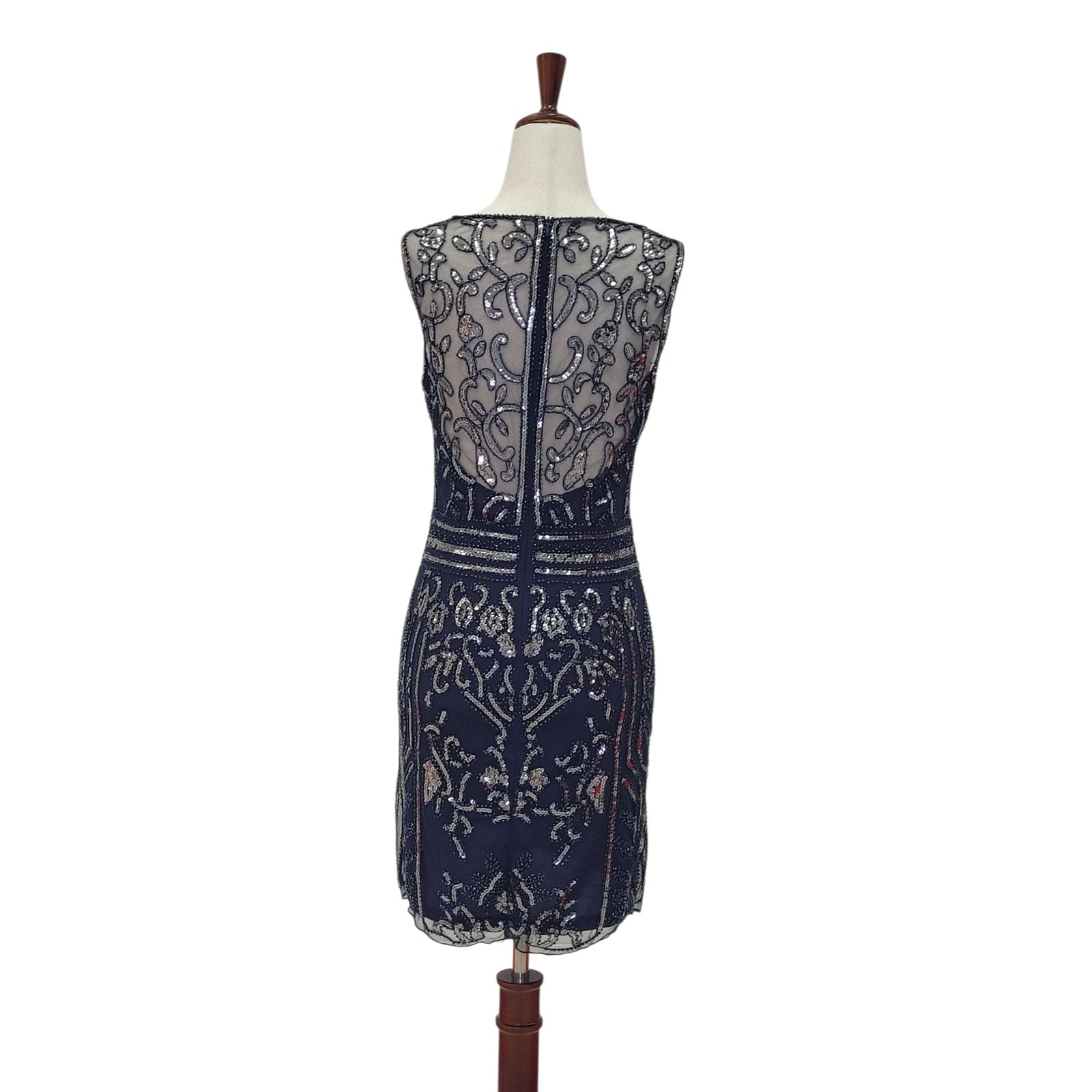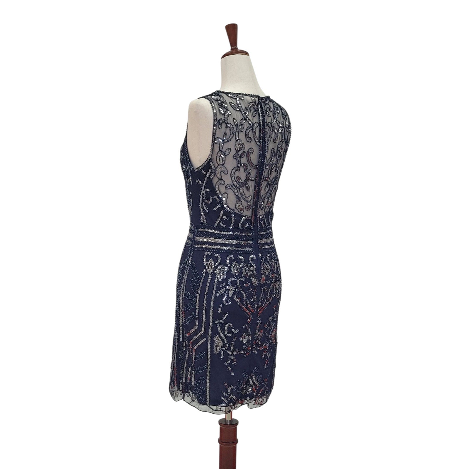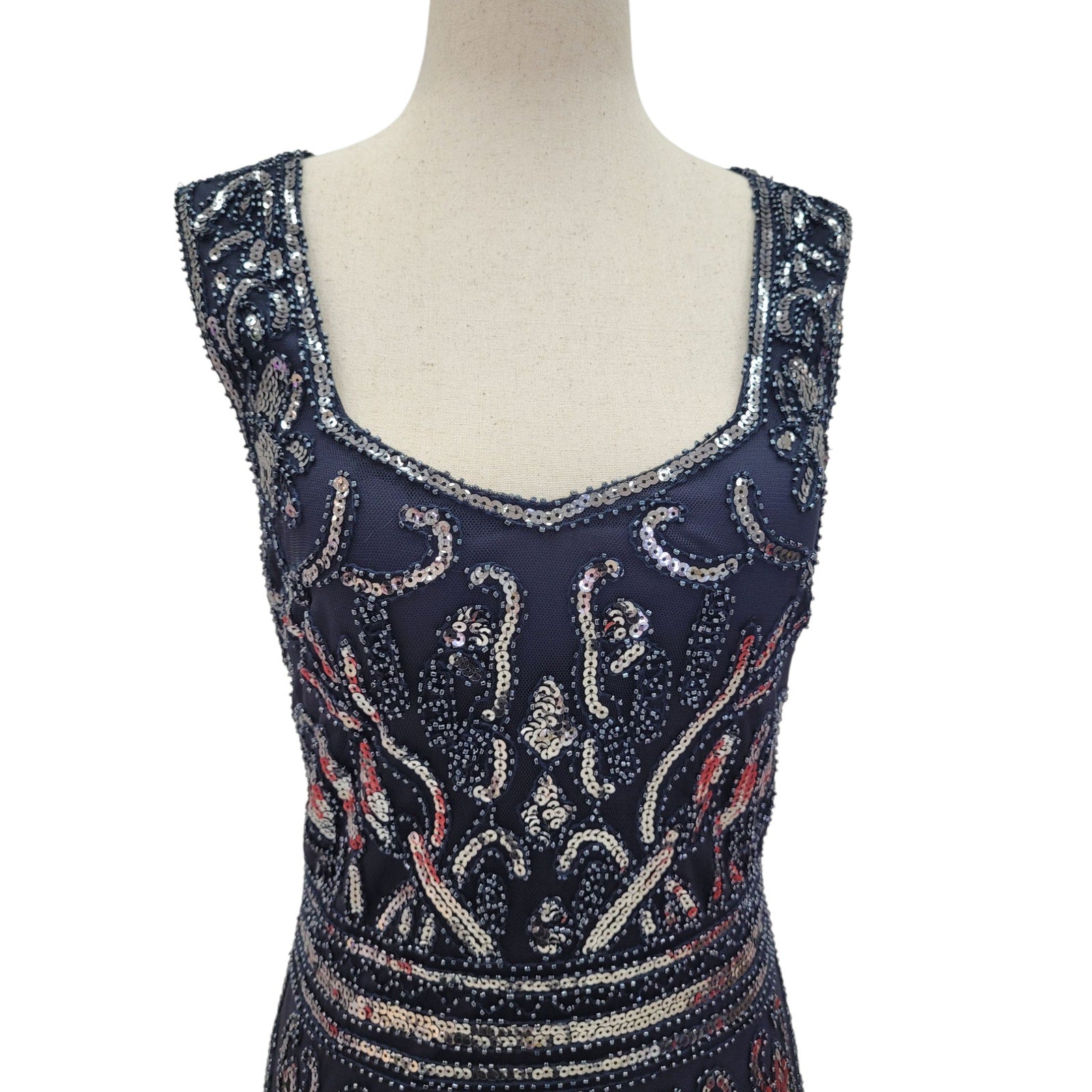 Stunning navy blue cocktail dress, perfect for your next special occasion! The dress features intricate silver sequin and beadwork that catches the light beautifully. It has a comfortable fit with thick straps for added support.