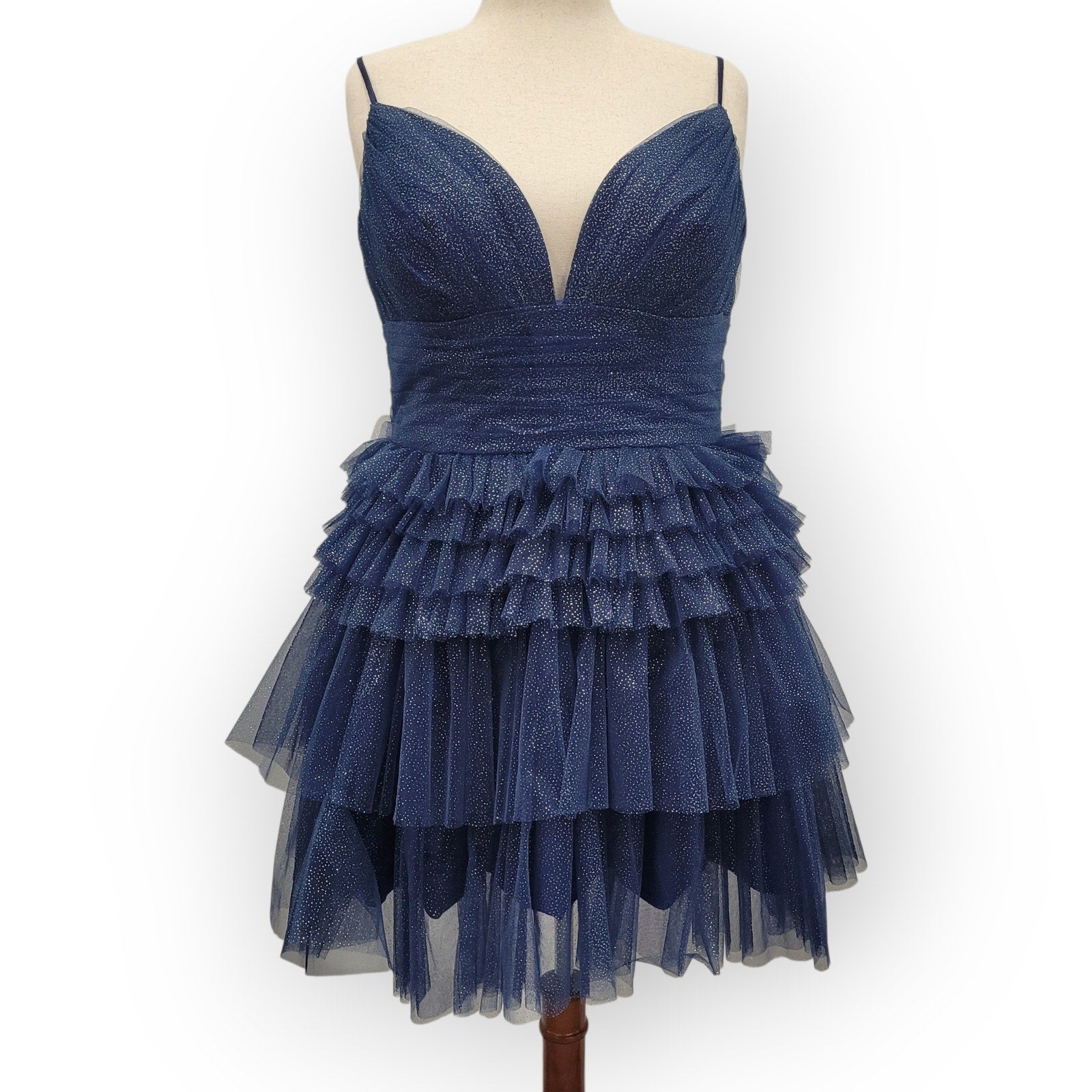 Stunning navy blue cocktail dress perfect for your next special occasion! This dress features a flattering deep V-neckline, layered ruffle detailing, and a corset back for an adjustable and figure-hugging fit. The subtle sparkle adds a touch of glamour, making it ideal for parties, weddings, or a night out.