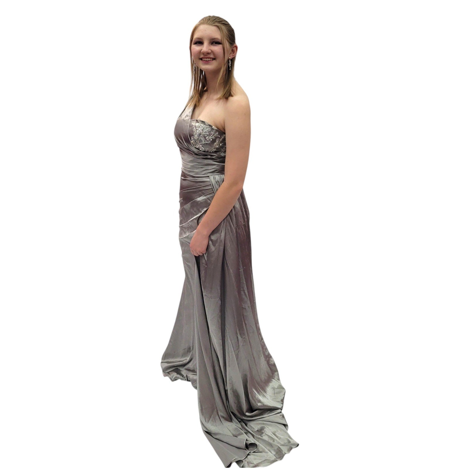One Shoulder Silky Satin Evening Gown with Full Corset Back and Side Train