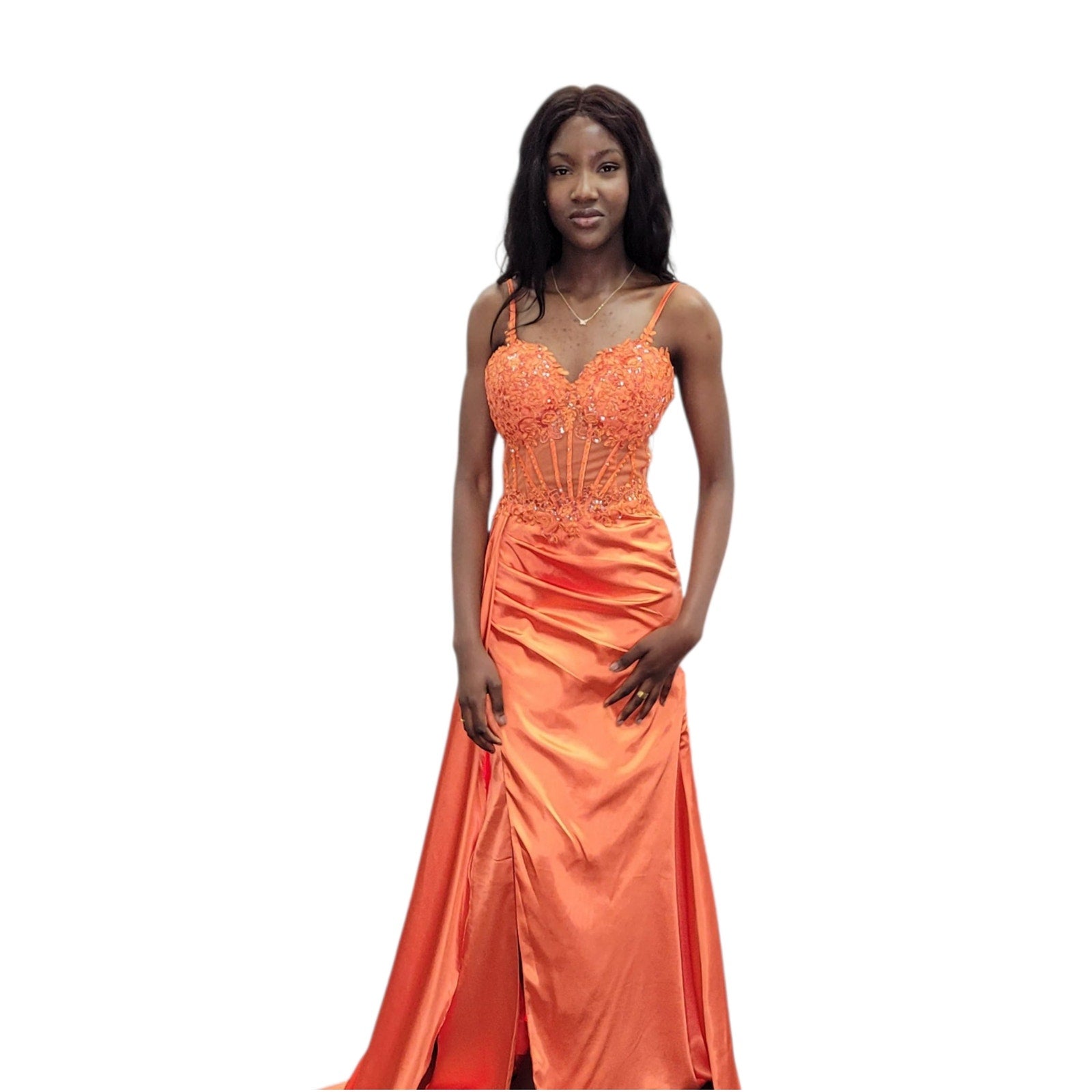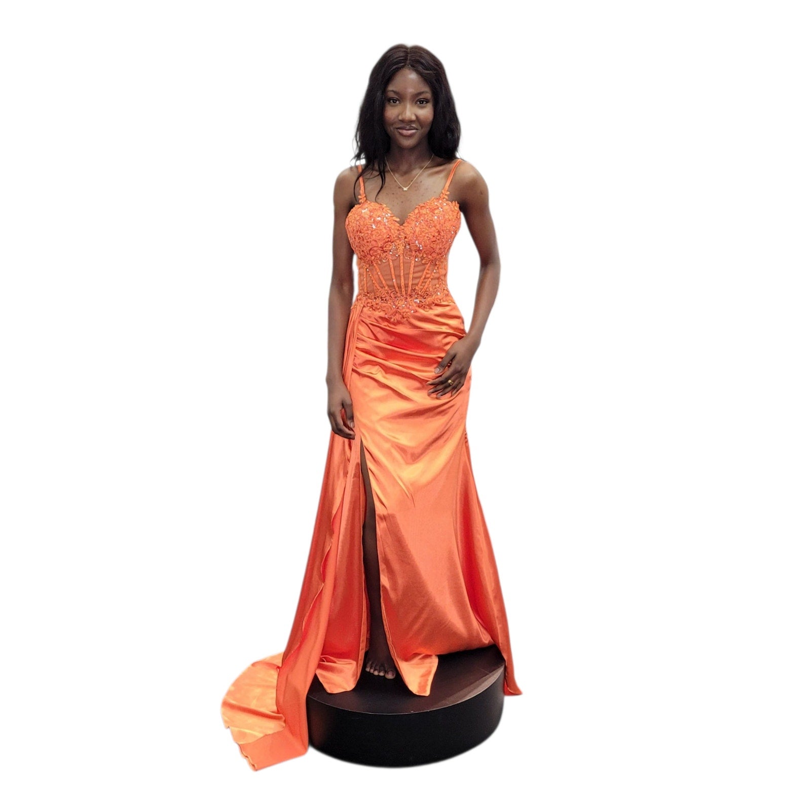 Orange Evening Gown with Detailed Bodice and Silky Satin Skirt