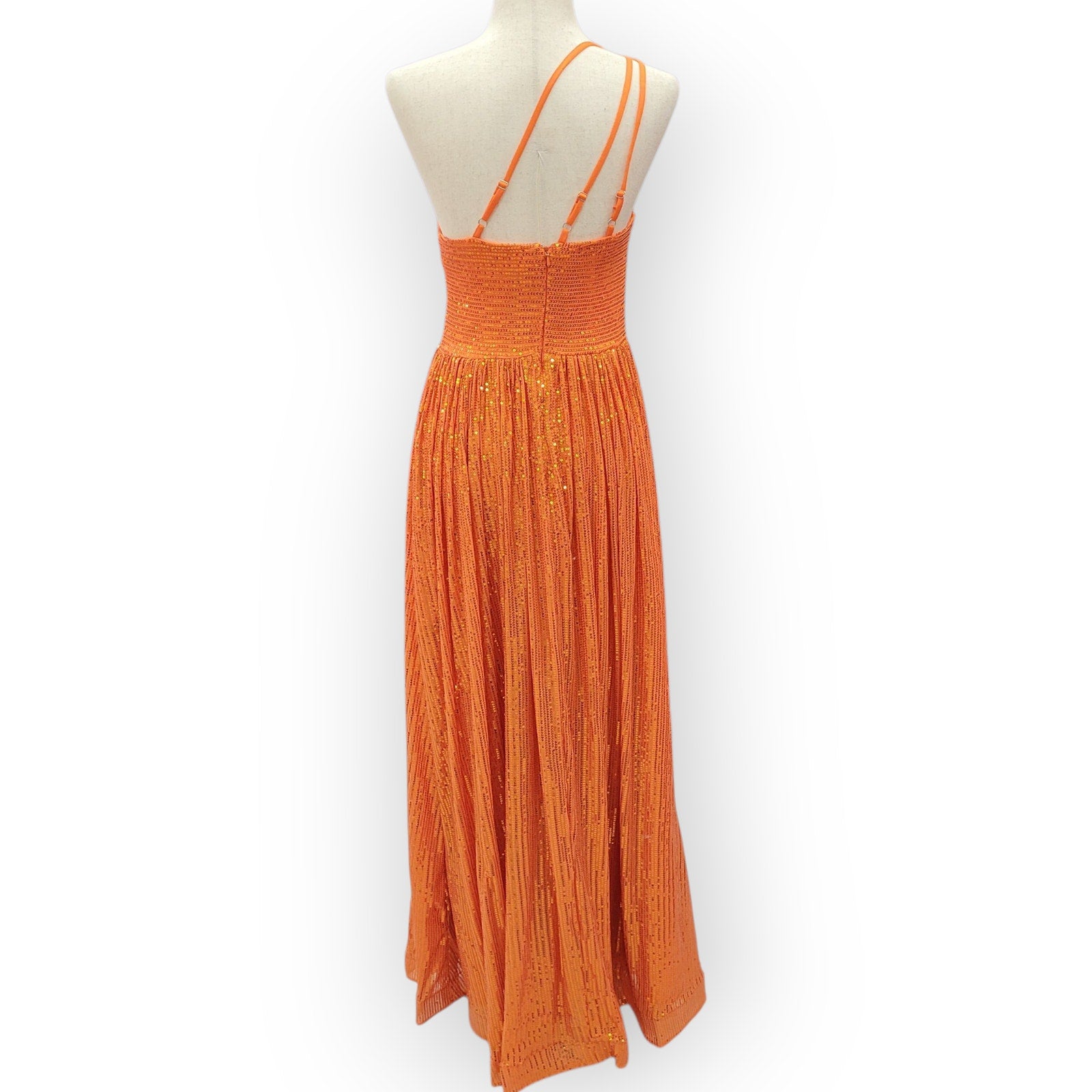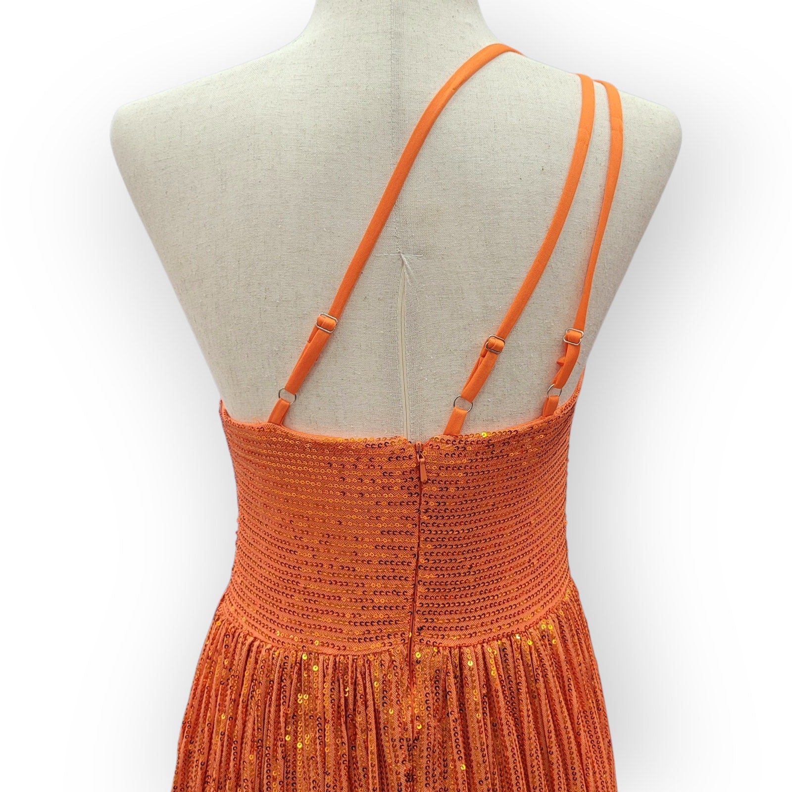 Orange One Shoulder A-Line Gown with Gathered Skirt and Three Straps Across Back
