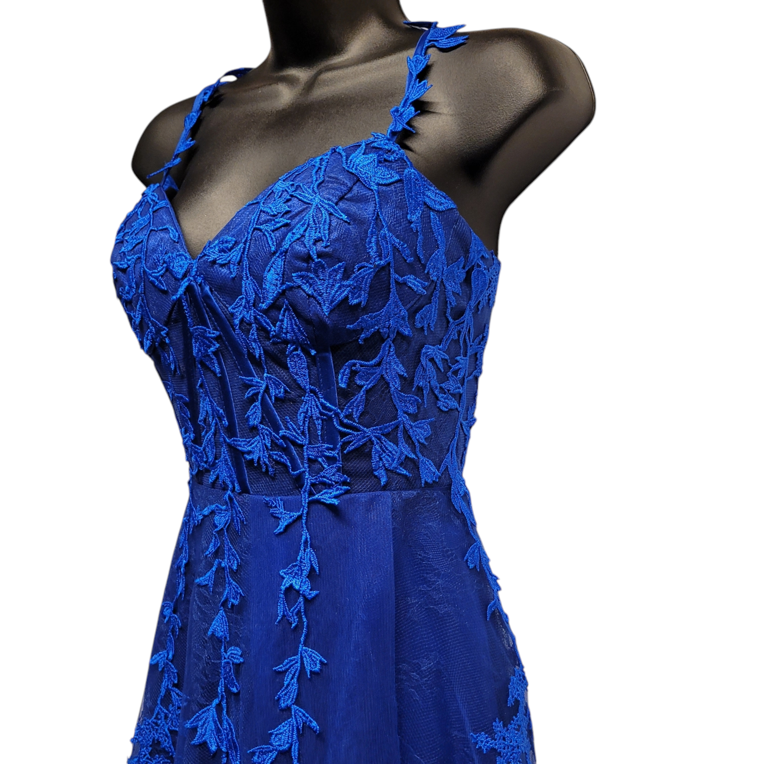 Beautiful sapphire gown with semi sheer bodice and an off center slit just above the knee. Flattering on most body types. Short corset back and short zipper in back. Adjustable straps.