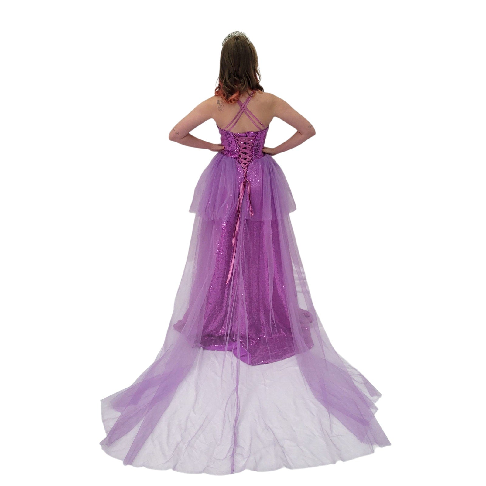 This beautiful dress features a flattering sweetheart neckline and alluring cross-back straps. The corset back ensures a perfect fit, accentuating your curves. The long tulle train adds a touch of elegance and drama. Make a grand entrance and turn heads in this unforgettable gown!