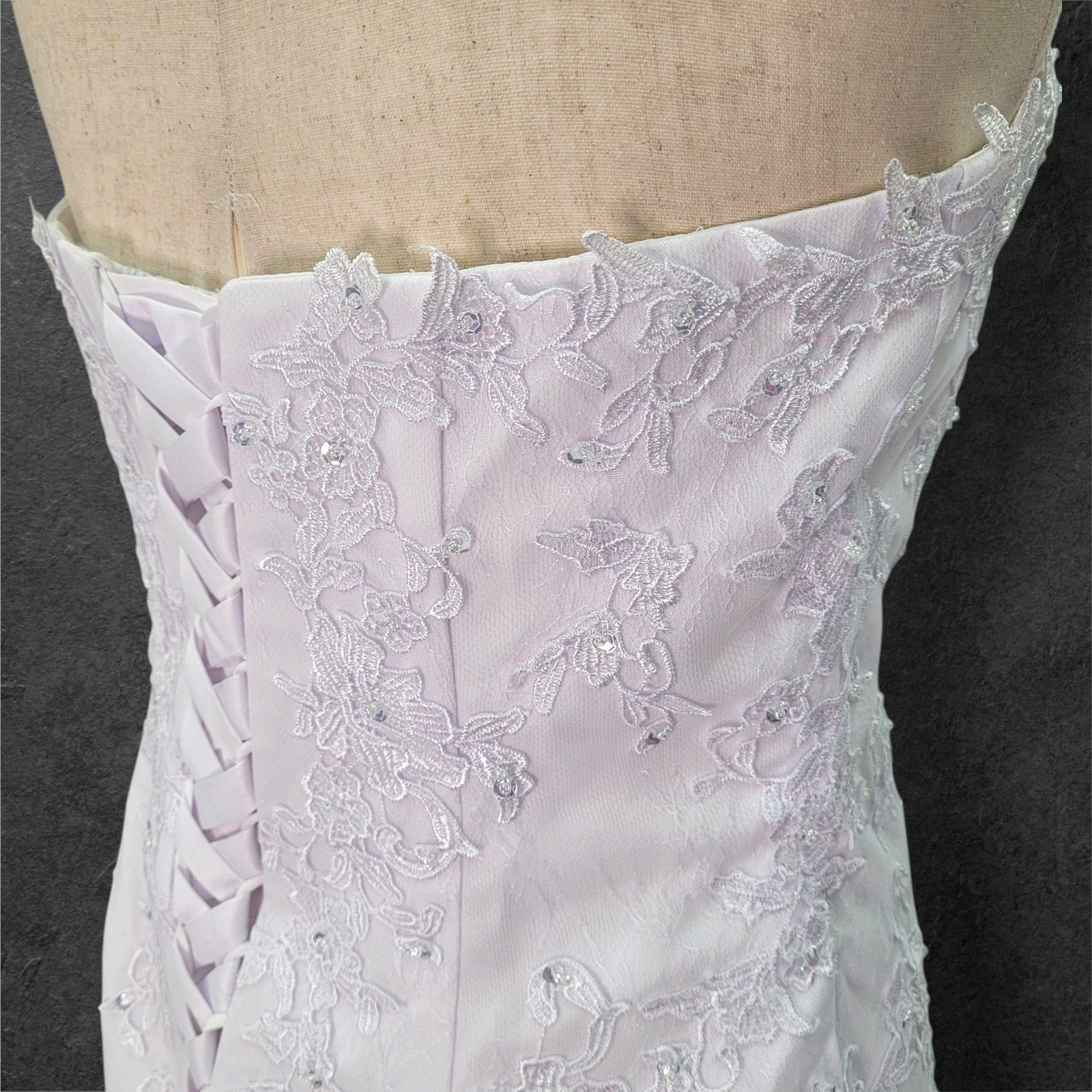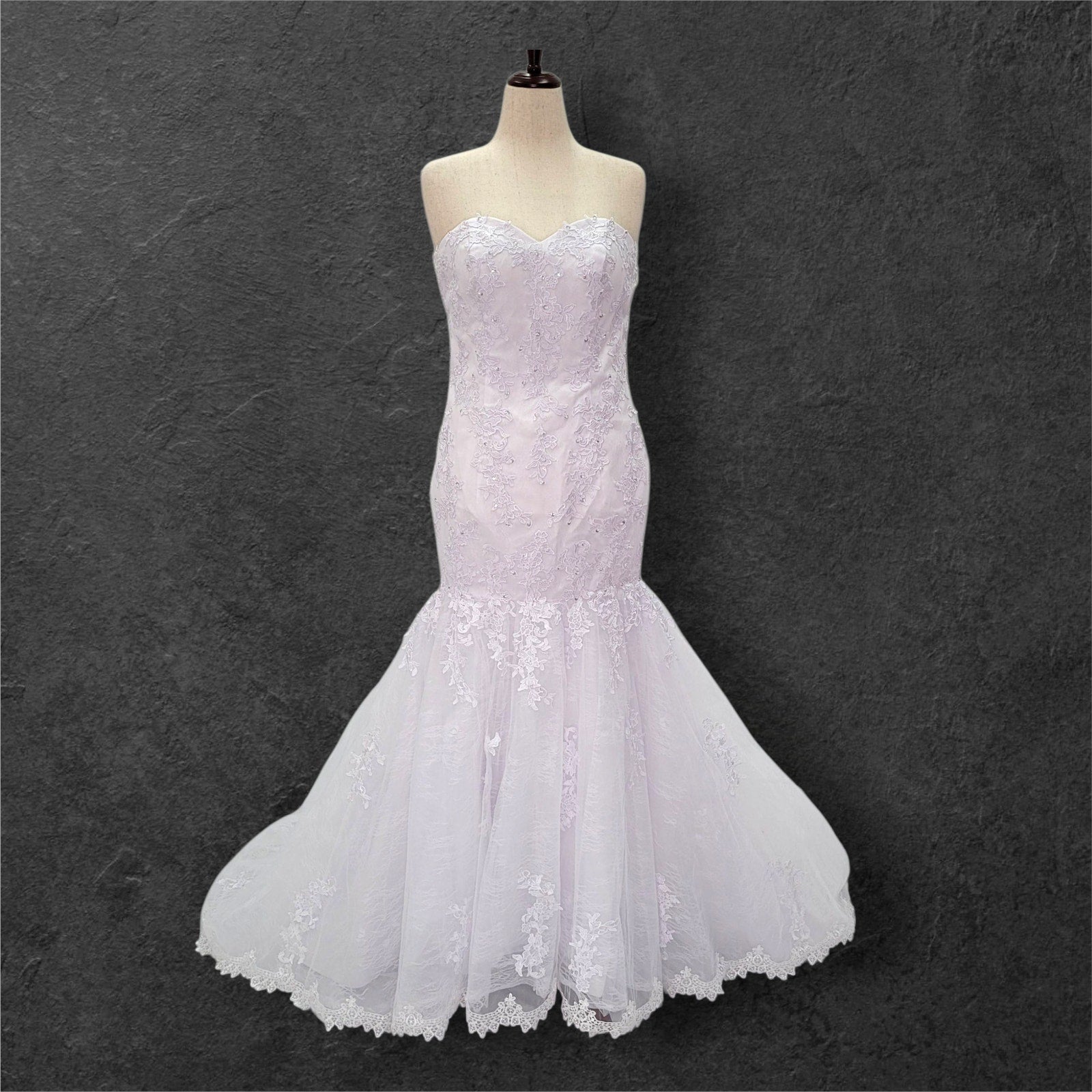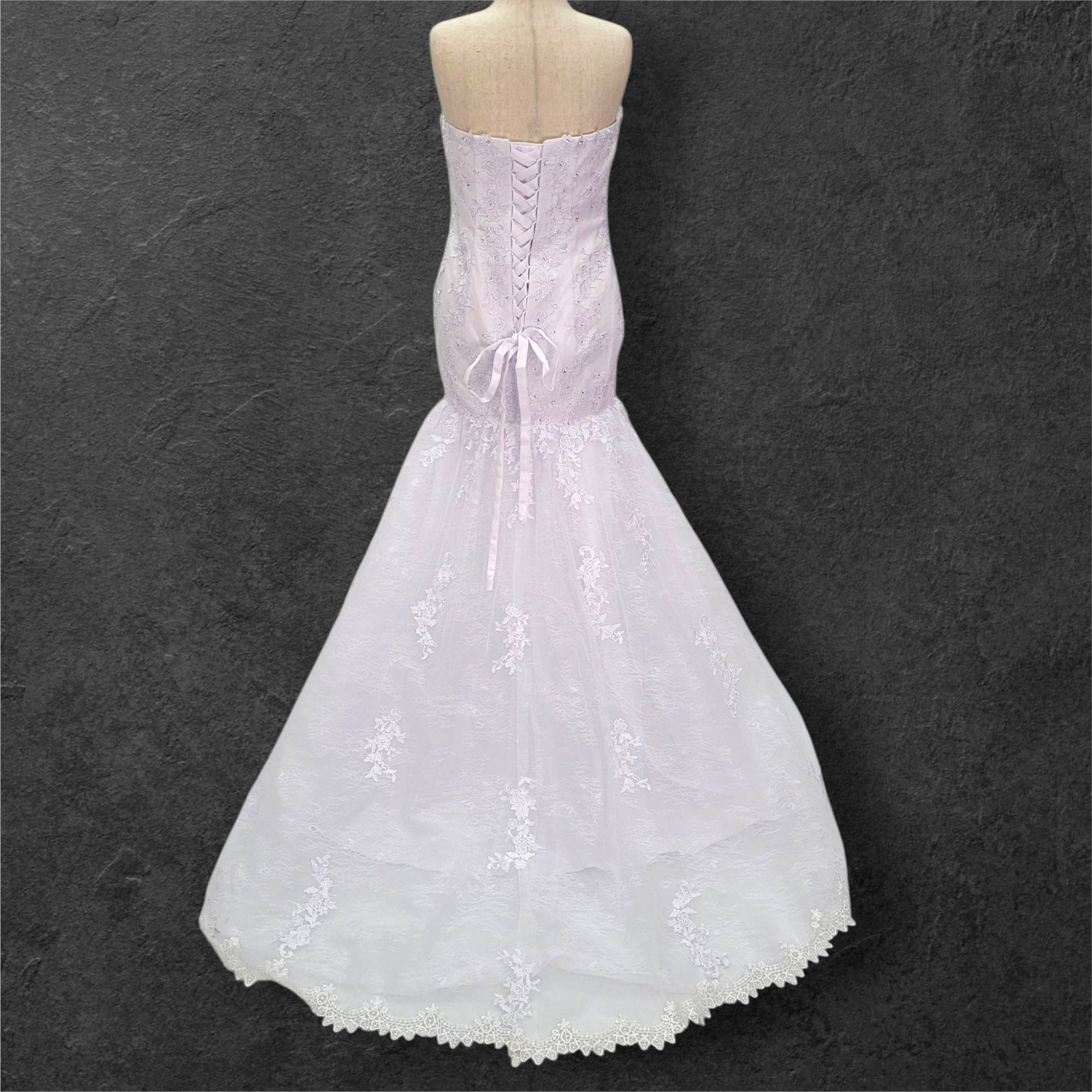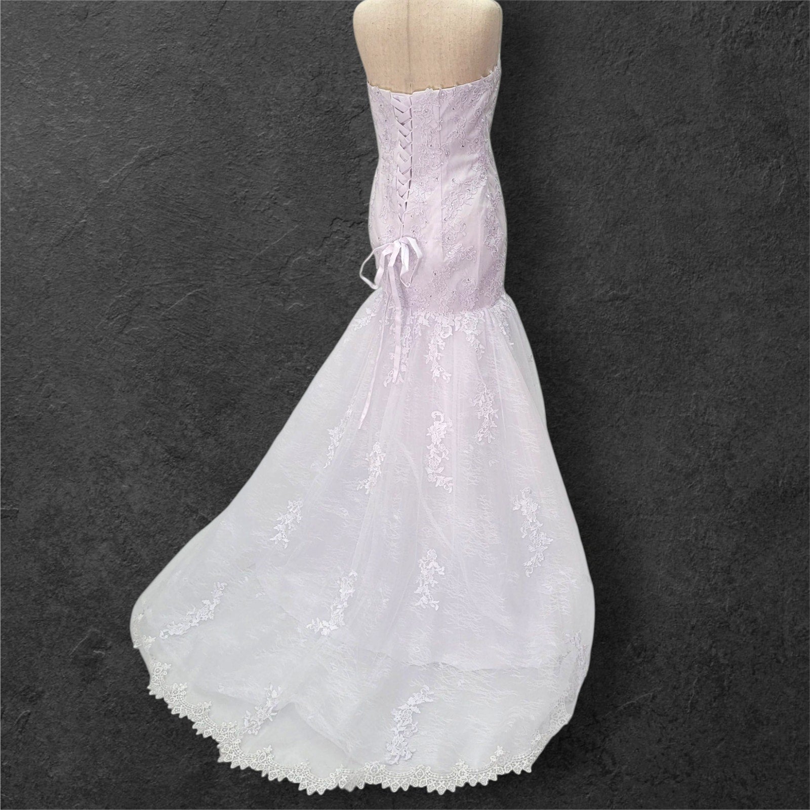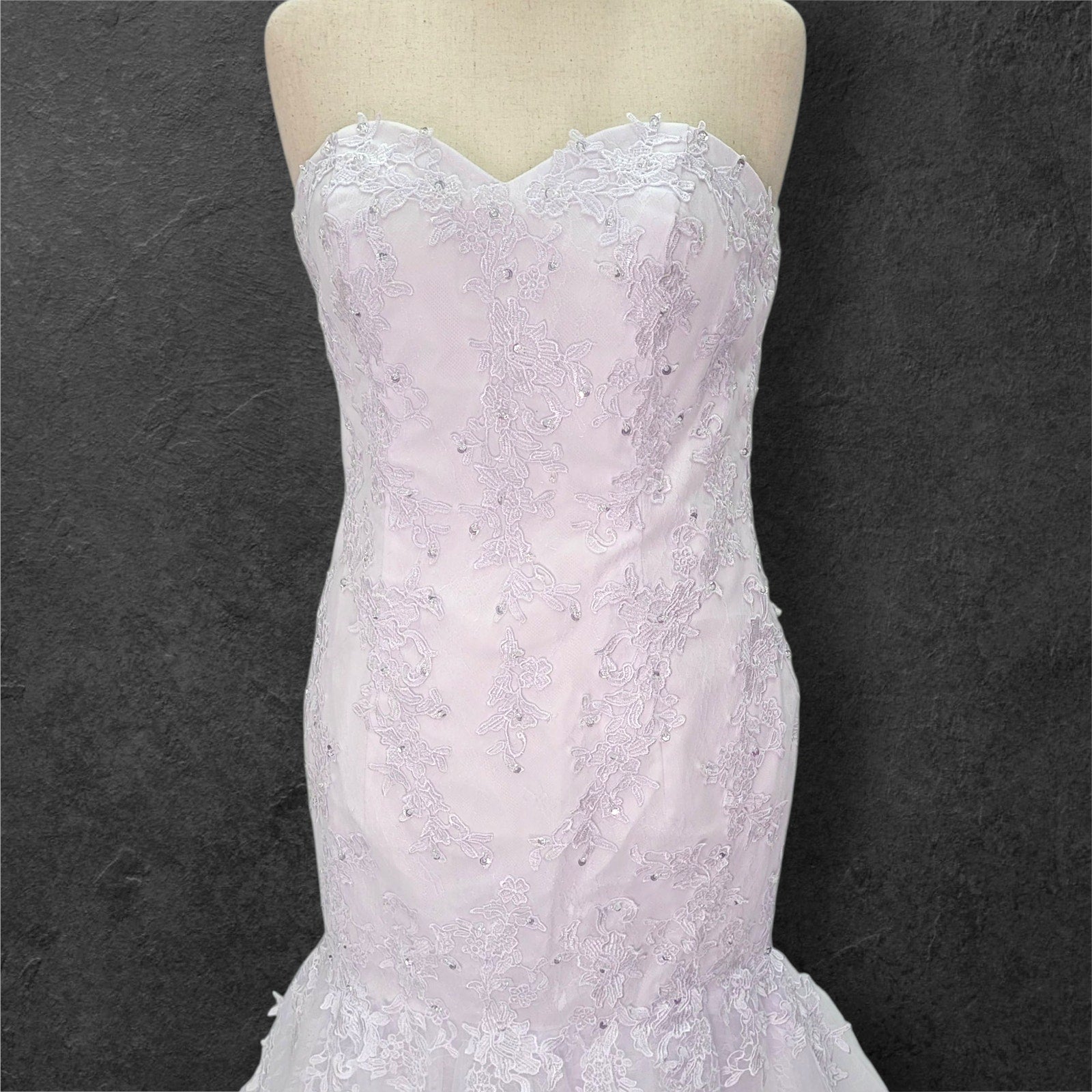 Stunning strapless trumpet style wedding dress. The bodice features a full corset and a sweetheart neckline, adorned with beautiful bead and sequin detailing. The full trumpet skirt creates a dramatic and elegant silhouette.