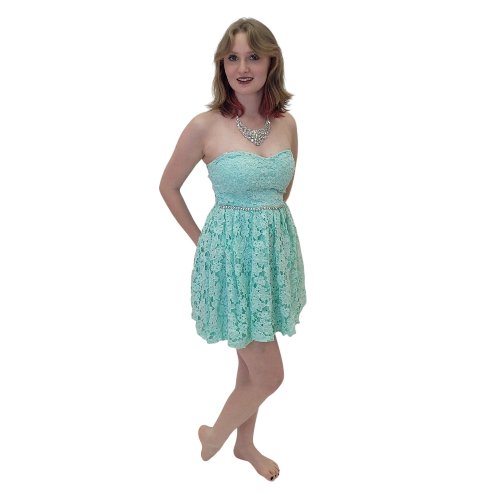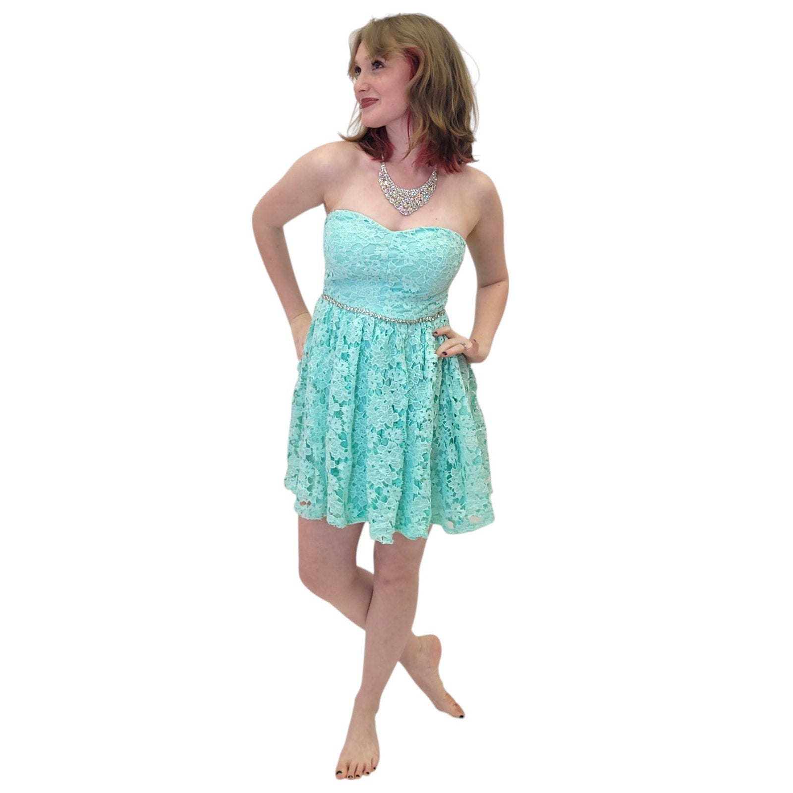 Stunning strapless turquoise lace cocktail dress, perfect for parties or special occasions. The intricate lace detailing adds a touch of elegance, while the short length keeps it fun and flirty. Make a statement at your next event with this beautiful dress! Grab it now!