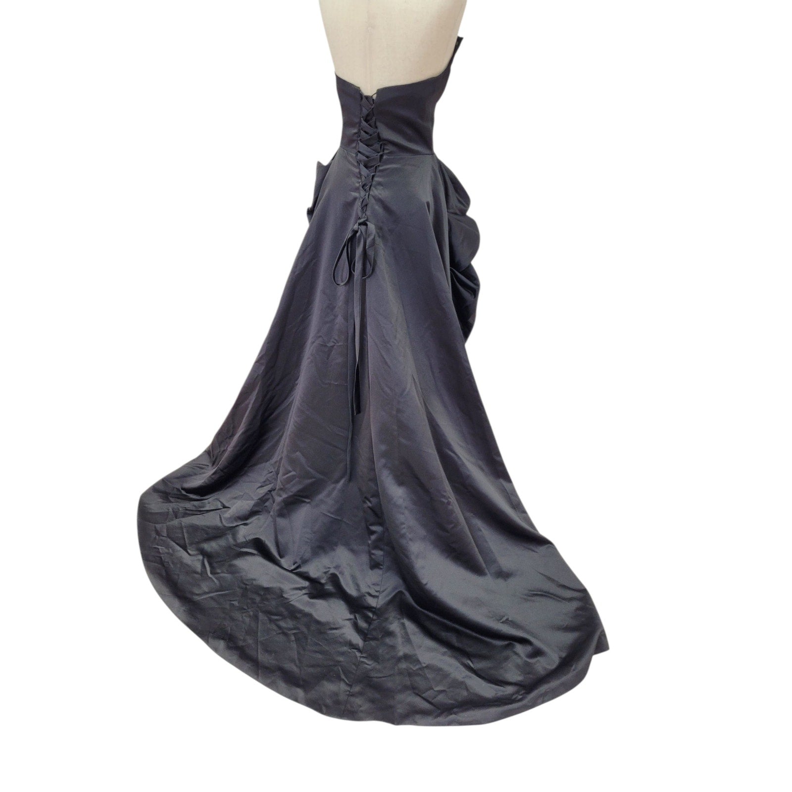 This stunning strapless black satin gown is perfect for your next formal event! The elegant pickups and a corset back add a touch of drama and sophistication. You'll be sure to turn heads in this amazing dress!