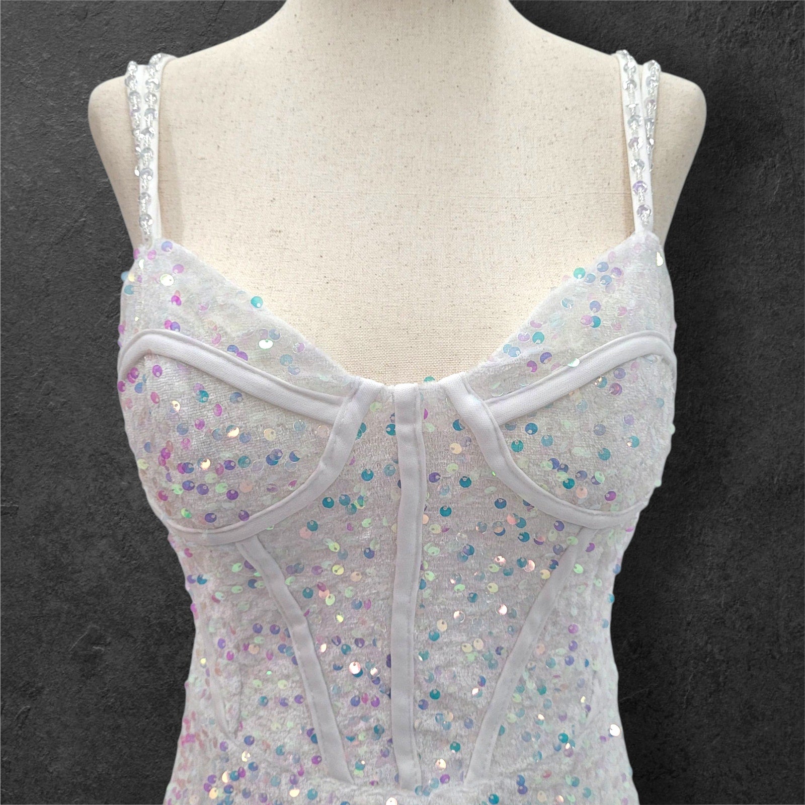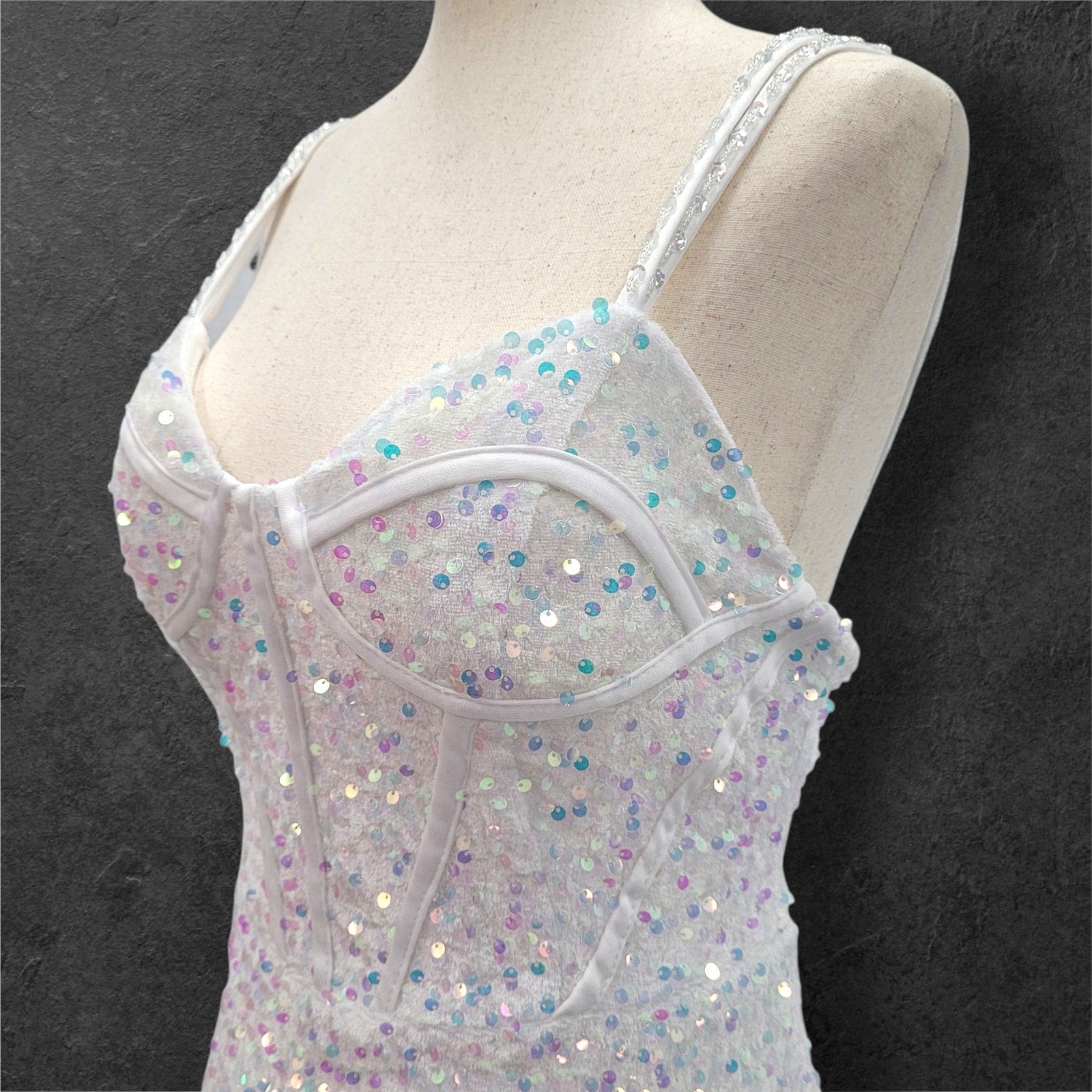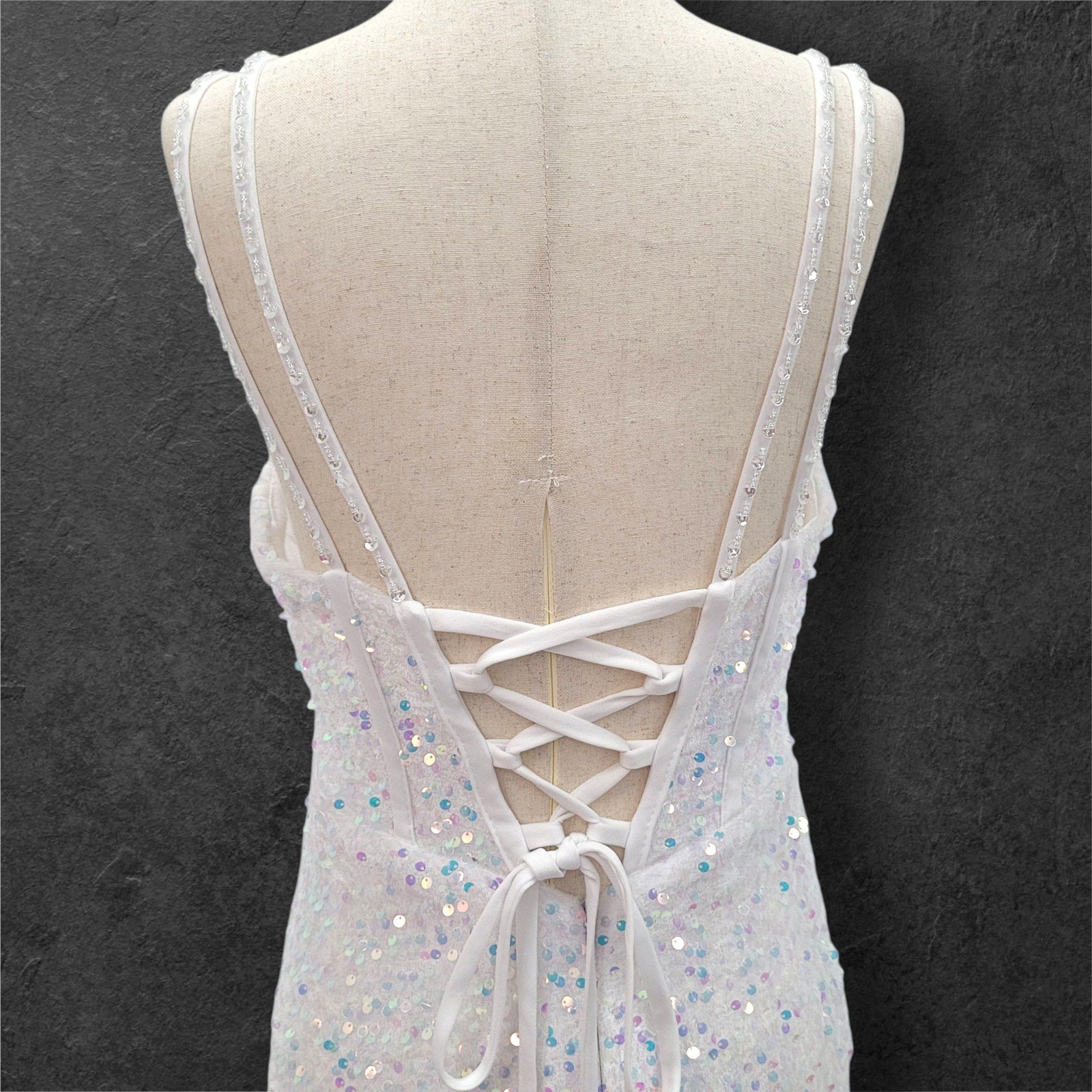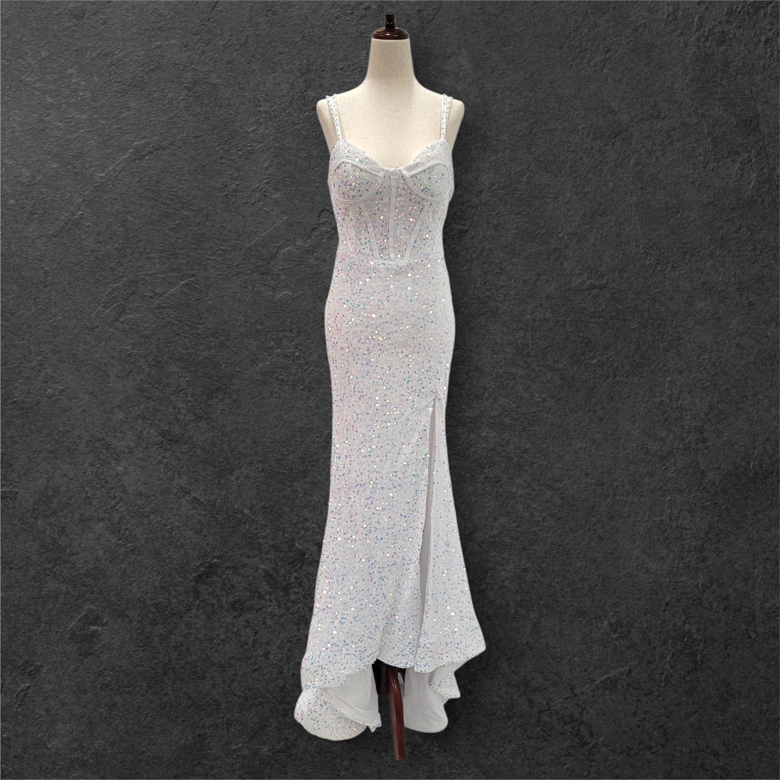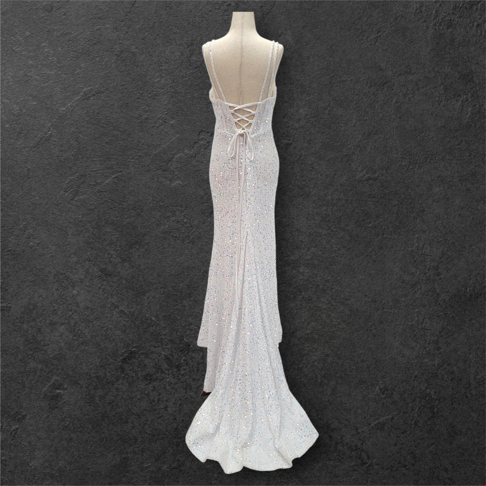 This stunning white gown is sure to turn heads! It features iridescent sequins that catch the light beautifully and a dramatic train for added elegance. The corset back ensures a perfect fit, while the double spaghetti straps add a unique and stylish touch. Perfect for a wedding, prom, pageant, or any special occasion.
