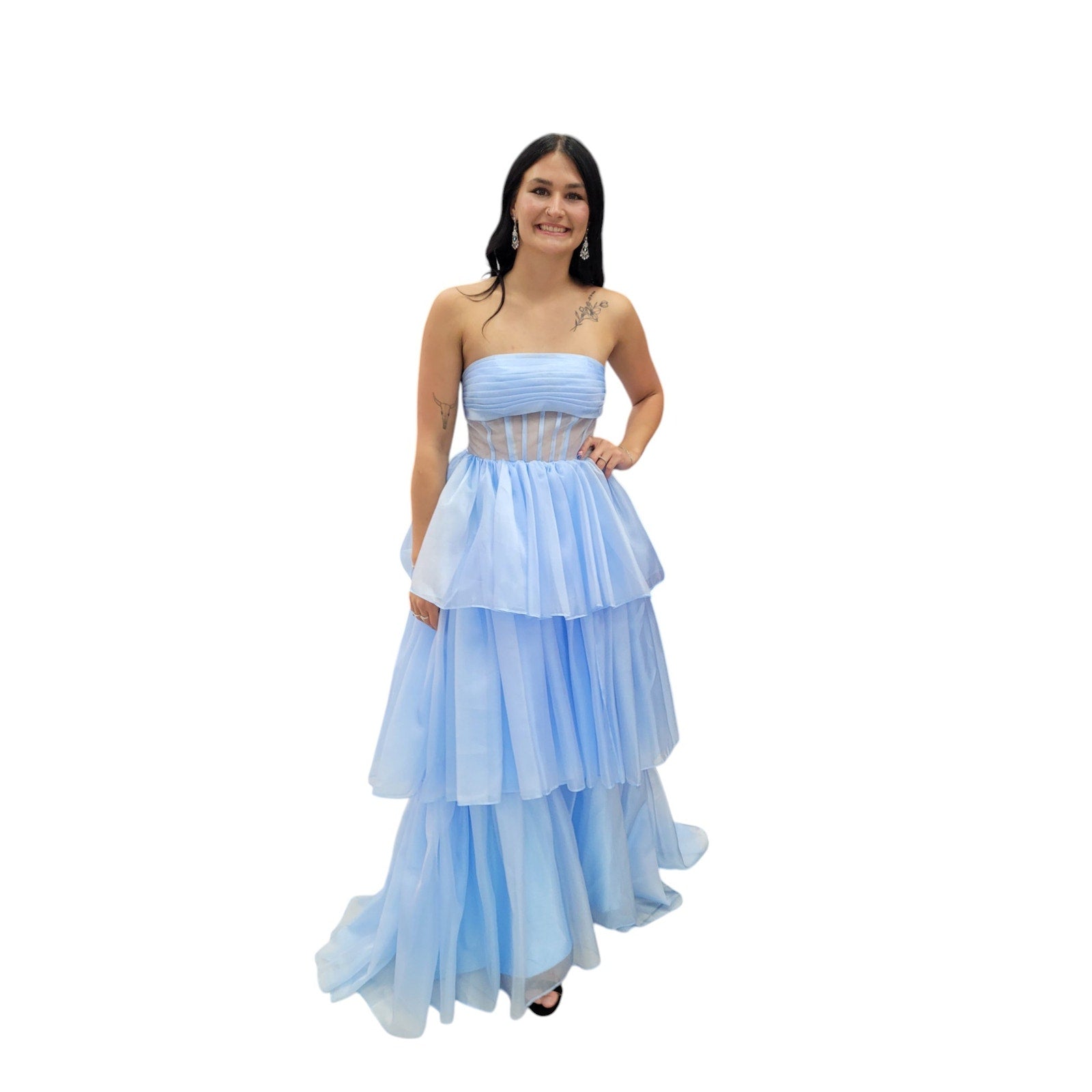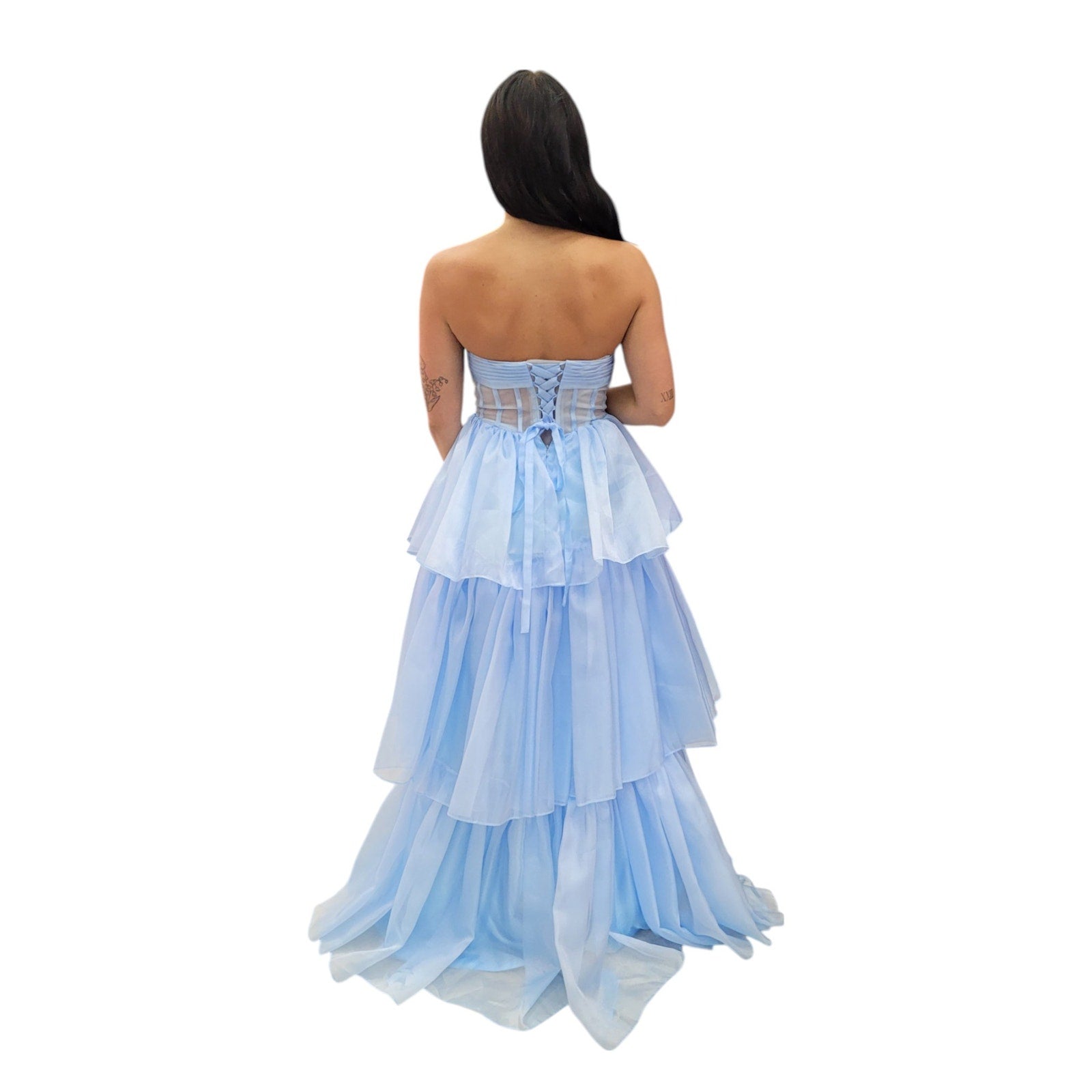 This stunning tiered strapless formal gown is sure to turn heads! The semi-sheer bodice adds a touch of elegance and allure. Perfect for any special occasion, this gown will make you feel like a princess. The tiered design creates a beautiful silhouette, while the strapless cut allows you to show off your shoulders. The semi-sheer bodice adds a hint of mystery, making this gown both sophisticated and captivating.