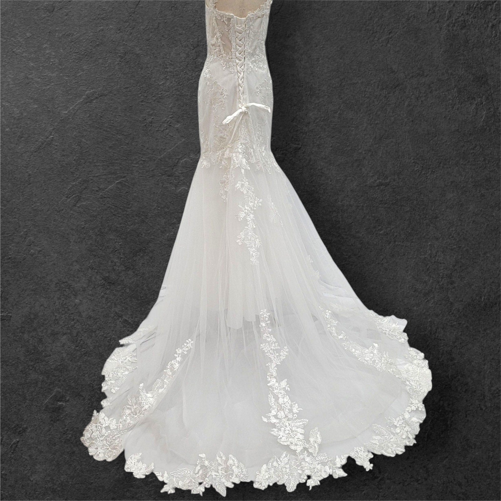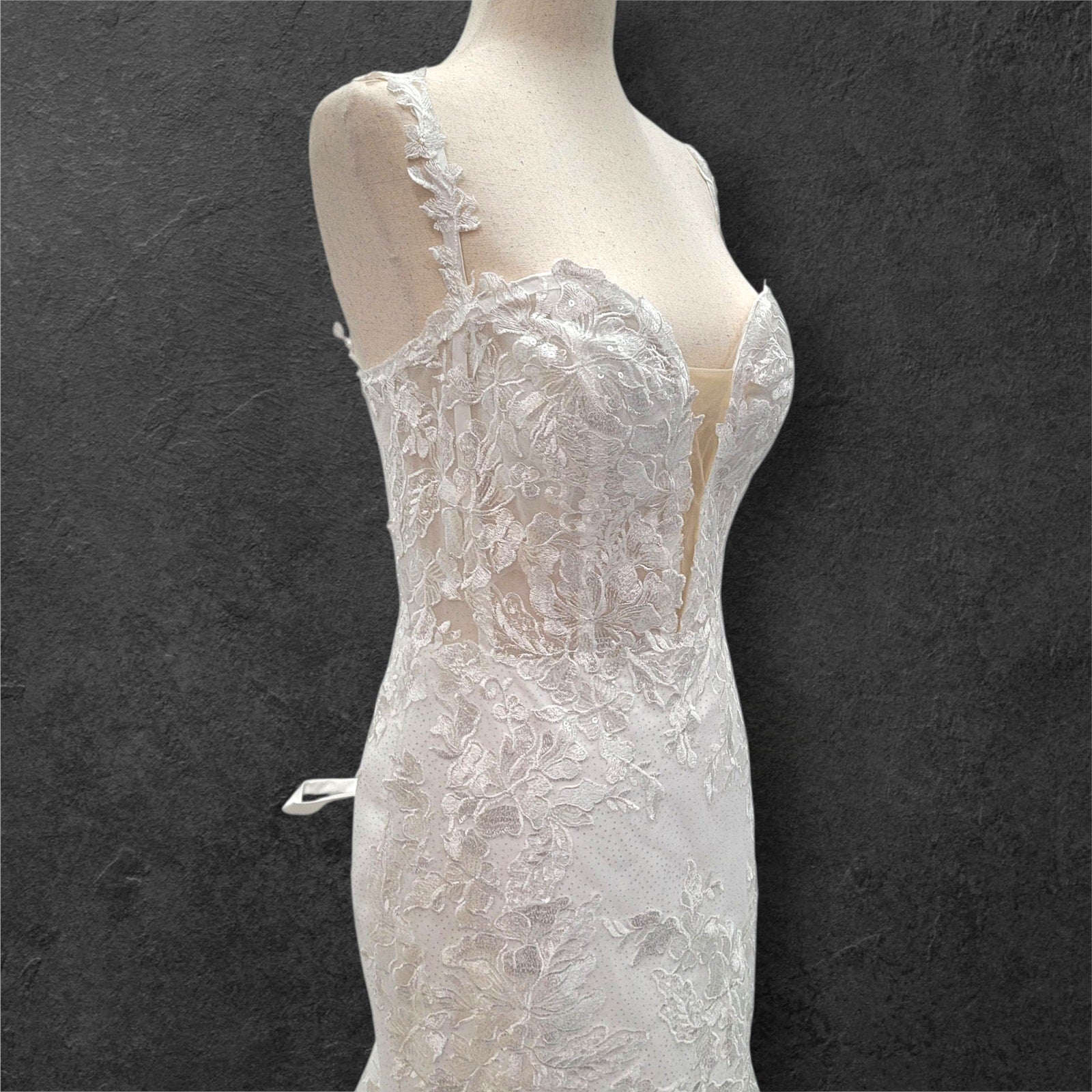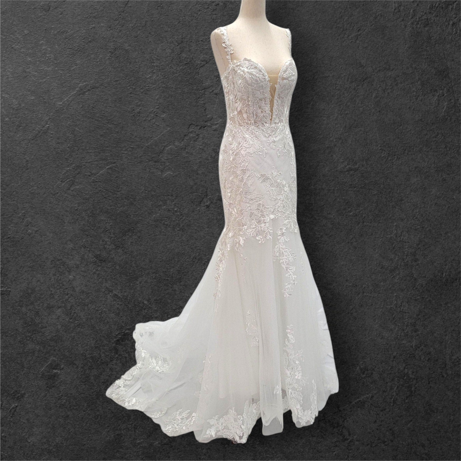Stunning trumpet style wedding dress, perfect for making a memorable statement on your special day! The dress features delicate floral appliques that add a touch of romance and elegance. The corset back not only ensures a perfect fit but also adds a touch of classic charm. Adorned with subtle sequins, this gown offers a hint of sparkle without being overwhelming. The deep plunging neckline adds a modern, sophisticated edge, making this dress a beautiful blend of tradition and contemporary style. This dress is bound to make you feel radiant and unforgettable as you walk down the aisle!