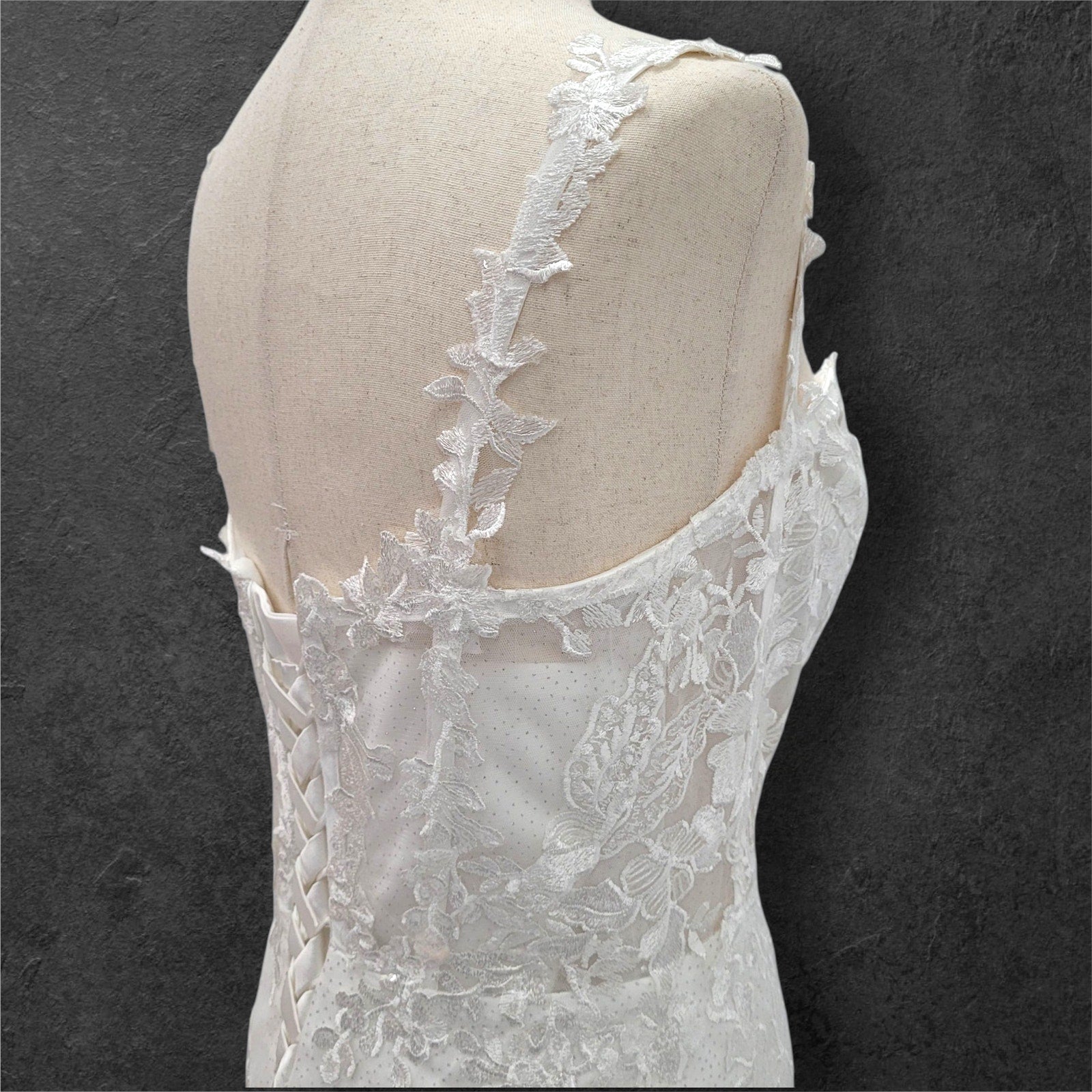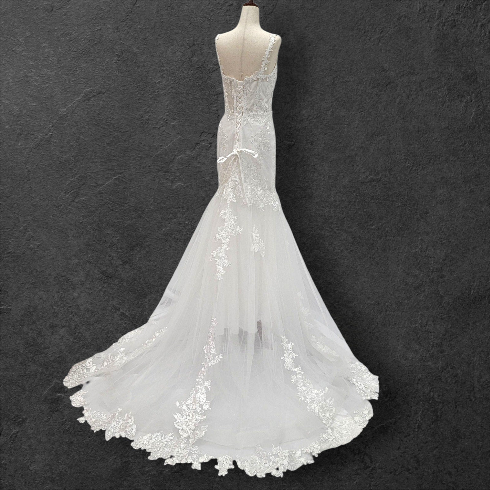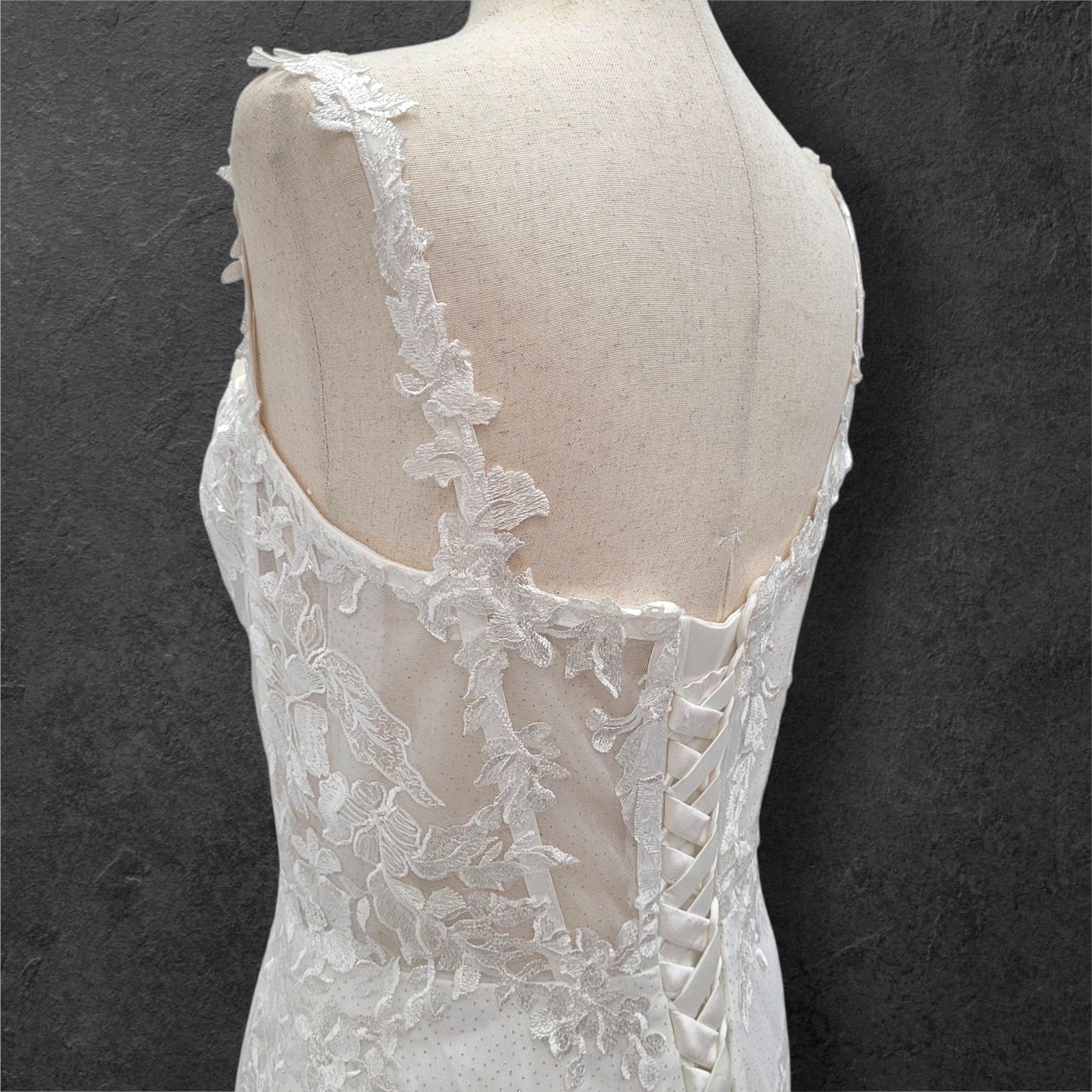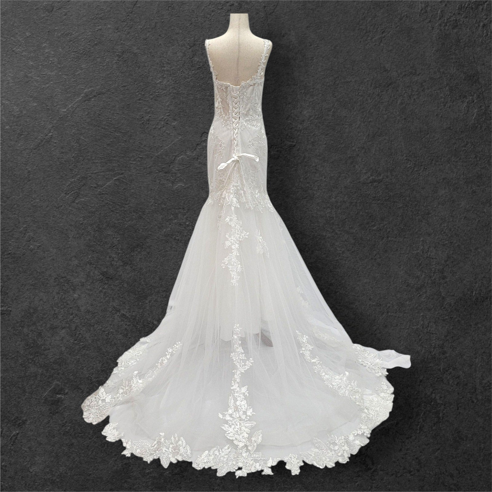 Stunning trumpet style wedding dress, perfect for making a memorable statement on your special day! The dress features delicate floral appliques that add a touch of romance and elegance. The corset back not only ensures a perfect fit but also adds a touch of classic charm. Adorned with subtle sequins, this gown offers a hint of sparkle without being overwhelming. The deep plunging neckline adds a modern, sophisticated edge, making this dress a beautiful blend of tradition and contemporary style. This dress is bound to make you feel radiant and unforgettable as you walk down the aisle!