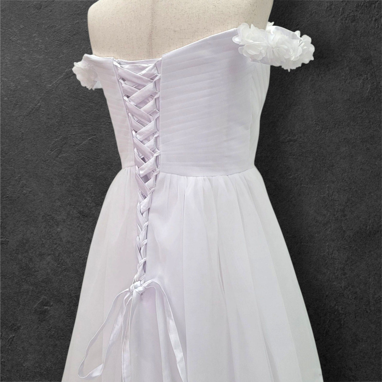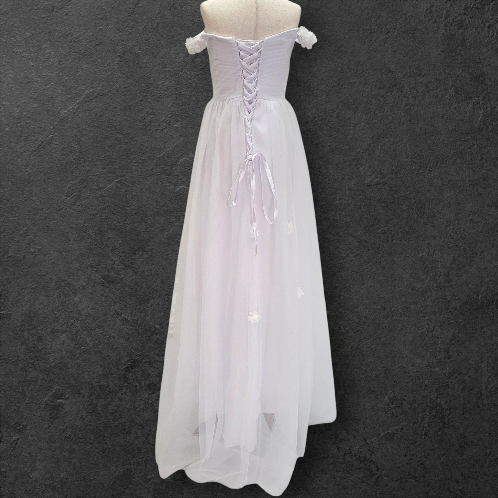 Stunning tulle wedding dress, perfect for your special day! The delicate floral neckline and sleeves add a touch of romance, while the corset back ensures a flattering fit.