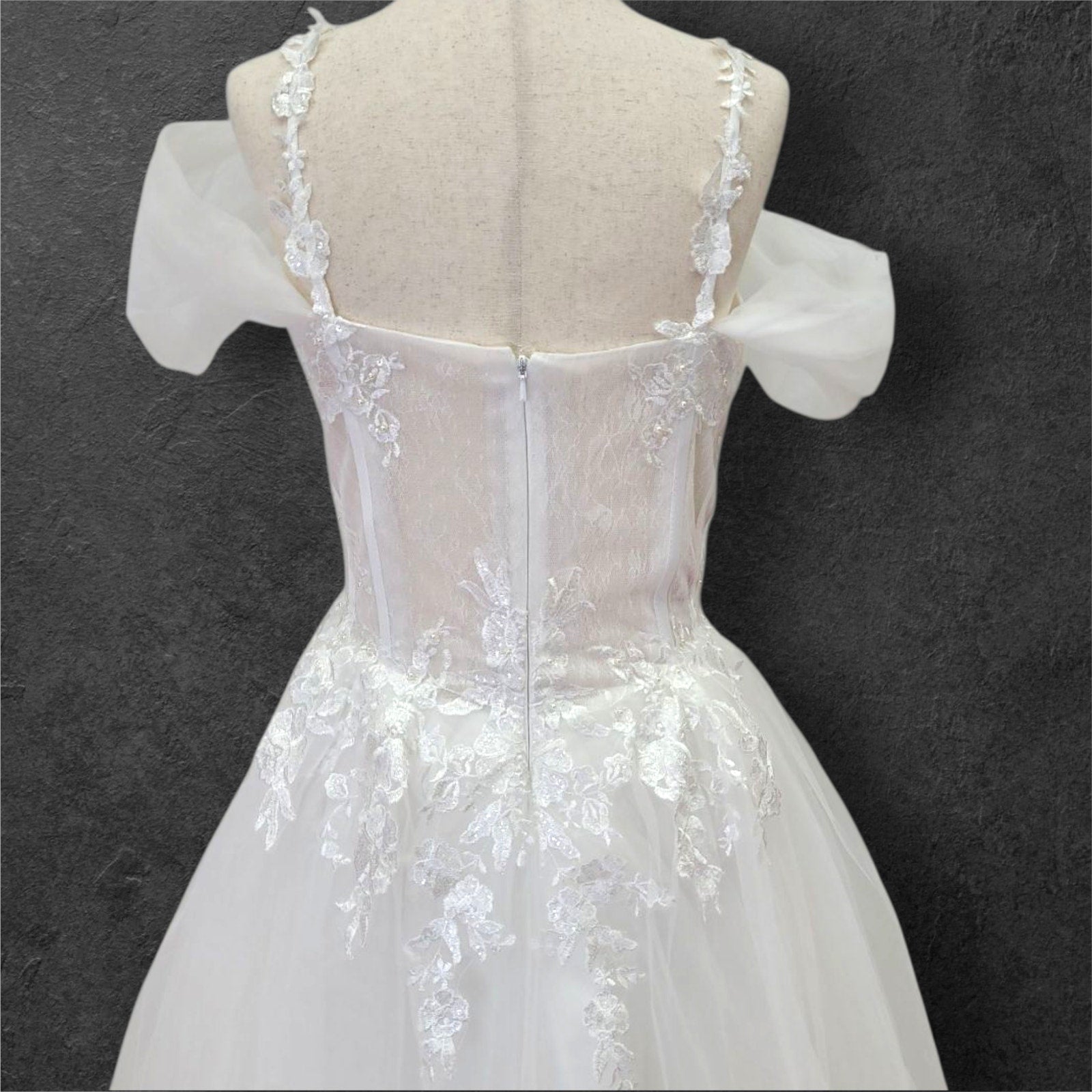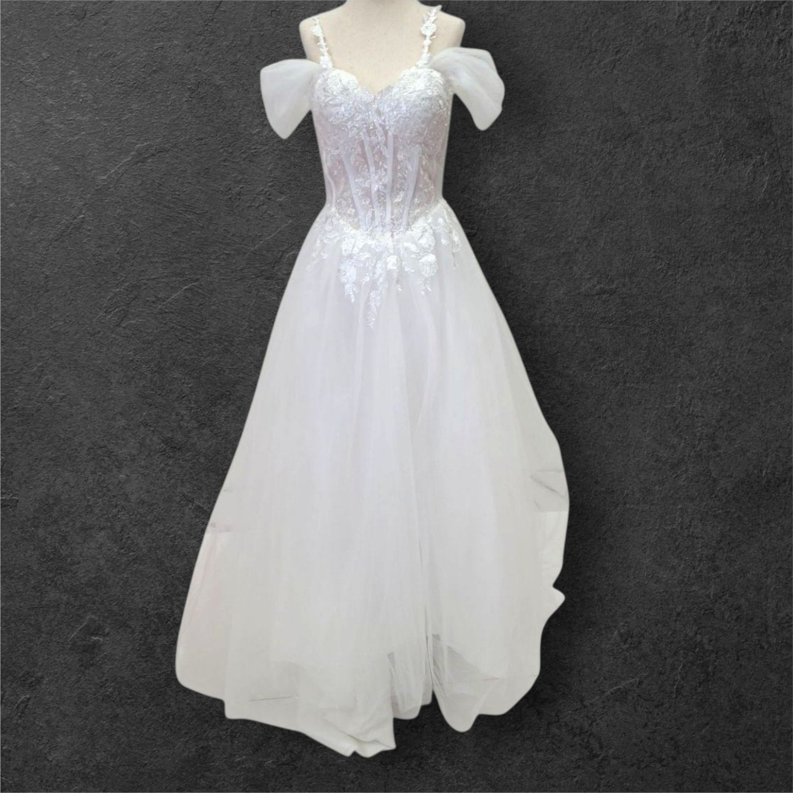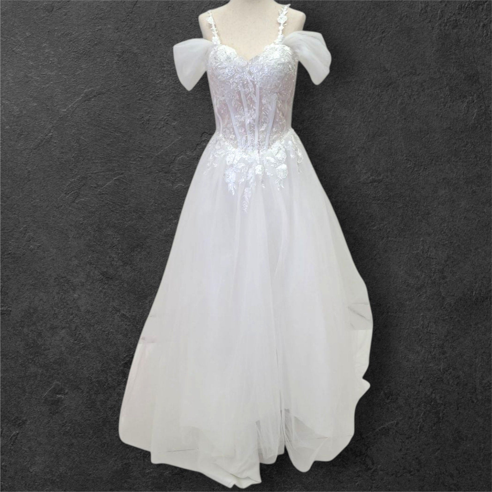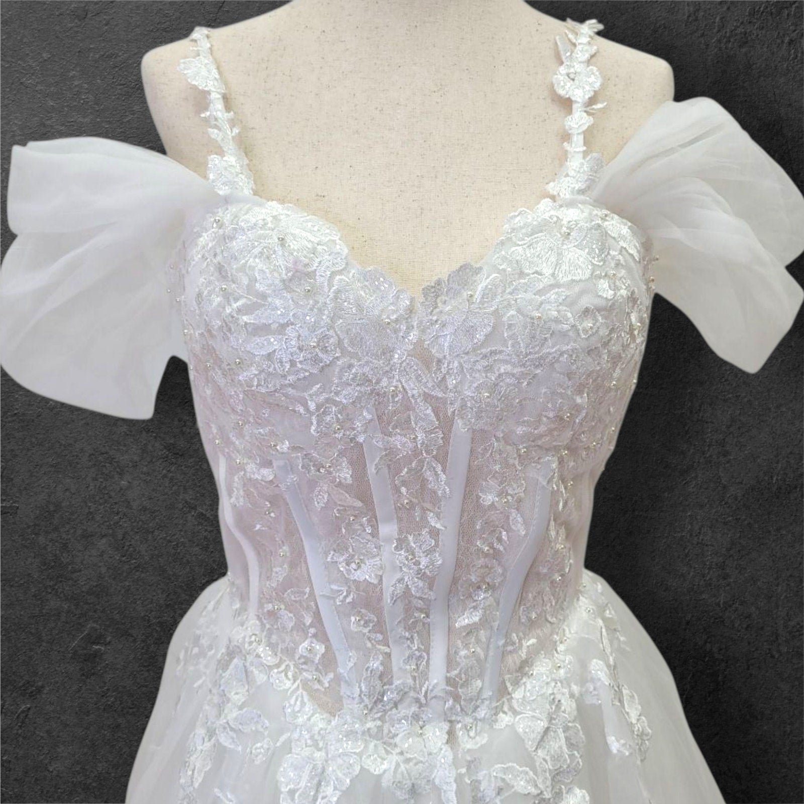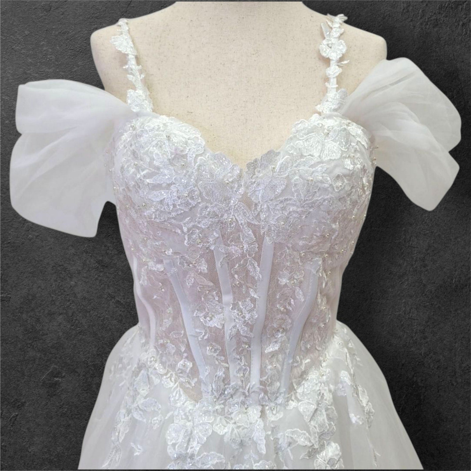 This exquisite ballgown wedding dress embodies timeless romance with its architectural bodice featuring visible boning for structure and support. Delicate off-shoulder tulle sleeves float gracefully alongside slender spaghetti straps, while intricate appliques adorn the silhouette with artisanal precision. The voluminous tulle skirt cascades elegantly to create a captivating silhouette worthy of your most cherished occasion.