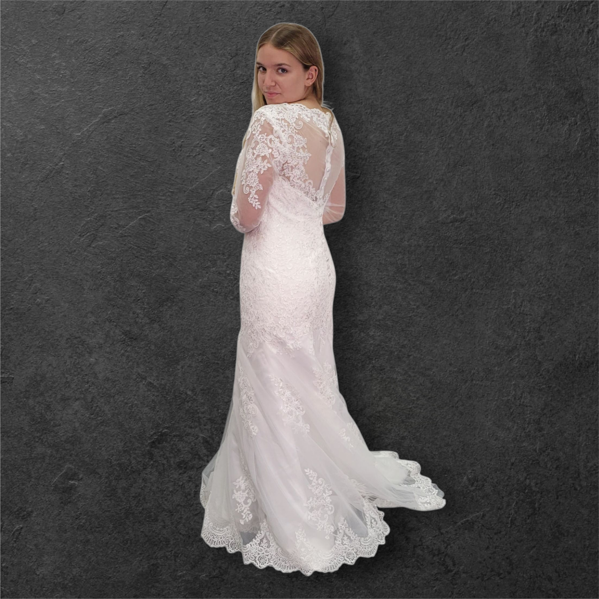 Exquisitely crafted for the discerning bride, this trumpet style wedding dress combines timeless elegance with modern, modest sophistication. The high neckline offers a reserved yet striking silhouette, while the long sleeves provide graceful coverage. The defining trumpet silhouette gently flares from the knee, creating a dramatic entrance. Intricate embroidery adorns the entire gown, showcasing meticulous artisanship and adding dimensional texture that catches the light with every movement. A perfect choice for the bride seeking refined glamour with architectural precision.