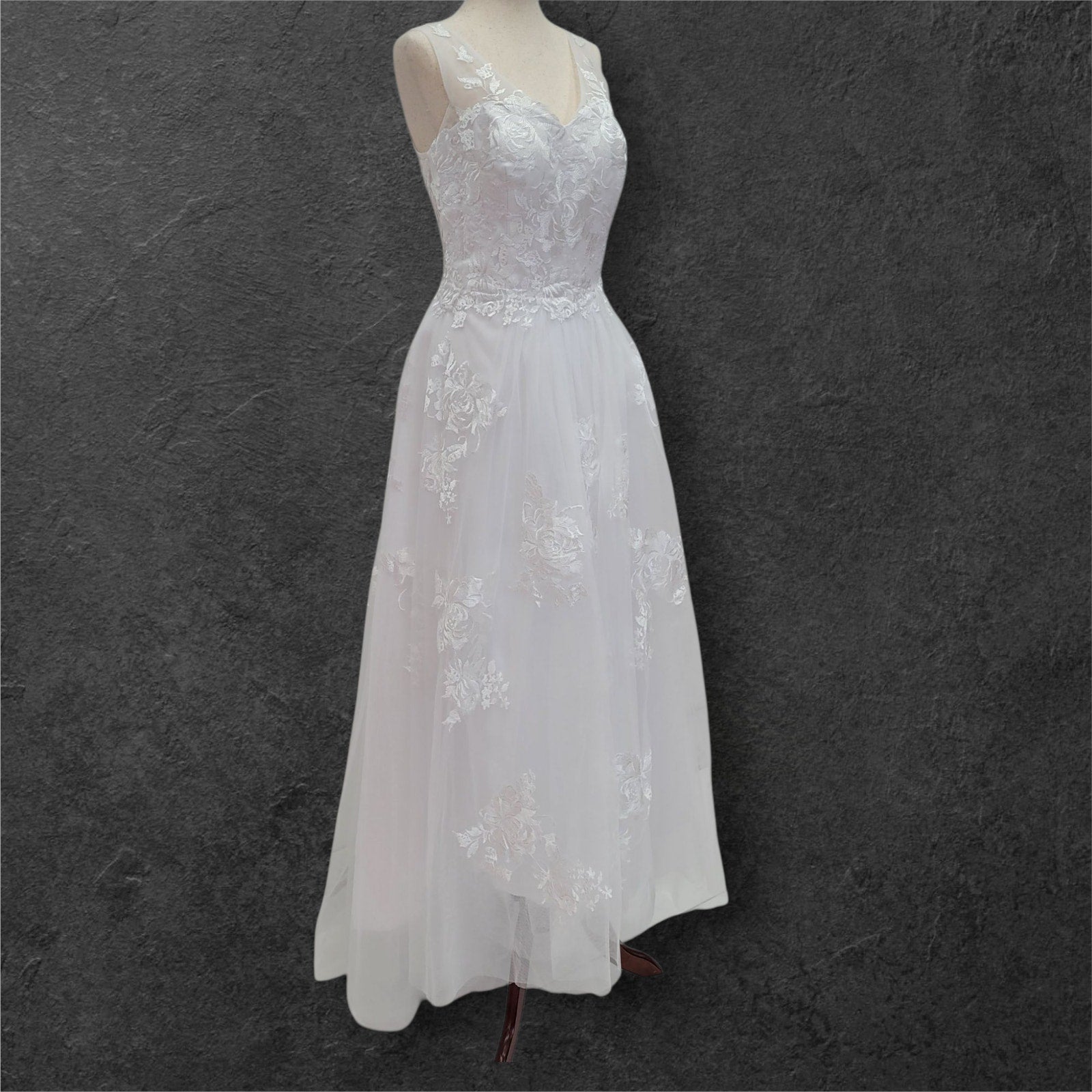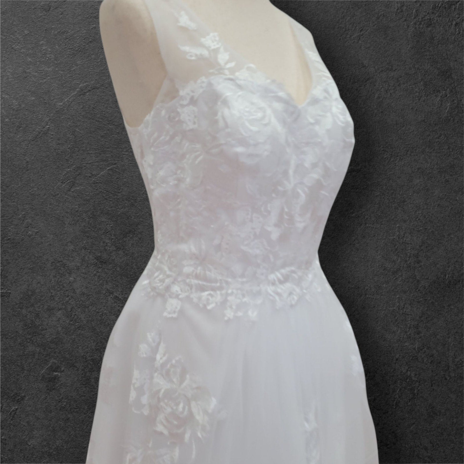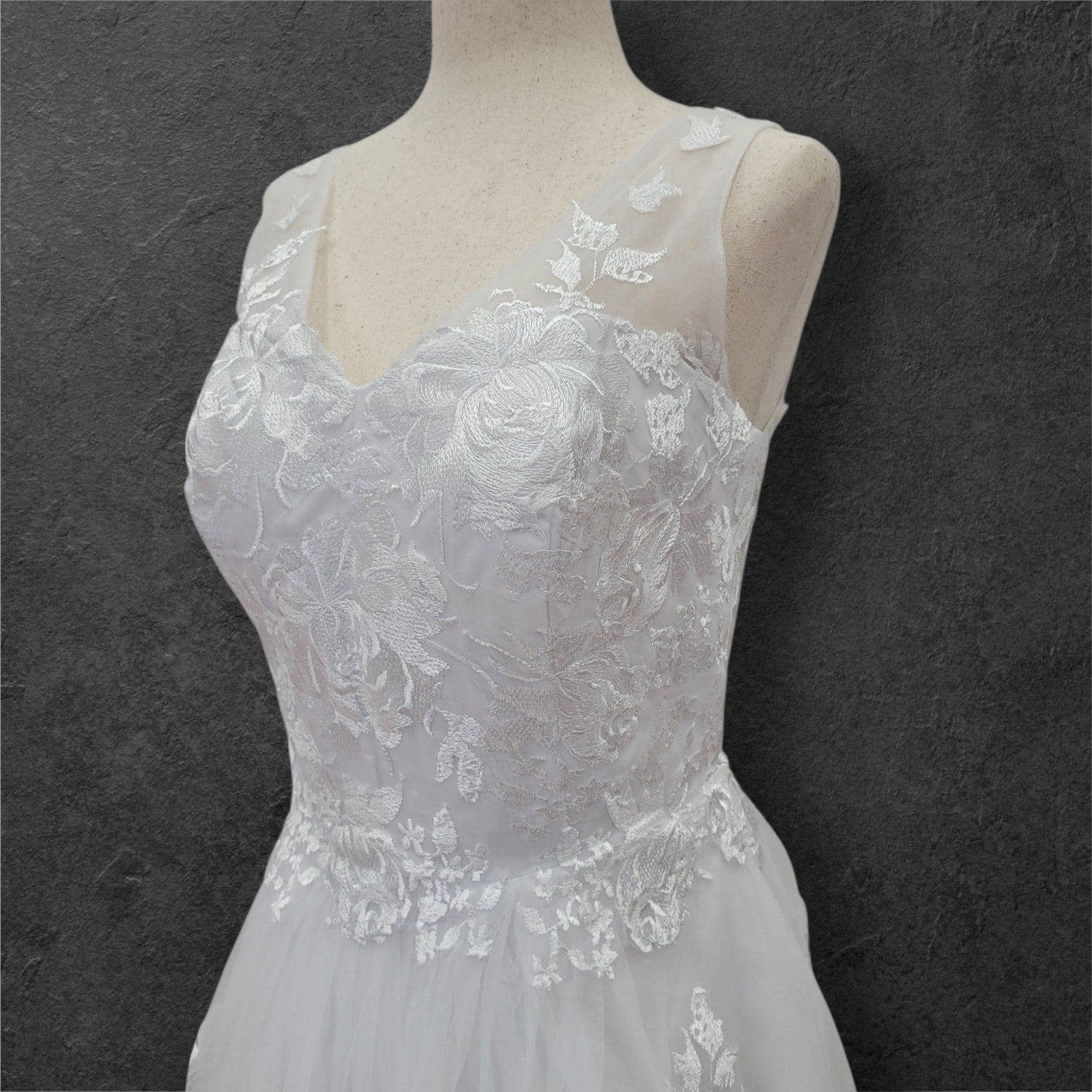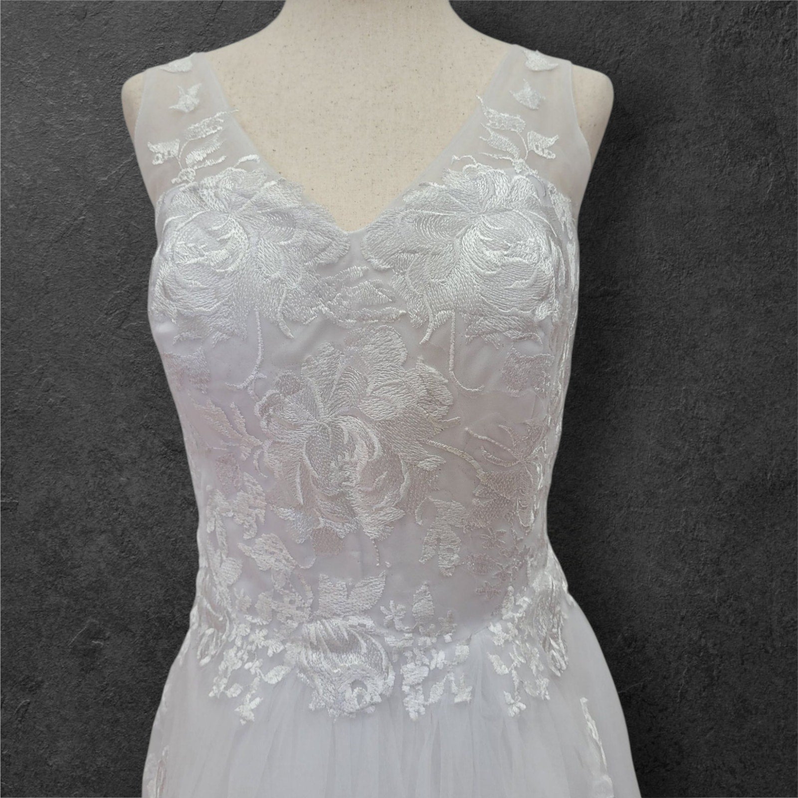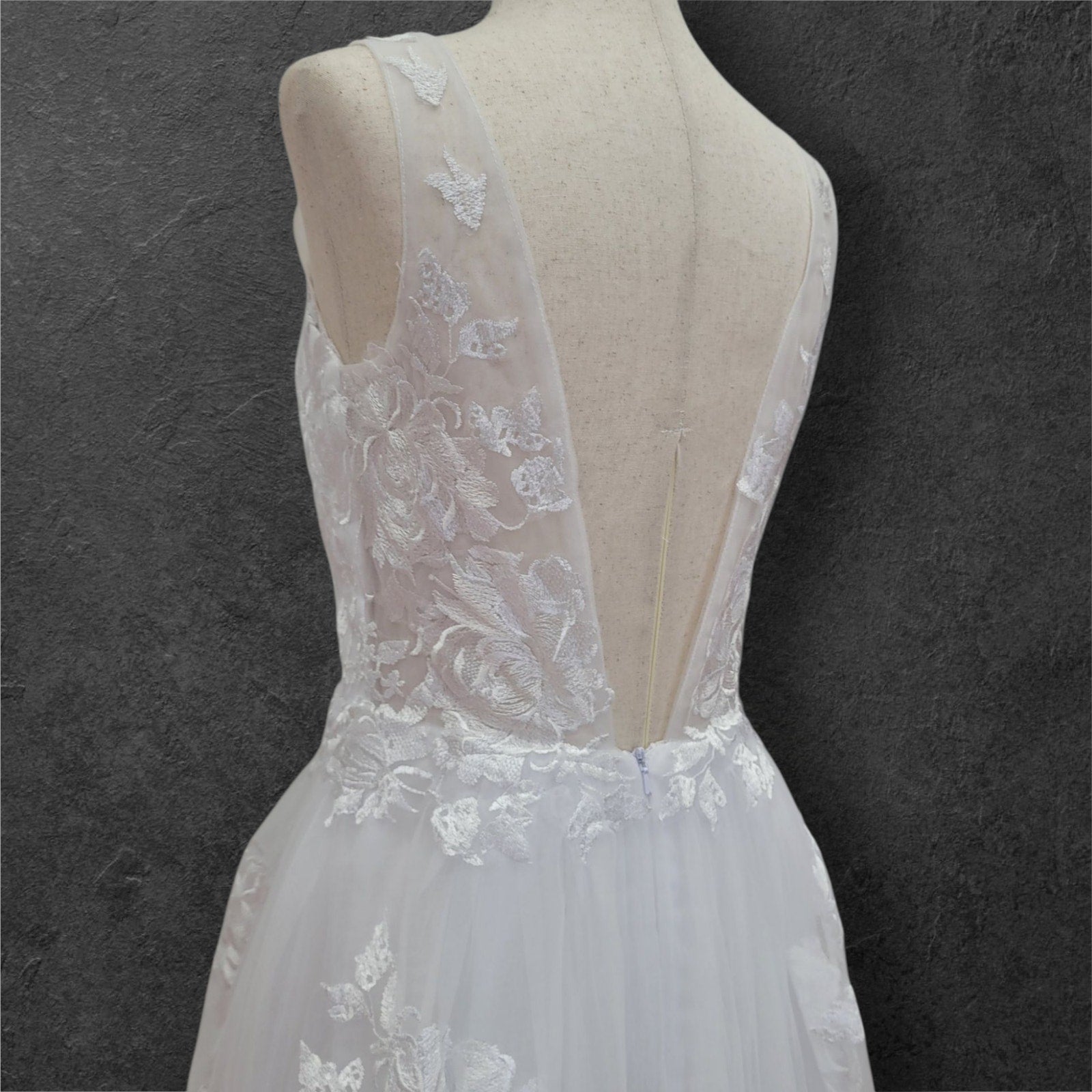 Exude timeless elegance in this sophisticated A-line wedding gown. The graceful silhouette features delicate embroidered appliques that cascade across the ethereal tulle skirt, creating a romantic visual texture. The alluring low v-back adds a touch of modern allure while maintaining the dress's classic charm—perfect for the bride who desires both traditional beauty and refined sensibility.