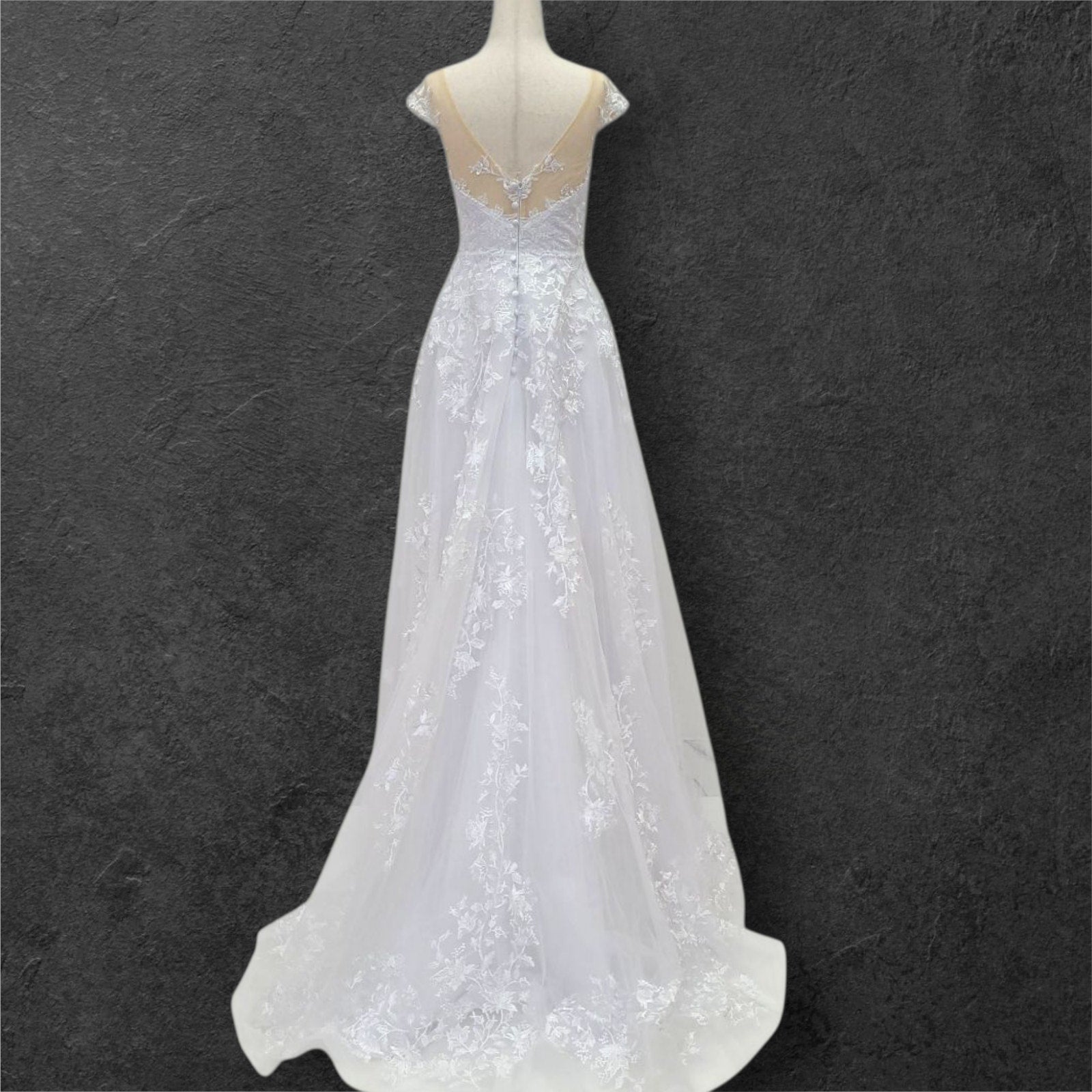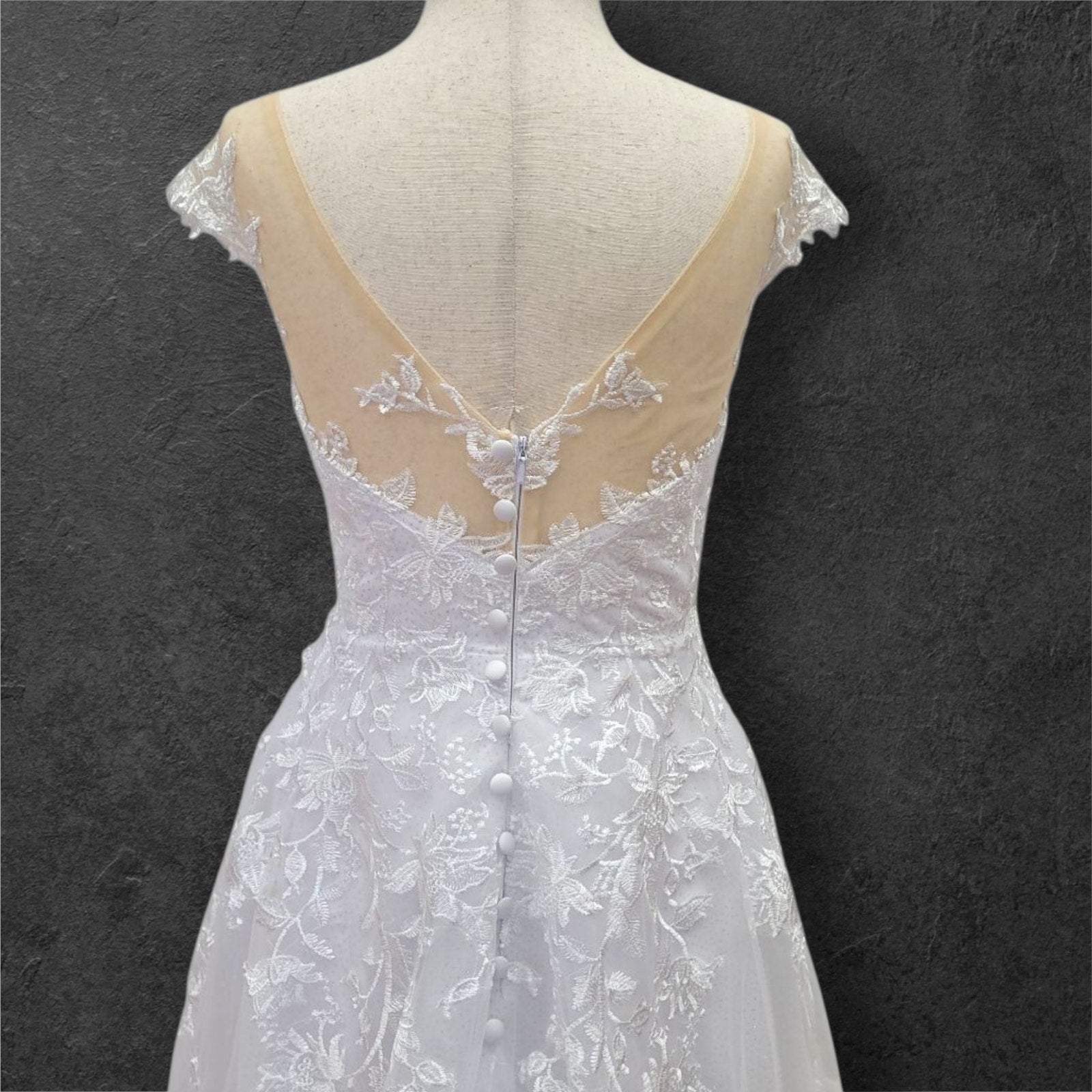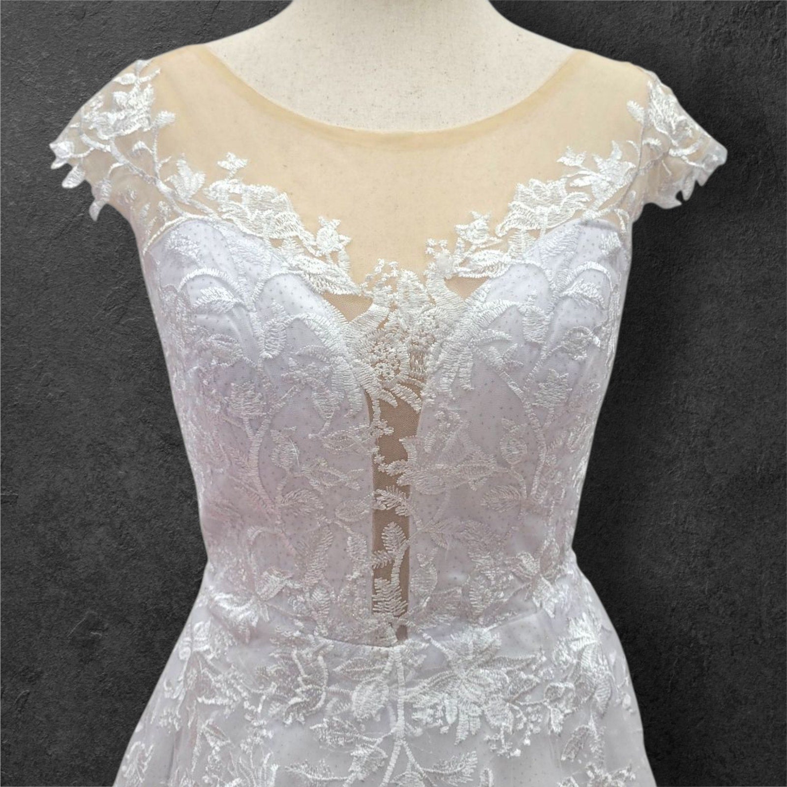 Exquisitely crafted with delicate cap sleeves, this wedding dress embodies timeless elegance. The intricate embroidery adorns the mesh lace bodice and sleeves, creating a captivating texture that catches the light with every movement. The sophisticated deep plunge V-neckline offers a flattering silhouette while maintaining an air of refined allure. A perfect balance of traditional craftsmanship and contemporary design for your most treasured occasion.