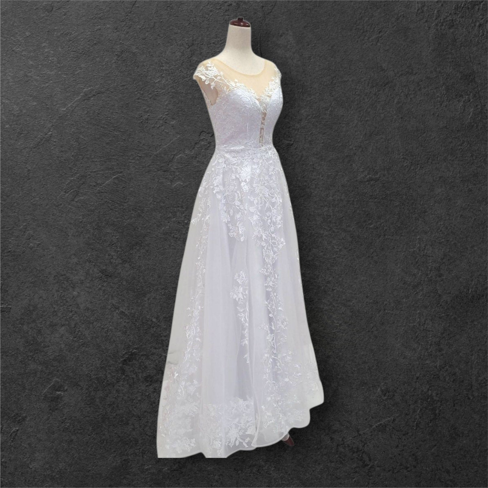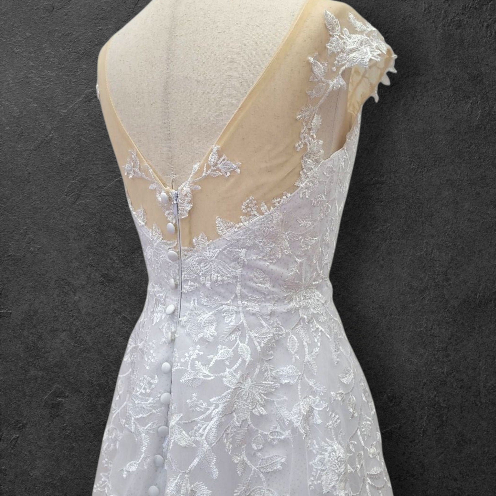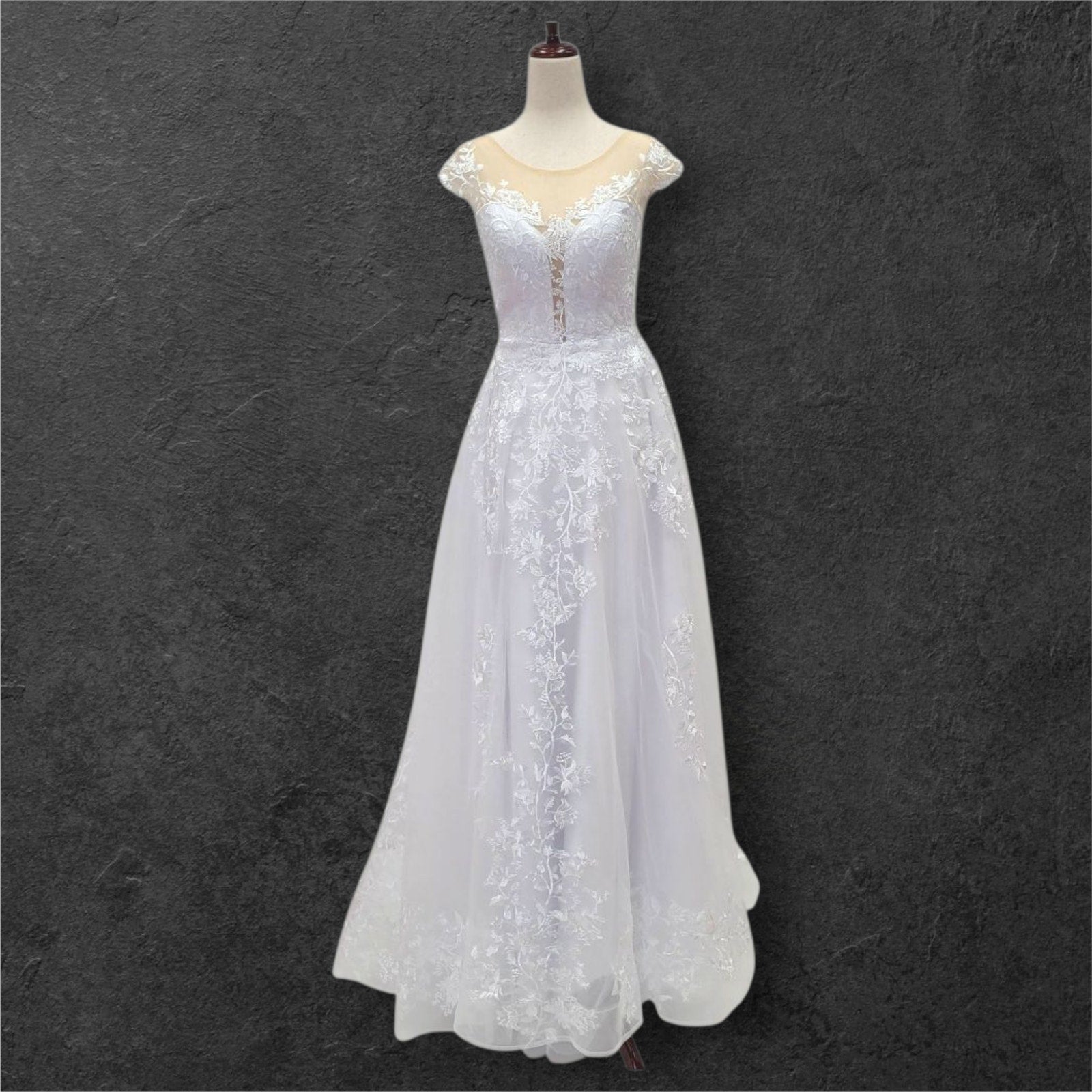 Exquisitely crafted with delicate cap sleeves, this wedding dress embodies timeless elegance. The intricate embroidery adorns the mesh lace bodice and sleeves, creating a captivating texture that catches the light with every movement. The sophisticated deep plunge V-neckline offers a flattering silhouette while maintaining an air of refined allure. A perfect balance of traditional craftsmanship and contemporary design for your most treasured occasion.