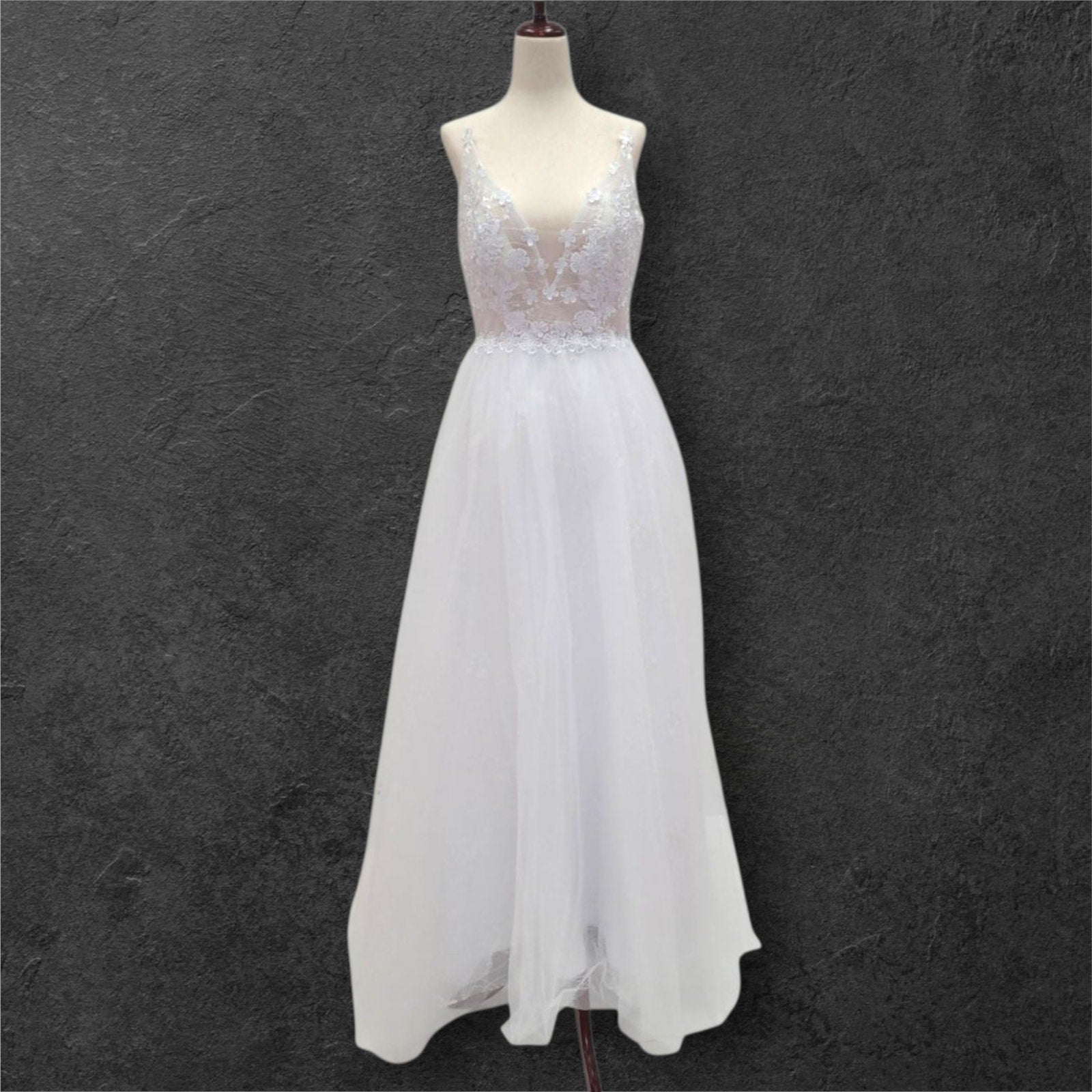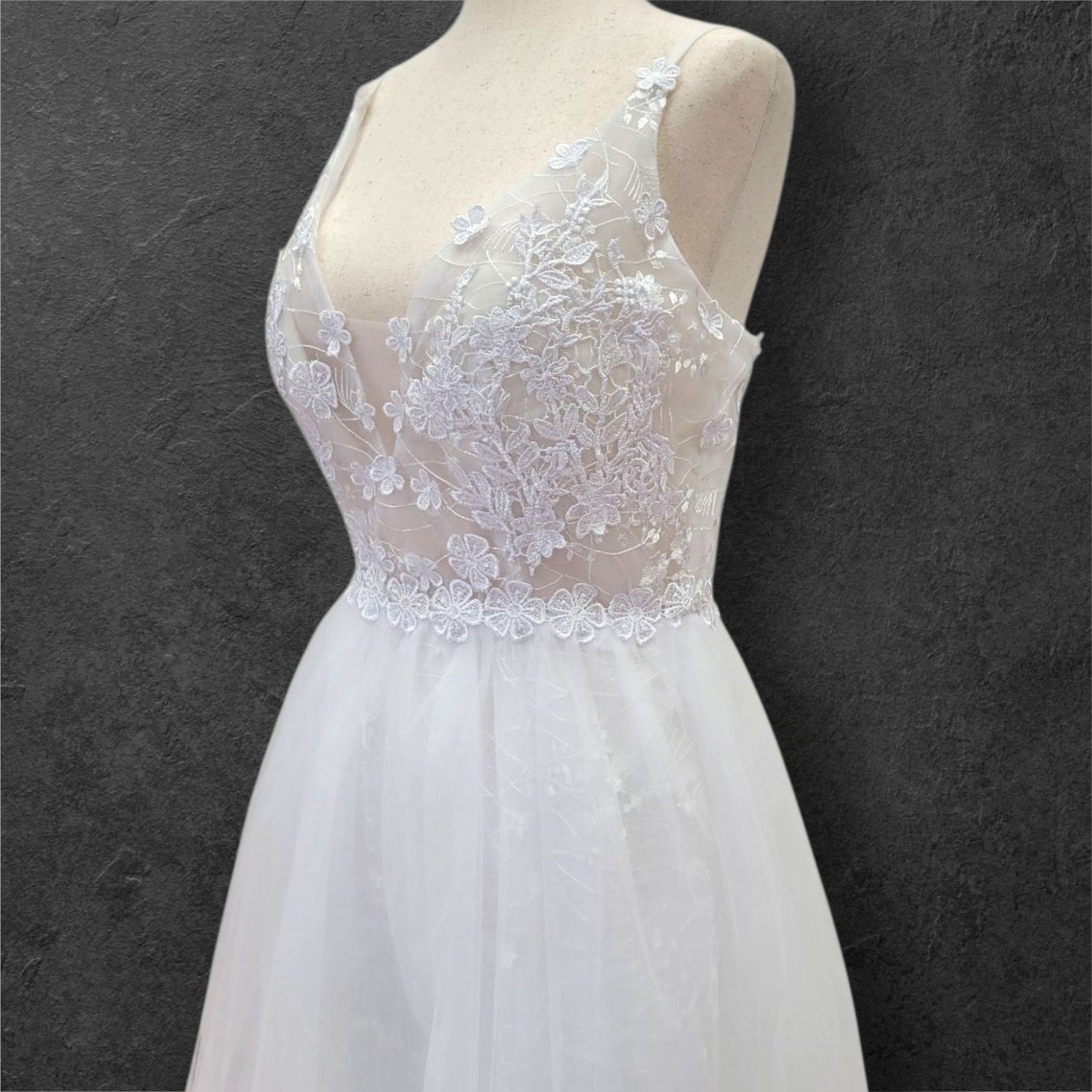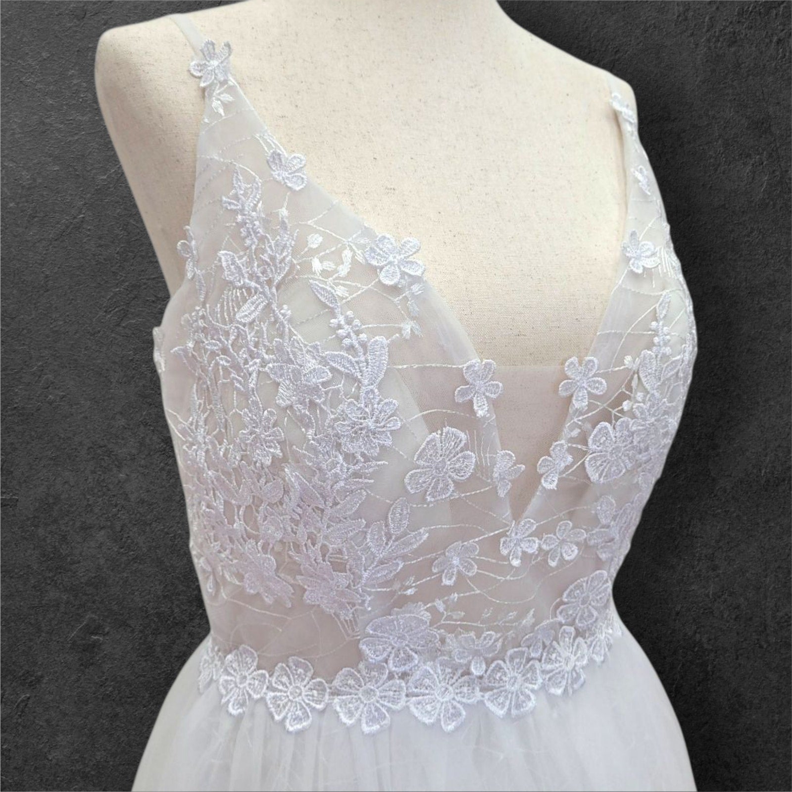 Elevate your bridal presence with this ethereal wedding gown featuring an exquisite floral-adorned bodice. The sophisticated deep V neckline is complemented by refined delicate straps, while the semi-transparent bodice creates an illusion of floating florals against the skin. This light, airy design embodies timeless elegance with a modern sensibility, perfect for the discerning bride.
