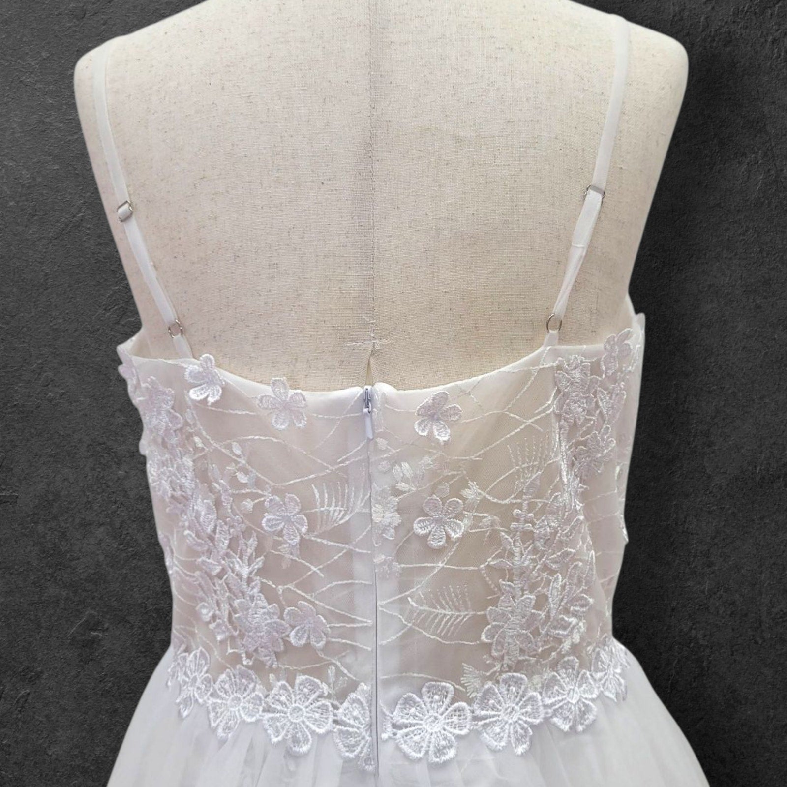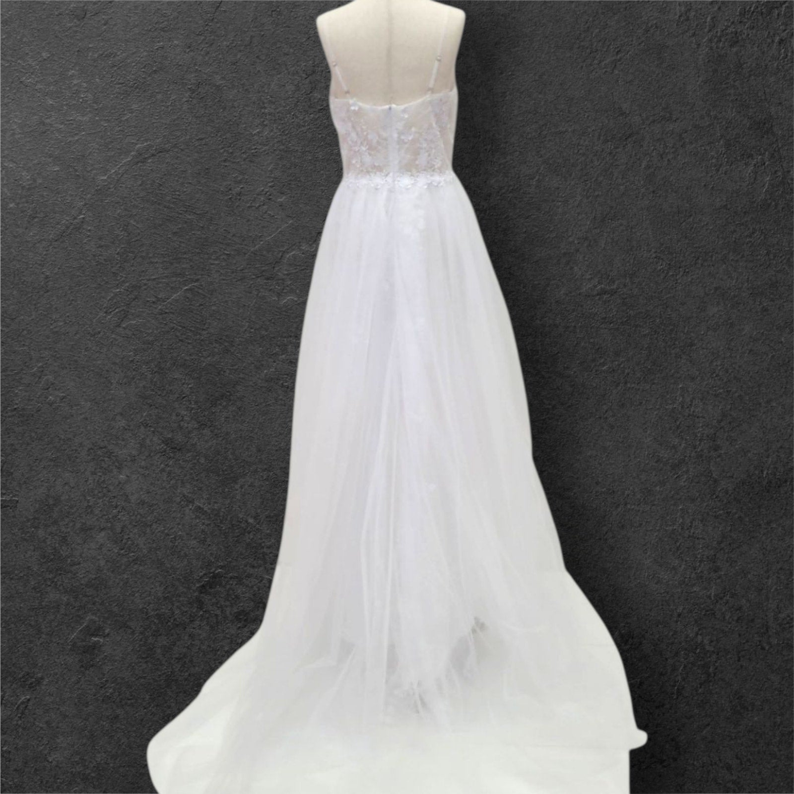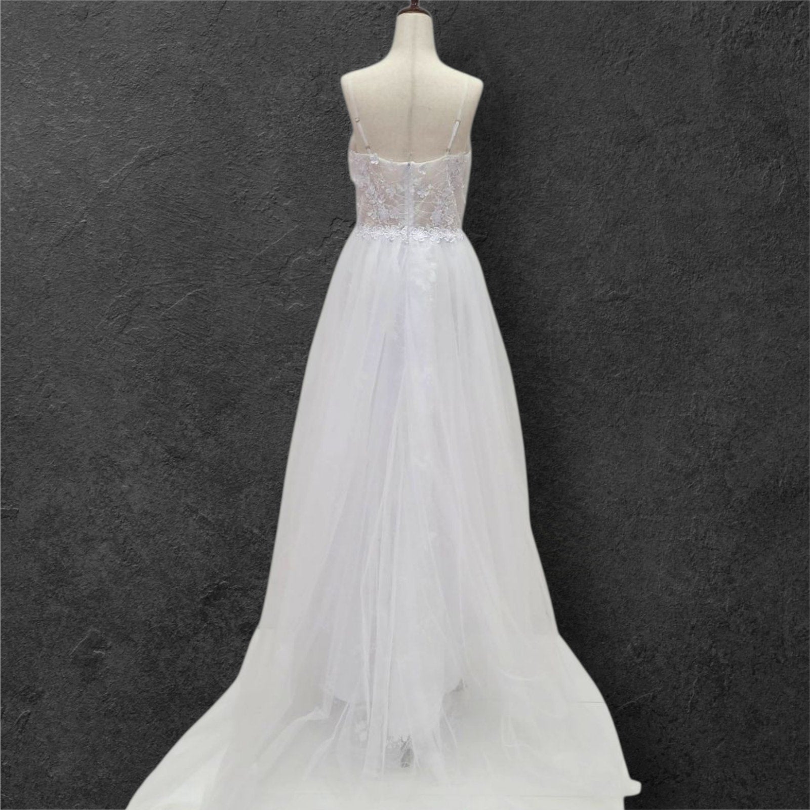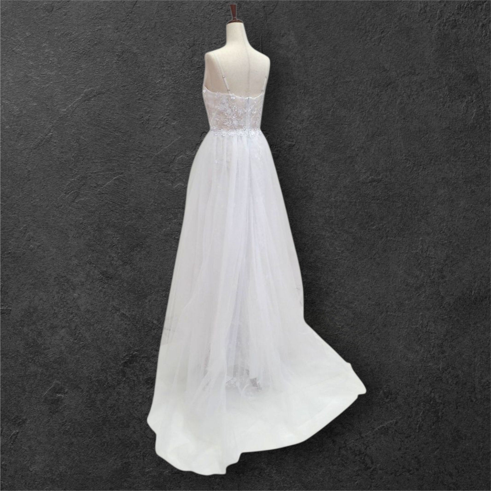 Elevate your bridal presence with this ethereal wedding gown featuring an exquisite floral-adorned bodice. The sophisticated deep V neckline is complemented by refined delicate straps, while the semi-transparent bodice creates an illusion of floating florals against the skin. This light, airy design embodies timeless elegance with a modern sensibility, perfect for the discerning bride.