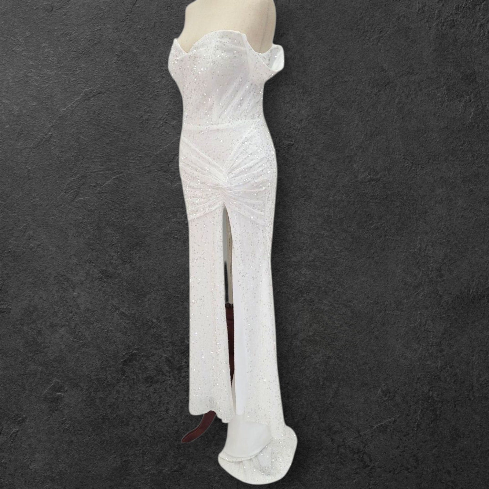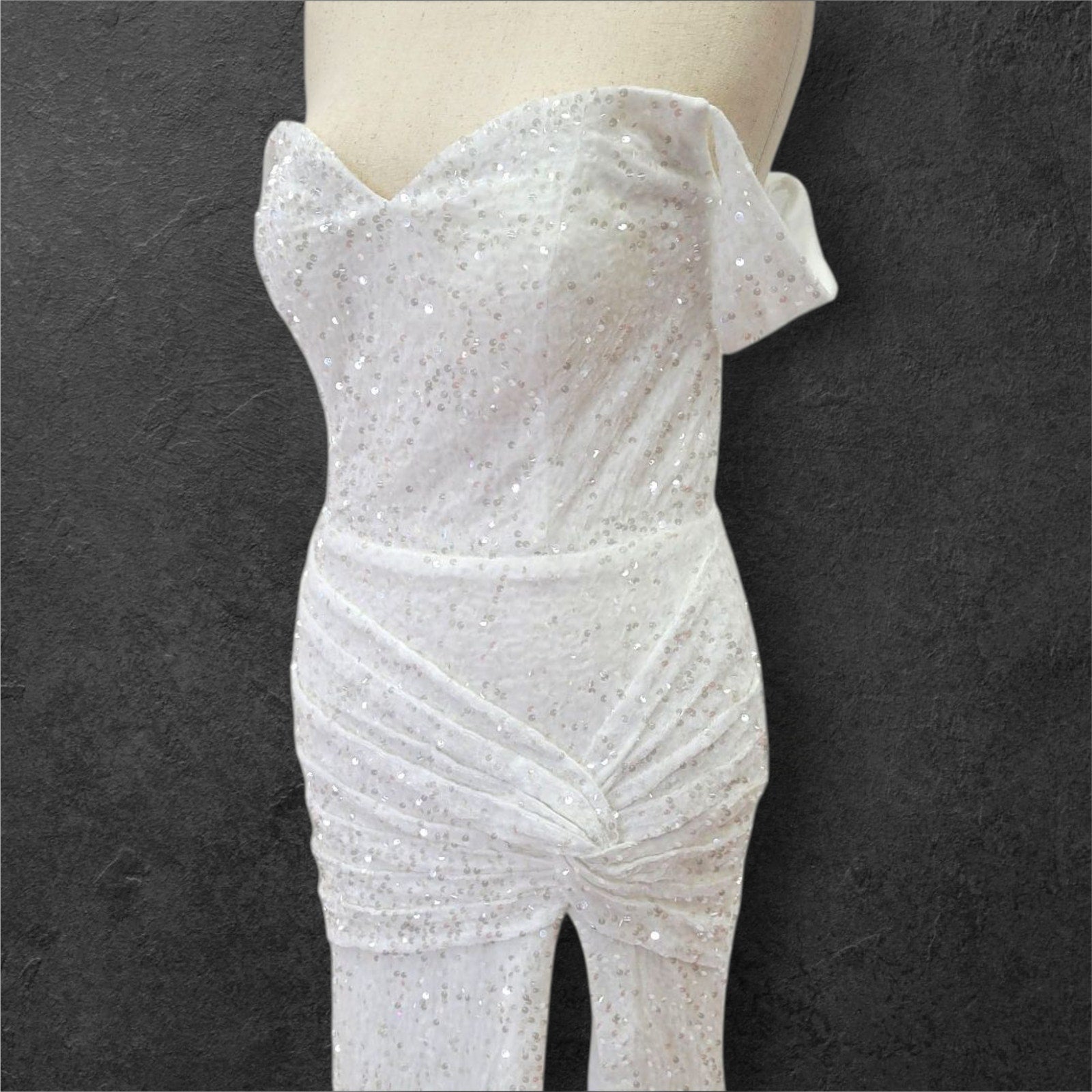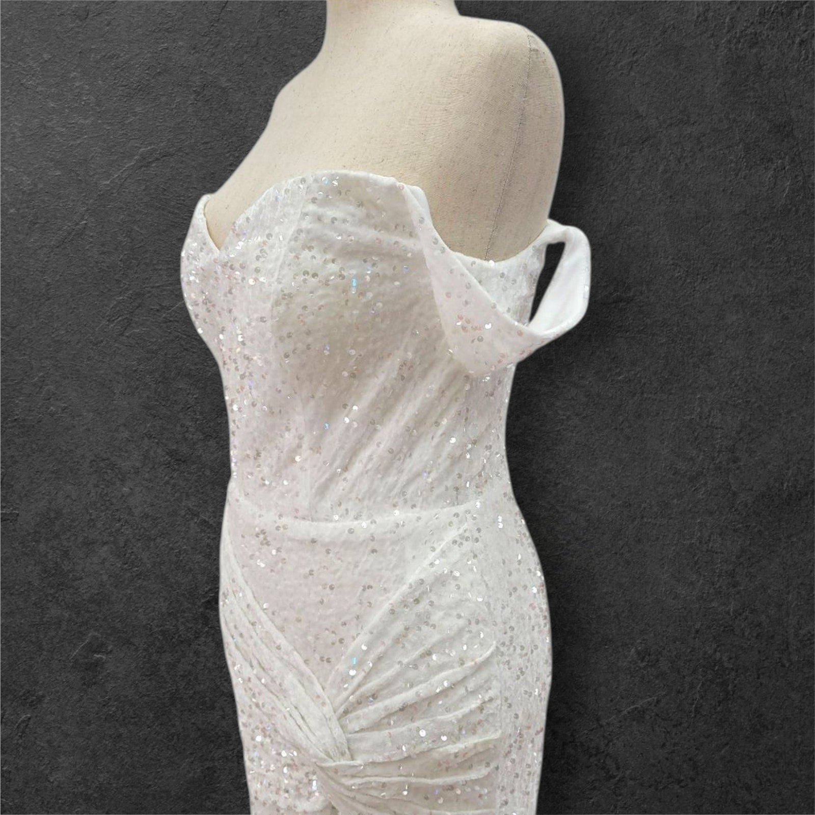 Embrace timeless elegance in this exquisitely crafted hip-hugging wedding gown. Adorned with luminous sequins that catch every ray of light, this sophisticated silhouette accentuates your curves while the off-shoulder sleeves add a touch of romantic allure. The corset back ensures a perfect, customized fit while creating a stunning silhouette that commands attention as you glide down the aisle.