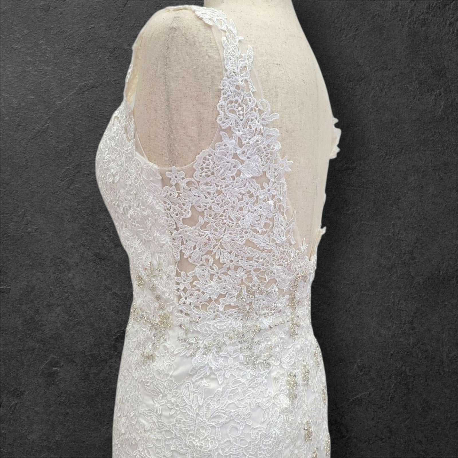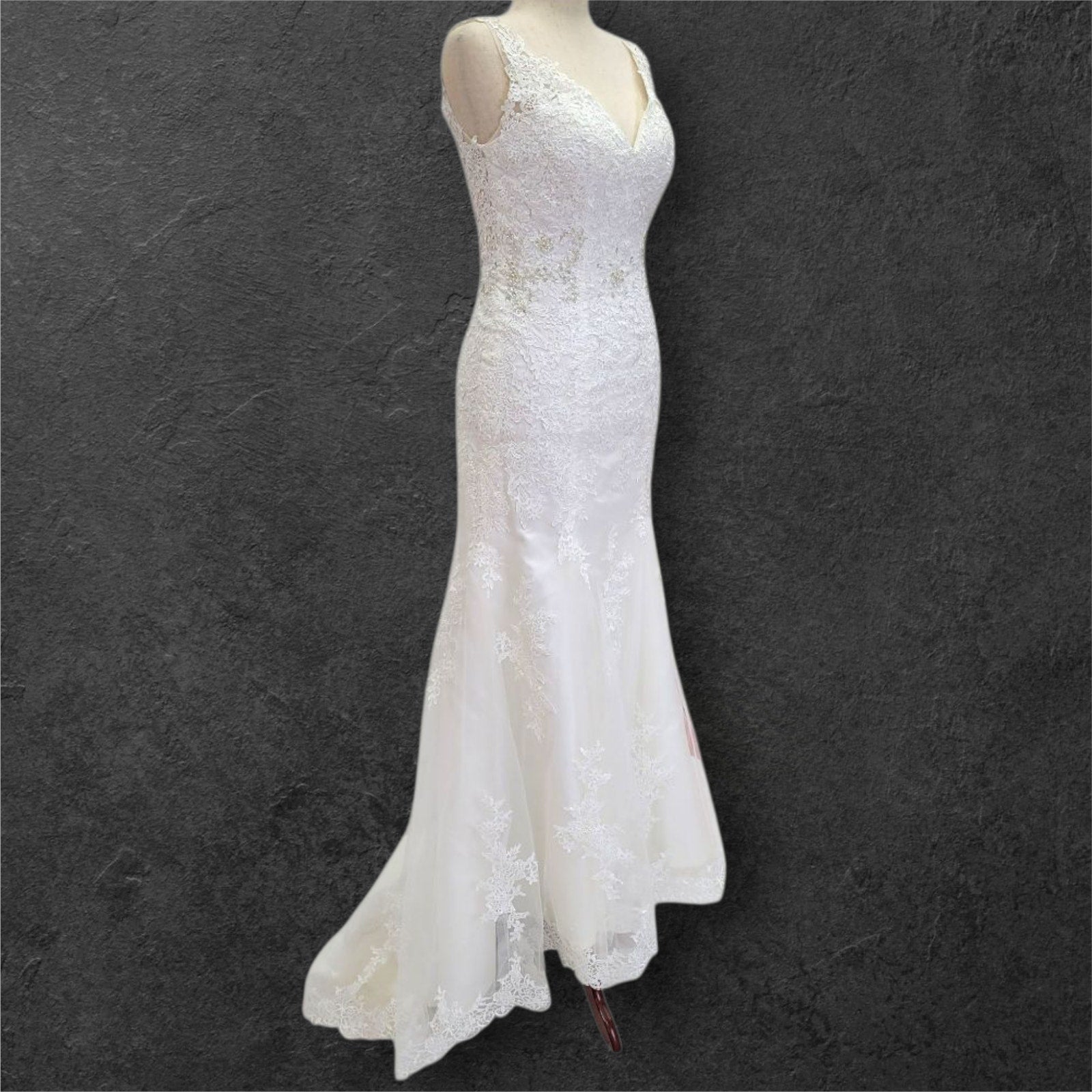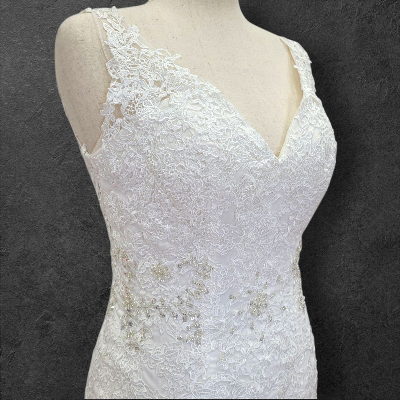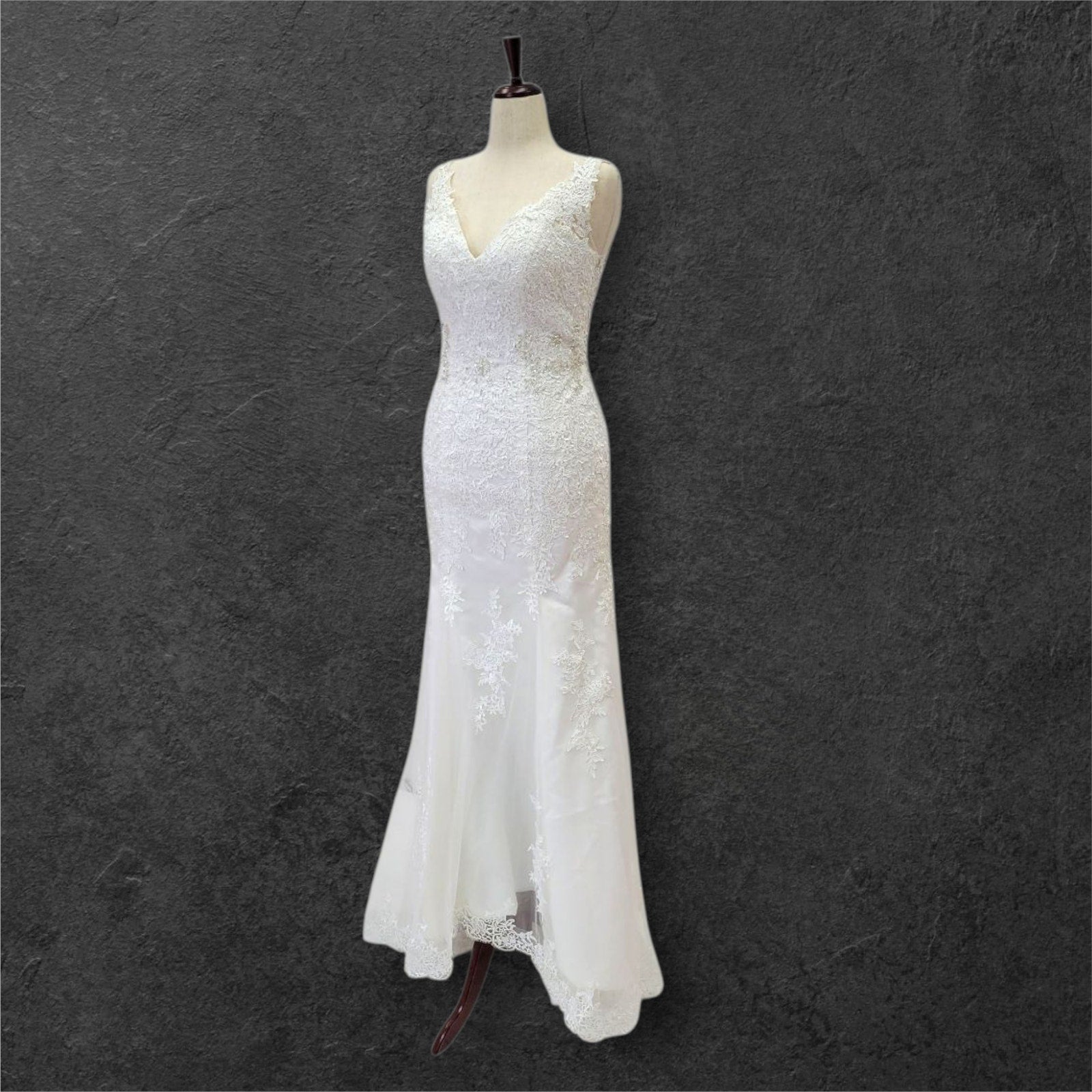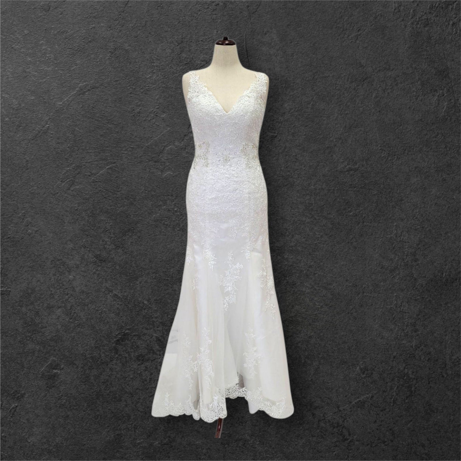 Exquisitely crafted for the discerning bride, this elegant fitted wedding gown sculpts your silhouette with refined precision. The dramatic low V-back creates an alluring focal point, while intricate embroidery adorns both the bodice and skirt, offering dimensional texture and timeless sophistication. A masterpiece of bridal couture that celebrates feminine contours with understated luxury.