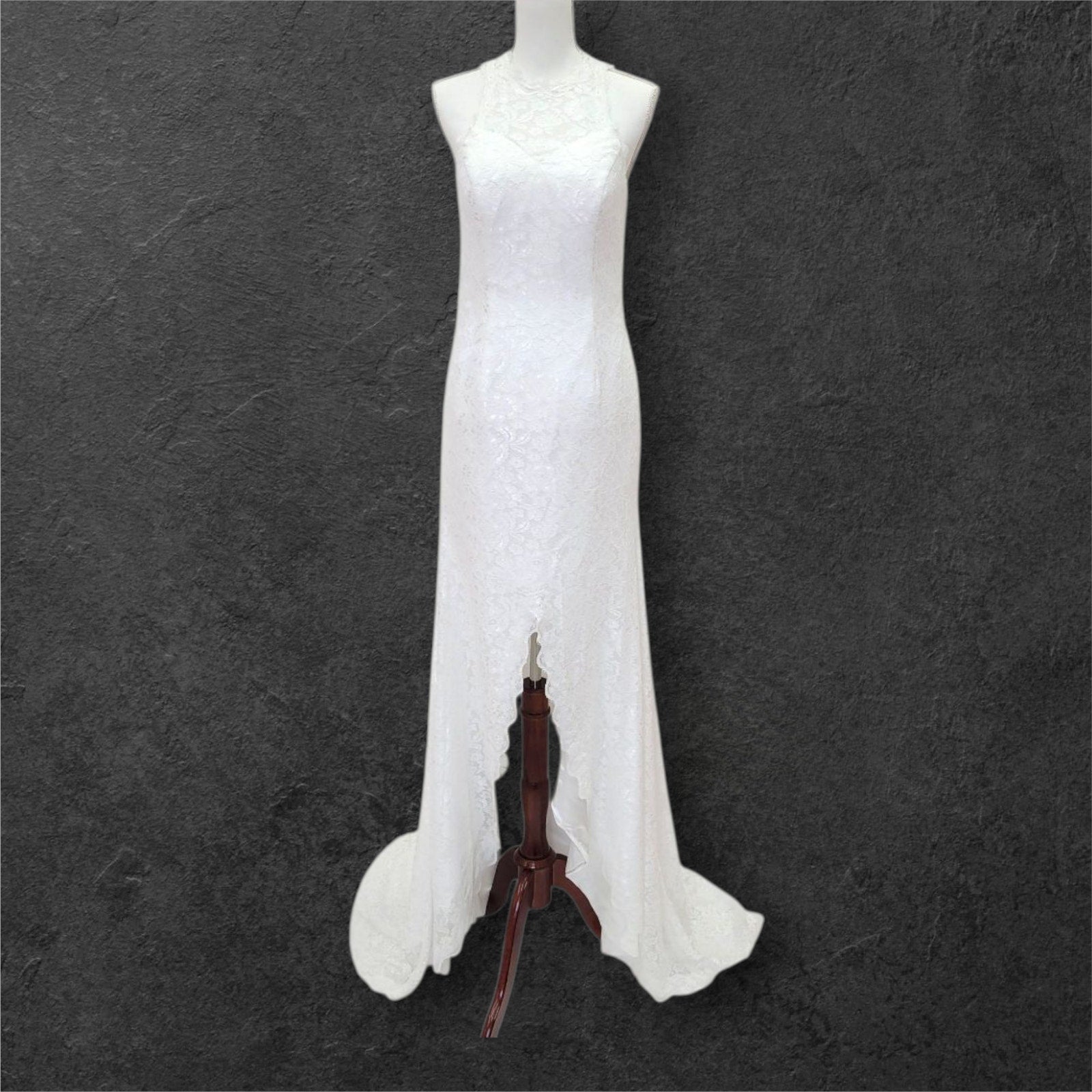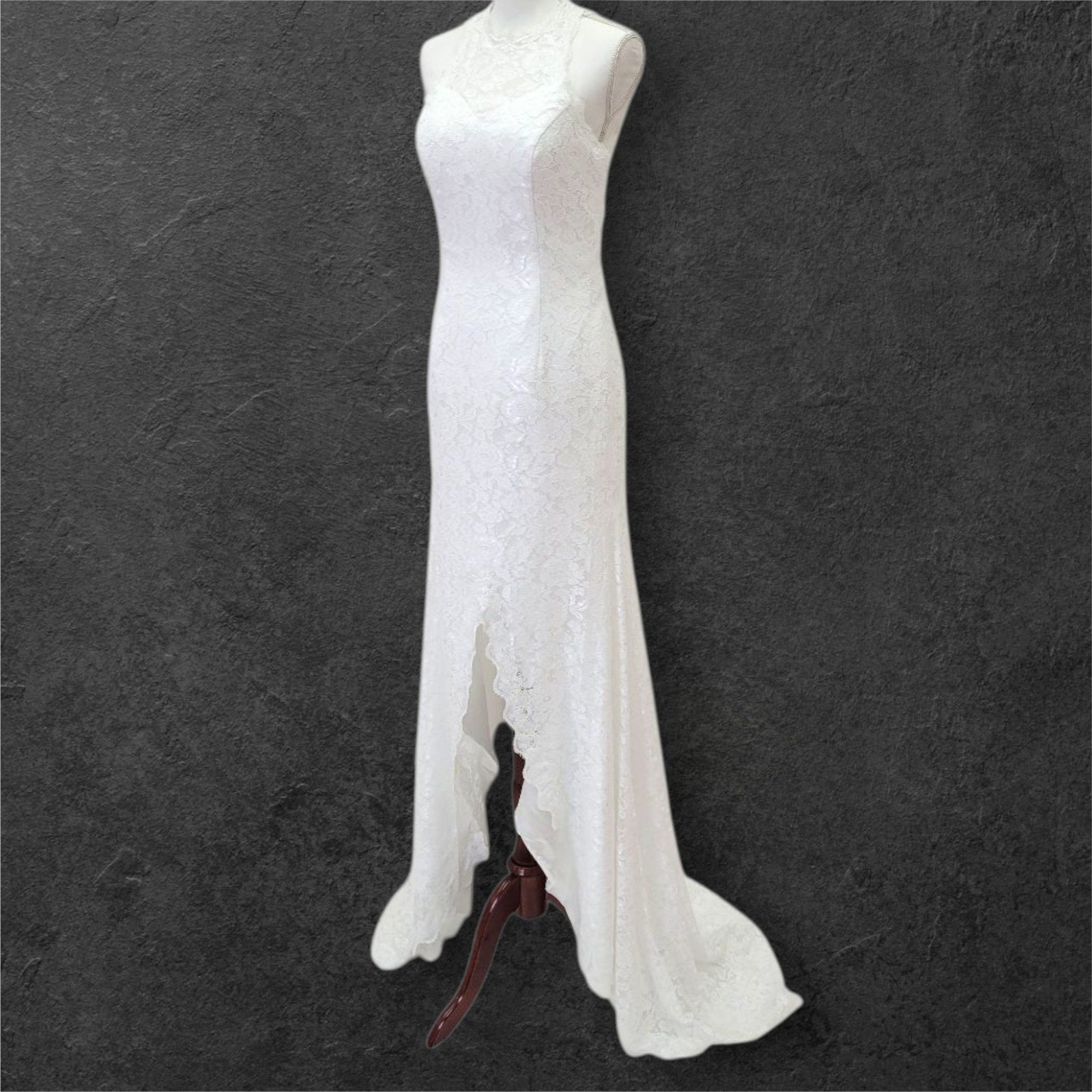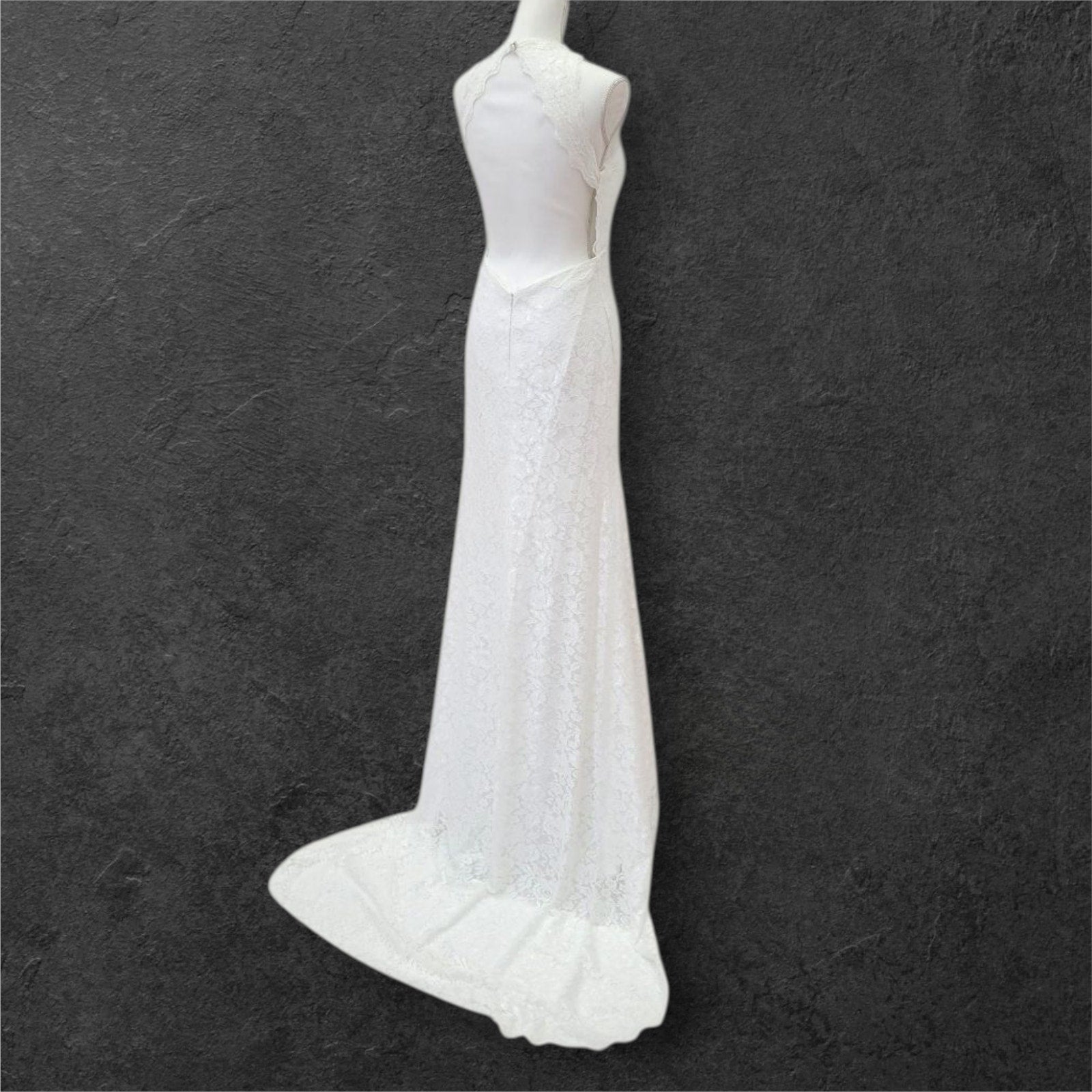 Exquisite lace detailing adorns this sophisticated wedding gown, featuring an elegant high neckline that transitions into a breathtaking open back. The refined silhouette offers the perfect balance of modesty and allure, making it an impeccable choice for destination weddings where timeless elegance meets contemporary design.