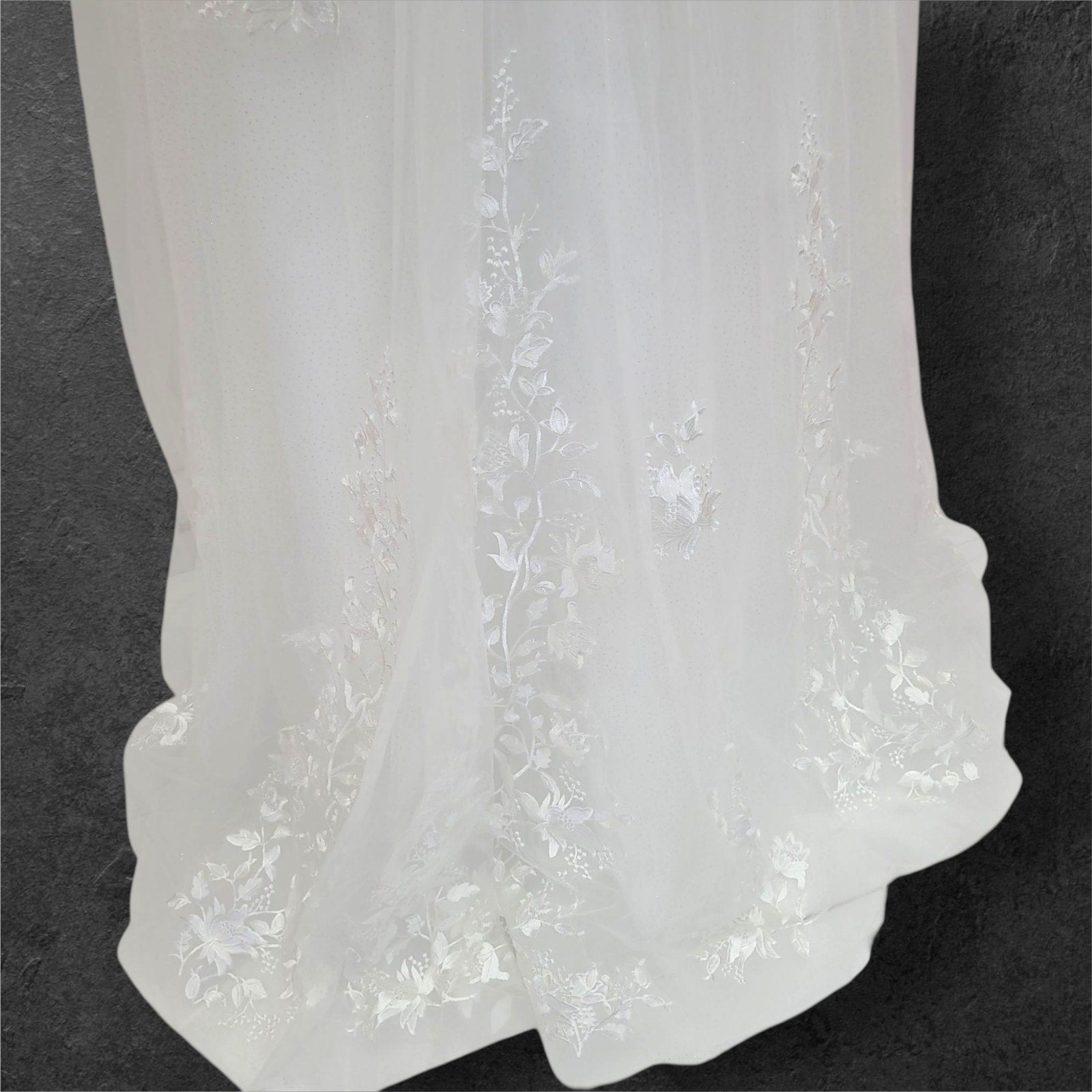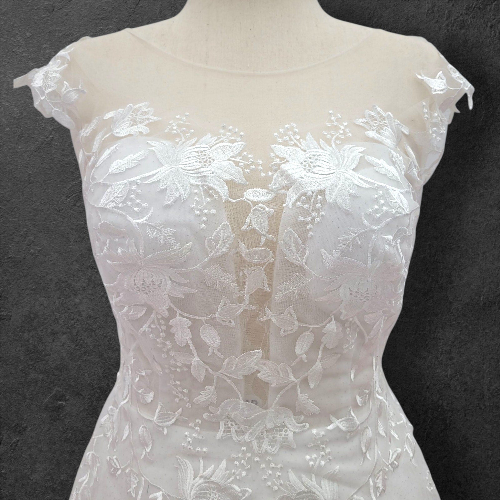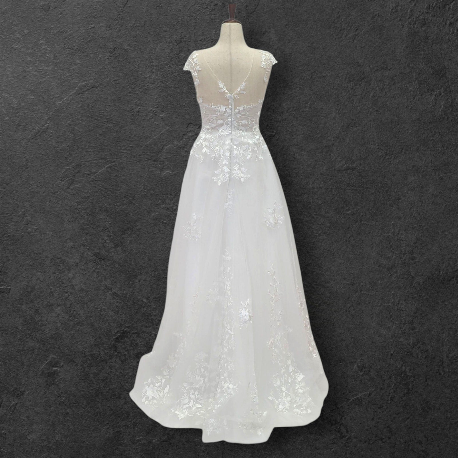 Elevate your bridal presence with this exquisite cap sleeve wedding gown. Delicate floral embroidery adorns the luminous sparkle fabric, creating a harmonious balance of timeless elegance and subtle glamour. The thoughtfully designed cap sleeves offer refined coverage while maintaining a graceful silhouette that captures the essence of sophisticated bridal couture.