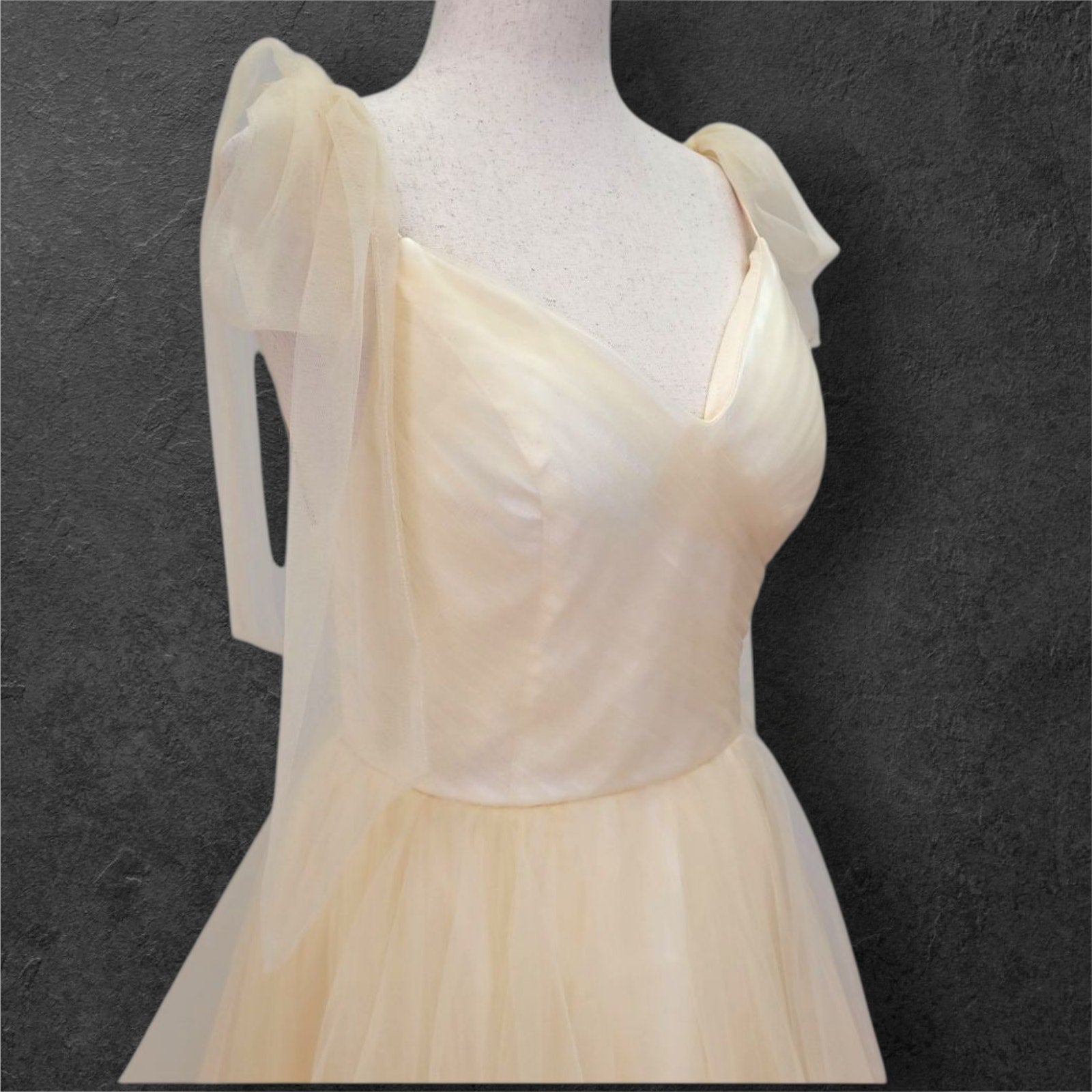 Indulge in timeless romance with this exquisite champagne tulle ballgown. Delicate bows adorn the shoulders, framing a sophisticated low back secured by an elegant corset structure. The multi-layered tulle skirt cascades gracefully to create ethereal movement and dimension, ensuring a captivating silhouette as you glide down the aisle. This refined creation balances classic bridal elegance with subtle contemporary charm.
