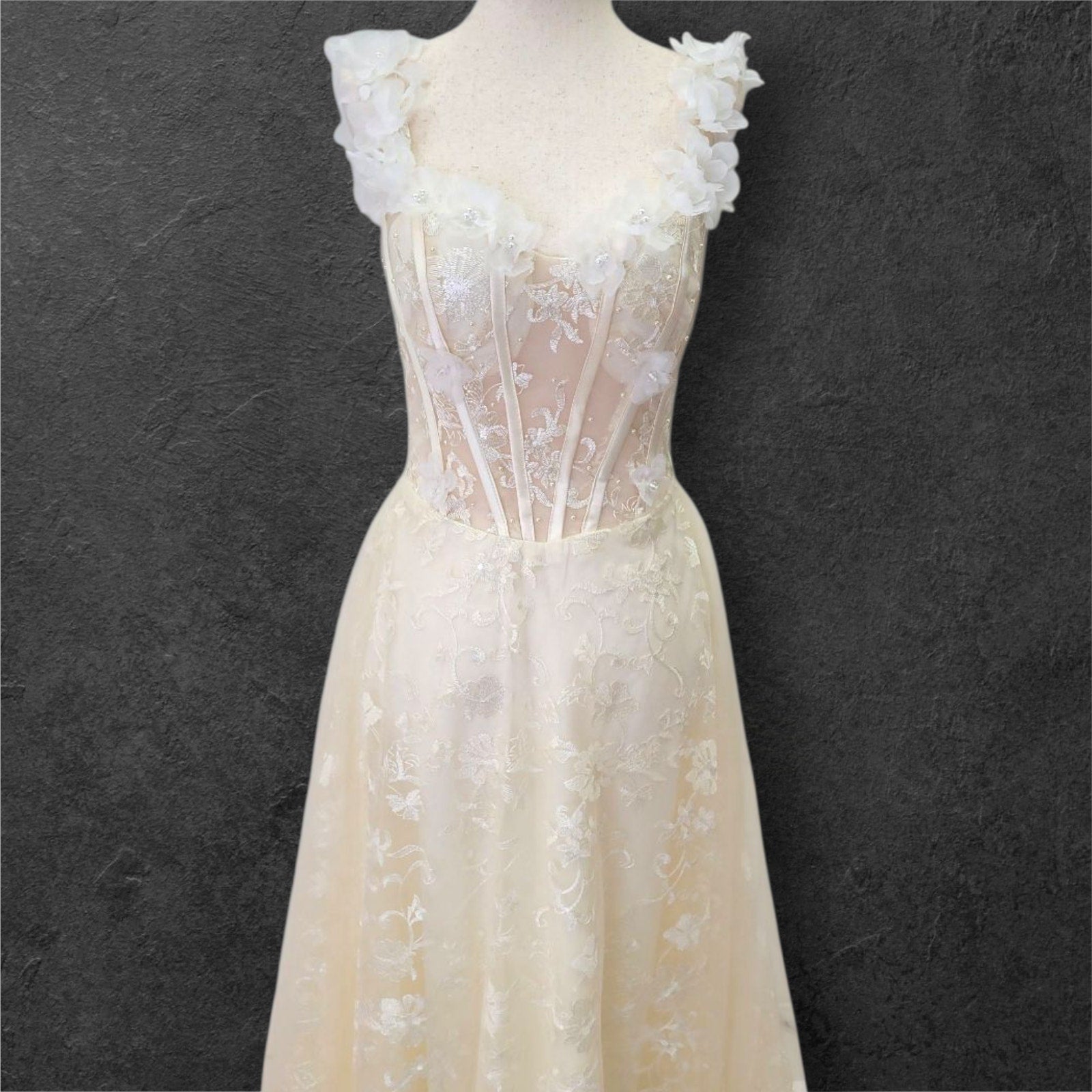 Champagne Floral Patterned Ballgown with White Flowers on Straps